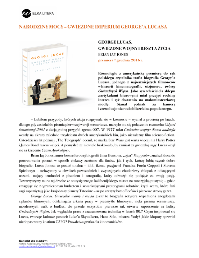 NARODZINY MOCY – GWIEZDNE IMPERIUM GEORGE’A LUCASA GEORGE LUCAS. GWIEZDNE WOJNY I RESZTA ŻYCIA BRIAN JAY JONES premiera 7 grudnia 2016 r. Równolegle z amerykańską premierą do rąk polskiego czytelnika trafia biografia George’a Lucasa, jednego z najważniejszych filmowców w historii kinematografii, wizjonera, twórcy Gwiezdnych Wojen. Jako syn właściciela sklepu z artykułami biurowymi miał przejąć rodziny interes i żyć dostatnio na małomiasteczkową modłę. Stanął jednak za kamerą i zrewolucjonizował oblicze kina popularnego. – Lubiłem przygody, których akcja rozgrywała się w kosmosie – wyznał z prostotą po latach, dlatego gdy zasiadał do pisania pierwszej wersji scenariusza, marzyło mu się połączenie rozmachu Odysei kosmicznej 2001 z akcją godną przygód agenta 007. W 1977 roku Gwiezdne wojny: Nowa nadzieja weszły na ekrany zaledwie trzydziestu dwóch amerykańskich kin, jako niezależny film science-fiction. Czterdzieści lat później „The Telegraph” ocenił, że marka Star Wars jest warta więcej niż Harry Potter i James Bond razem wzięci. A pomyśleć że niewiele brakowało, by zamiast za gwiezdną sagę Lucas wziął się za kręcenie Czasu Apokalipsy. Brian Jay Jones, autor bestsellerowej biografii Jima Hensona, „ojca” Muppetów, znalazł klucz do portretowania postaci w sposób ciekawy zarówno dla fanów, jak i tych, którzy lubią czytać dobre biografie. Lucas Jonesa to postać totalna – idol, ikona, przyjaciel Francisa Forda Coppoli i Stevena Spielberga – uchwycony w chwilach powszednich i zwyczajnych; chuderlawy chłopak z odstającymi uszami, mający trudności z pisaniem i ortografią, który odważył się podążyć za swoją pasją. Towarzyszymy mu w tej drodze ze stutysięcznego kalifornijskiego miasta na tunezyjską pustynię – gdzie zmagając się z ograniczonym budżetem i szwankującymi prototypami robotów, kręci sceny, które fani sagi zapamiętają jako krajobrazy planety Tatooine – aż po szczyty box office’ów i pierwsze strony gazet. George Lucas. Gwiezdne wojny i reszta życia to biografia reżysera wypełniona anegdotami z planów filmowych, odsłaniająca arkana pracy w przemyśle filmowym, męki pisania scenariuszy, morderczych walk o budżet, ale przede wszystkim pierwsze tak otwarte zaproszenie za kulisy Gwiezdnych Wojen. Jak wyglądała praca z zaawansowaną techniką w latach 80.? Czym inspirował się Lucas, tworząc kultowe postaci: Luke’a Skywalkera, Hana Solo, mistrza Yody? Jakie kłopoty sprawiał niedopasowany kostium C3PO? Prawdziwa gratka dla kinomaniaków. Kontakt dla mediów: Natalia Radzikowska, Wydawnictwo Wielka Litera [email protected], 22 252 59 25, 664 173 919 George Lucas. Gwiezdne wojny i reszta życia to wyśmienita książka! Brianowi Jay Jonesowi udała się rzadka sztuka napisania takiej biografii, która będzie interesująca nie tylko dla najwierniejszych fanów, ale i dla pozostałych czytelników. Naszpikowana ciekawostkami, wsparta rzetelnym materiałem źródłowym, ubrana w lekką i wartką narrację, z łatwością wciąga w świat Lucasa. ― Debby Applegate, laureatka nagrody Pulitzera w 2007 za książkę The Most Famous Man in America: The Biography of Henry Ward Beecher Jak słynna scena otwierająca pierwsze Gwiezdne wojny, George Lucas. Gwiezdne wojny i reszta życia natychmiast przenosi w świat szalonego marzyciela. Nerdzi wszystkich krajów łączcie się! Wreszcie mamy książkę, która opowiada historię herosa, który naprawdę zmienił nasze życie. ― Brad Meltzer Świetnie napisana i wciągająca: dokładnie taka, na jaką czekali fani Lucasa i wszyscy maniacy, którzy uwielbiają opowieści z planów filmowych. ― Kirkus Mistrz biografii mierzy się z kolejną wielką osobowością świata rozrywki. Znamy George’a Lucasa jako reżysera, który dał nam Gwiezdne wojny, jedną z najbardziej kultowych hollywoodzkich superprodukcji w historii, ale pogłębione, fascynujące i wciągające spojrzenie Jonesa ukazuje Lucasa jako kogoś więcej niż tylko uzdolnionego twórcę ciekawych opowieści. Jones sięga głębiej, by naświetlić blaski i cienie kariery i życia Lucasa, portretując jego pasję i nowatorstwo w przejrzystej, porywającej prozie. Mistrzowska i niezbędna lektura dla każdego fana filmu i popkultury. ― Booklist W detalach opisuje proces powstawania jego filmów: od pierwszych pomysłów i szkicu scenariusza, przez kompletowanie obsady i wybór lokalizacji planu, po kręcenie i, co szczególnie istotne w pracy Lucasa, montaż. ― Publishers Weekly Brian Jay Jones urodził się 1 sierpnia 1967 r. Jest wiceprezesem Międzynarodowej Organizacji Biografów. Pracował jako analityk ustaw i doradca w amerykańskim senacie, ale w 2008 roku zdecydował się porzucić politykę dla pisarstwa: wtedy ukazała się jego nagradzana biografia Washington Irving. W Polsce wydano jak dotąd jedną jego książkę: Jim Henson. Tata Muppetów. Mieszka z żoną i córką w Damascus w stanie Maryland. Kontakt dla mediów: Natalia Radzikowska, Wydawnictwo Wielka Litera [email protected], 22 252 59 25, 664 173 919