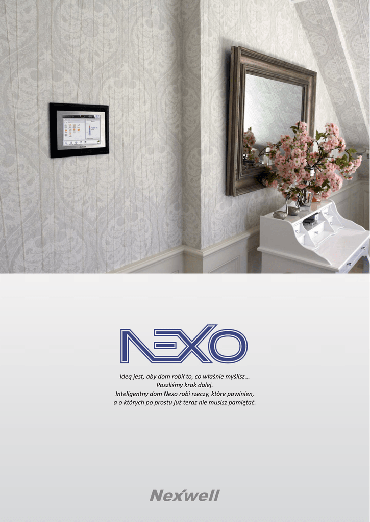 Ideą jest, aby dom robił to, co właśnie myślisz... Poszliśmy krok dalej. Inteligentny dom Nexo robi rzeczy, które powinien, a o których po prostu już teraz nie musisz pamiętać. Oddajemy do Państwa rąk katalog najnowszych propozycji produktowych firmy Nexwell Engineering. Przygotowana oferta jest rezultatem wielu lat prac inżynieryjnych i kilku lat doświadczeń podczas praktycznych realizacji systemu Nexo w kilkuset inwestycjach na terenie całego kraju i niektórych krajach wspólnoty europejskiej. NEXWELL Firma Nexwell jest twórcą i producentem systemu Nexo, zarządzającego funkcjami Inteligentnego Domu. Charakteryzuje nas indywidualne podejście do klienta oraz pełen profesjonalizm wynikający z kwalifikacji oraz doświadczenia. Dla nas najważniejszy jest Twój komfort. Naszym celem jest projektowanie nowych oraz doskonalenie istniejących technologii elektronicznych. Dzięki nowoczesnym laboratoriom produkcyjnym i badawczym, pasji i zaangażowaniu wdrażamy najnowsze technologie do Twojego życia. Nasza firma działa na rynku od 8 lat. Od tego momentu stale rozwijany produkt zdobywa uznanie coraz szerszego grona odbiorców. Tworzona jest przez pełnych pasji profesjonalistów posiadających doświadczenie zarówno praktyczne, jak i teoretyczne. Od początku istnienia Nexwell mieliśmy możliwość współpracować zarówno z dużymi firmami budowlanymi, firmami instalacyjnymi, deweloperami jak również klientami indywidualnymi. Z naszego systemu korzysta m.in. stacja ratownictwa przy KGHM. Nasze doświadczenie popiera również wiedza praktyczna zdobyta podczas realizacji wielu instalacji systemu oraz szkoleń prowadzonych na terenie całego kraju. Ważnym elementem strategii rozwojowych produktów są konsultacje ze specjalistami firm wdrażających rozwiązania automatyki domowej. Wymiana spostrzeżeń ma charakter ciągły, od etapu kreacji pomysłu do efektu wraz z rozwojem produktu już po jego wprowadzeniu do oferty. Dzięki inwencji firmy Nexwell i wsłuchaniu się jej inżynierów w potrzeby klientów powstają produkty, które posiadają unikalne cechy i funkcje wraz z typowymi dla takich instalacji zastosowaniami. Poprzez zastosowanie autorskiej koncepcji automatyki i sterowania urządzeniami domowymi nasz system łącząc poszczególne funkcjonalności przyczynia się do znaczącego ograniczenia energii potrzebnej do sterowania różnymi urządzeniami domowymi. Oszczędność wynikającą z naszych kilkuset realizacji systemu możemy oszacować na blisko 9320 KW. System alarmowy chroni ok. 68 tys. metrów kwadratowych powierzchni mieszkalnej w domach naszych klientów. Dzięki stałemu i intensywnemu podążaniu za trendami oraz potrzebami rynku staramy się modernizować i poszerzać możliwości techniczne naszych produktów. Firma Nexwell gwarantuje pełną obsługę wdrożonych i dostarczonych rozwiązań w zakresie wsparcia technicznego, okresu gwarancyjnego dla urządzeń naszej produkcji, serwisu oraz szkoleń. Naszym priorytetem jest tworzenie pozytywnych relacji zarówno z naszymi dotychczasowymi klientami jak i zdobywanie zaufania potencjalnych nowych odbiorców naszego produktu. index Interfejsy użytkownika - manipulatory 04 oprogramowanie 10 System alarmowy 12 Centrale Nexo 14 Karty rozszerzeń DIN 16 U r z ą d z e n i a TUKAN XT D I N 18 U r z ą d z e n i a TUKAN D I N 22 U r z ą d z e n i a TUKAN d o p u s z k o w e 24 Akcesoria 26 schemat rozdzielni nexo 27 Projektując nasze urządzenia myślimy o tym, aby system automatyki Nexo łączył w domu nie tylko urządzenia, ale również idee bezpieczeństwa, oszczędności, wygody i nowoczesności. Połączenie takie jest miarą stałych korzyści dla przyszłości domu i jego mieszkańców. ↑ ↑ Interfejsy użytkownika Wielozadaniowy, rozbudowany interfejs systemu Nexo manipulatory Panel dotykowy LCD (obudowa podtynkowa, ramka szklana) NXW102.3 Kod: • • • • programator systemu interfejs administratora | interfejs serwisanta (instalatora) | interfejs użytkownika urządzenie odbiorcze wideodomofonu (wizja + audio) przeglądarka historii rejestrów systemu • • • naścienny notatnik, zegarek, kalendarz automatyczna aktualizacja ustawień systemu możliwość zdalnej aktualizacji oprogramowania Podstawowe funkcje: Jedną z najważniejszych idei systemów inteligentnego domu jest możliwie szeroka automatyzacja i optymalizacja pracy najważniejszych dla domu urządzeń. Jednak równie ważna dla użytkownika systemu jest możliwość wygodnego sterowania tymi urządzeniami z różnych miejsc domu, realizowanie przygotowanych na odpowiednie okazje scenariuszy, czy wyłączanie wybranych obwodów elektrycznych. Możliwości jest dużo, a wygoda manipulowania tymi opcjami podnosi komfort, oszczędza czas, energię i pieniądze. Dodatkowe funkcje: panel dotykowy lcd | NXW102.3 Wyświetlacz: [Obudowa podtynkowa, ramka szklana] 8,4” (rozdzielczość 800x600), 18-bitowa głębia koloru 2 Wejścia wideo: 1 Wejścia audio: Tak Głośnik: Złącza: Gesty: Katalog ikonek: Komunikacja: Zasilanie: Moc: Wymiary (szer./wys./gr. [mm]): Montaż: Puszka inst.: Ramka: • • złącze wielofunkcyjne pojedyncze złącze komunikacyjne (zasięg 100m) 32 3 zestawy Magistrala terminali 12-28VDC 10W 270 / 220 / 65 Podtynkowy Aluminiowa; w kpl. Szkło + stal nierdzewna Kolor ramki: Czarny - wersja podstawowa; inny kolor szkła - dopłata: 100zł (netto) Gwarancja: 24 miesiące Panel Dotykowy LCD 8,4’’ (NXW102.3) stanowi główny interfejs pomiędzy Użytkownikiem, a systemem inteligentnego domu Nexo. Za jego pośrednictwem możliwa jest pełna konfiguracja oraz obsługa systemu pozwalająca na praktycznie całkowitą kontrolę obiektu, w którym jest zainstalowany. Z poziomu NXW102.3 można więc programować automatykę, zmieniać harmonogram pracy, uzbrajać i rozbrajać system alarmowy, regulować temperaturę w pomieszczeniach, sterować wentylacją, klimatyzacją, oświetleniem • wszystki