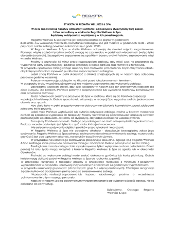 ETYKIETA W REGATTA WELLNESS & SPA W celu zapewnienia Państwu atmosfery komfortu i odpoczynku stworzyliśmy listę zasad, które zebraliśmy w etykiecie Regatta Wellness & Spa. Będziemy wdzięczni za współpracę w ich przestrzeganiu. Regatta Wellness & Spa czynne jest od poniedziałku do piątku w godzinach: 8.00-22.00, a w weekendy 9.00-22.00. Korzystanie z zabiegów spa jest możliwe w godzinach 10.00 – 22.00, przy czym ostatni zabieg powinien zakończyć się o godz. 22.00. W Regatta Wellness & Spa w strefie Wellness odbywają się również zajęcia zorganizowane. Planując wizytę z dziećmi prosimy zwrócić uwagę na czas relaksu w godzinach wieczornych (wstęp tylko dla osób dorosłych). Szczegółowe zapoznanie się z grafikiem basenu ułatwi Państwu zaplanowanie wizyt w strefie Wellness. Prosimy o przybycie 15 minut przed rozpoczęciem zabiegu, aby mieć czas na przebranie się, wypełnienie karty konsultacyjnej i podanie informacji o stanie zdrowia oraz rozmowę z terapeutą. W przypadku spóźnienia zabieg zostaje skrócony bez możliwości przedłużenia, bądź otrzymania rabatu, aby kolejnym Gościom zapewnić punktualne rozpoczęcie ich zabiegów. Jeżeli chcą Państwo w pełni skorzystać z atrakcji znajdujących się w naszym Spa, zalecamy przybycie godzinę wcześniej. Polecamy rezerwację zabiegów na kilka dni przed ich planowanych terminem. W przypadku braku wcześniejszej rezerwacji nie możemy zagwarantować wykonania zabiegu. Dokładamy wszelkich starań, aby czas spędzony w naszym Spa był prawdziwym relaksem dla ciała i umysłu. Dla komfortu Państwa prosimy o nieprzynoszenie lub wyciszenie telefonów komórkowych oraz przyciszone rozmowy. Gości hotelowych prosimy o przybycie do Spa w szlafroku, które są do Państwa dyspozycji w pokojach hotelowych. Goście spoza hotelu otrzymają w recepcji Spa wygodny szlafrok, jednorazowe obuwie oraz ręcznik. Aby ciało było w pełni przygotowane na dobroczynne działanie kosmetyków, przed zabiegami zalecamy krótki prysznic. Jeżeli mają Państwo wątpliwości lub pytania dotyczące zabiegu, można w każdym momencie zwrócić się z prośbą o wyjaśnienie do terapeuty. Prosimy nie wahać się poinformować terapeutę o swoich preferencjach lub obawach. Jesteśmy do dyspozycji, aby odpowiedzieć na wszelkie pytania. Szanujemy Państwa intymność. Dlatego przy zabiegach na ciało oferujemy bieliznę jednorazową. Podczas masażu odsłonięta jest tylko ta część ciała, która jest masowana. Nie zalecamy spożywania ciężkich posiłków przed rytuałami i masażami. W Regatta Wellness & Spa nie podajemy alkoholu - obowiązuje bezwzględny zakaz jego spożywania. Regatta Wellness & Spa zastrzega sobie prawo do odmowy wykonania zabiegu w przypadku gdy Gość jest pod wpływem alkoholu, narkotyków bądź innych używek. W przypadku niewłaściwego zachowania (propozycje seksualne, agresja itp.) Regatta Wellness & Spa zastrzega sobie prawo do przerwania zabiegu i obciążenia Gościa pełną kwotą za ten zabieg. Peelingi oraz masaże całego ciała są wykonywane tylko i wyłącznie osobom pełnoletnim. Dzieci poniżej 16 roku życia mogą korzystać z basenu Regatta Wellness & Spa za zgodą lub w obecności Opiekunów. Płatność za wykonane zabiegi może zostać dokonana gotówką lub kartą płatniczą. Goście hotelu mogą doliczyć pobyt w Regatta Wellness & Spa do rachunku za pokój. W przypadku rezygnacji z zabiegów prosimy o anulowanie rezerwacji z minimum 4-godzinnym wyprzedzeniem w przypadku rezerwacji indywidualnych i z minimum 24-godzinnym wyprzedzeniem w przypadku rezerwacji grupowych (dotyczących grup 5- i więcej osobowych). Późniejsza rezygnacja będzie skutkować obciążeniem pełną ceną za zarezerwowane zabiegi. W przypadku realizacji zaproszenia lub kuponu rabatowego prosimy o wcześniejsze poinformowanie o tym naszego personelu. Napiwki w naszym Spa są dobrowolnym wyrażeniem uznania za wyjątkową jakość obsługi, nie są doliczane do ceny usługi. Dziękujemy, Obsługa Wellness & Spa Regatta