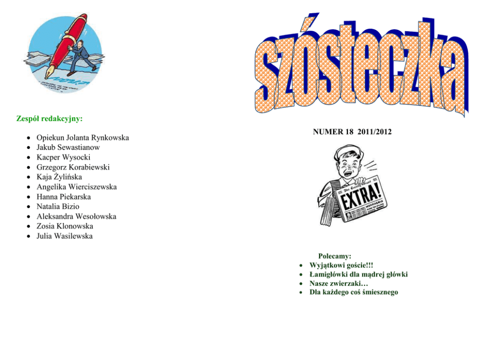 Zespół redakcyjny: NUMER 18 2011/2012 Opiekun Jolanta Rynkowska Jakub Sewastianow Kacper Wysocki Grzegorz Korabiewski Kaja Żylińska Angelika Wierciszewska Hanna Piekarska Natalia Bizio Aleksandra Wesołowska Zosia Klonowska Julia Wasilewska Polecamy: Wyjątkowi goście!!! Łamigłówki dla mądrej główki Nasze zwierzaki… Dla każdego coś śmiesznego Dnia 14 marca 2012r. gościliśmy w naszej szkole dzieci klas IV-V z Ozierska. Na początku zaprezentowaliśmy swoje talenty wokalne i taneczne, później sportowe. Szczególnie zabawa przygotowana przez pana G. Orła sprawiła wiele radości. Po przełamaniu pierwszych lodów podzieliliśmy się na grupy i udaliśmy się do sal, w których panie z uczniami naszej szkoły przygotowały różnego typu zajęcia: od robienia breloczków, kolczyków po wykonywanie kart okolicznościowych. Szczególnym powodzeniem cieszyły się zajęcia przygotowane przez panią J. Rynkowską, w których uczestniczyły wszystkie dziewczynki. Na tym krótkim spotkaniu wykonywały one kolczyki, które wzięły jako pamiątki po wizycie w naszej szkole. Wycieczka szkolna w muzeum Zainteresowanie Jasia wzbudza tabliczka umieszczona obok mumii. - Tutaj jest napisane 2466 PNE. Co to może znaczyć? - pyta kolegę. - To chyba rejestracja wozu, który potrącił tego nieboszczyka. - Nie zasłużyłem na jedynkę! - Masz rację moje dziecko, ale regulamin szkolny nie przewiduje niższych ocen. Wchodzi Murzyn do baru z papugą na ramieniu. Barman pyta: - Skąd to masz? Papuga na to: - Z Afryki! Mój Azor jest taki mądry, że jak wraca ze spaceru to naciska dzwonek do drzwi. Czy pana pies też to potrafi? - Nie musi. Ma własne klucze do mieszkania. Mój pies jest równie mądry jak ja. -To dziwne, że tak mówisz. Właściciele zwykle chwalą swoje zwierzęta... Do apteki wpada blady, drżący chłopiec: -Czy ma pani jakieś środki przeciwbólowe? -A co cię boli chłopcze? -Jeszcze nic, ale ojciec właśnie ogląda moje świadectwo! Dnia 16 marca o godzinie 12:00 w ECK w Ełku w sali „Zebra” odbył się wyjątkowy międzynarodowy koncert. Na początku zaprezentowano popisowy układ poloneza. W dalszej części koncertu wystąpiły zespoły muzyczne i taneczne z Polski, Białorusi i Rosji. Na lekcji matematyki Filipek mówi do nauczyciela: -Jestem zbyt zmęczony, żeby rozwiązać te równania! -To śmieszne, od pracy nikt jeszcze nie umarł! -Zawsze jest ten pierwszy, więc czy ja muszę ryzykować!!! Nauczycielka pyta Jasia: - Co wiesz o bocianach? -To bardzo mądre ptaki odlatują gdy tylko rozpoczyna się rok szkolny. WYKREŚLANKA Baran (21.03–20.04) Kamień ochronny lub talizman - Złota moneta. Noszona w czerwonym portfeliku nie pozwoli na pustą kieszeń. Byk(21.04-20.05) Kamień ochronny lub talizman – Podkowa. Zawieszona w mieszkaniu, najlepiej w pobliżu głównych drzwi lub bezpośrednio na nich jest popularnym talizmanem przynoszącym szczęście domownikom. Bliźnięta(21.05-21.06) Kamień ochronny lub talizman - Koniczynka, ale tylko czterolistna. Pierwszy listek koniczynki to symbol wiary, drugi nadziei, trzeci miłości, a czwarty szczęścia. Rak(22.06-22.07) Kamień ochronny lub talizman - Gwiazda ochronna z kwarcu lub diamencików. Wisiorki z jasnymi kamieniami w kształcie gwiazdki to skuteczne talizmany wspomagające Raki w codziennych zmaganiach. Lew (23.07-23.08) Kamień ochronny lub talizman - Słońce w kręgu. Nieważne, czy Lew nosi ten znak szczęścia, w postaci wisiorka, pierścionka lub ozdabia nim przedmioty codziennego użytku. Panna(24.08–22.09) Kamień ochronny lub talizman - Kryształ górski. Panny często nadmiernie zamartwiają się sprawami zdrowotnymi. Waga(23.09-23.10) D P O L S K A P O G O D A K R W I G Ł A R E O M A R R O Z A B A W A B E N O L A L A N E W P Z B T T Z K N Ó Z Y P E K O T A W K U A Ę O R PREZENT, AKROBATA, ZABAWA, ALBA, POGODA, OLA, POLSKA, KOT, GIMBOWÓZ, TUR, IGŁA, OKO, ALPY Kk Kamień ochronny lub talizman - Symbol Jing i Yang. Chiński znak uchroni Wagi przed wpadaniem w nieuzasadniony gniew. Skorpion(24.10-22.11) Kamień ochronny lub talizman - Pierścień Atlantów. Biżuteria ze wzorami Atlantów, pierścienie lub wisiorki, lepiej pozwolą im zrozumieć intencje oraz potrzeby otoczenia. Strzelec(23.11-21.12) Kamień ochronny lub talizman - Budda pogodny. Budda z okrągłym brzuszkiem, który figlarnie uśmiecha się i podnosi dłoń w górę, wyraża nieokiełzaną radość życia. Koziorożec(22.12-20.01) Kamień ochronny lub talizman - Piramida z kryształu. Kształt kryształowej piramidki działa witalizująco na ich organizm. Wodnik(21.01-19.02) Kamień ochronny lub talizman - Moneta obfitości. To chiński złoty pieniążek z dziurką w środku, na którym widnieją szczęśliwe znaki. Ryby(20.02-20.03) Kamień ochronny lub talizman - Oko proroka. Oko Proroka ma za zadanie chronić właściciela przed złym spojrzeniem, negatywną energią, urokami. 1.Grasz na nim game-padem. 2.Stolicą tego państwa jest Paryż. 3. Niezbędny składnik do szarlotki. 4. Może to być nazwa cukierka, a także zwierzęcia. 5. Pracowite zwierzę mieszkające w mrowisku. 6. Siała baba …. 7.Lekcja z cyframi. ŻÓŁW WODNY Budową ciała upodabniają się do żółwi skórzastych. Karapaks jest normalnie wykształcony, plastron trochę zredukowany, na końcu szczęki nie mają dzioba. Pancerz pokryty rogowymi płytami zbudowanymi keratyny mn (z tego samego białka zbudowane są ludzkie paznokcie). Skorupa duża i spłaszczona o opływowych liniach. Wszystkie kończyny przekształcone w szerokie, płaskie wiosła. Pływają zamaszyście uderzając przednimi odnóżami pływnymi niczym ptaki skrzydłami. Tylne odnóża pływne działają jak stery w łodzi utrzymując lub zmieniając kierunek. To jedyne żółwie, które nie mogą wciągnąć głowy, nóg i ogona do skorupy. Całe życie spędzają w morzu, a jedynie samice na krótki czas wychodzą na ląd w celu złożenia jaj. Większość życi