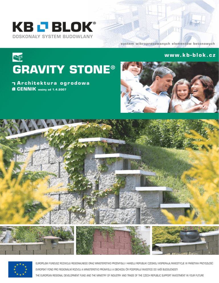 system wibr oprasowanych elementów betonowych w w w. k b - b l o k . c z GRAVITY STONE® Architektura ogrodowa CENNIK ważny od 1.4.2007 EUROPEJSKI FUNDUSZ ROZWOJU REGIONALNEGO ORAZ MINISTERSTWO PRZEMYSŁU I HANDLU REPUBLIKI CZESKIEJ WSPIERAJĄ INWESTYCJE W PAŃSTWA PRZYSZŁOŚĆ EVROPSKÝ FOND PRO REGIONÁLNÍ ROZVOJ A MINISTERSTVO PRŮMYSLU A OBCHODU ČR PODPORUJÍ INVESTICE DO VAŠÍ BUDOUCNOSTI THE EUROPEAN REGIONAL DEVELOPMENT FUND AND THE MINISTRY OF INDUSTRY AND TRADE OF THE CZECH REPUBLIC SUPPORT INVESTMENT IN YOUR FUTURE GRAVITY STONE ® system grawitacyjnych murków oporowych GRAVITY STONE ® Piękny ogród jest naturalnym pragnieniem człowieka. Dzięki zastosowaniu systemu murów oporowych GRAVITY STONE® możecie go Państwo zrealizować. Ogród wzbogacony o taras lub mur oporowy zyska na plastyczności oraz urodzie. Będzie Państwa dumą. Zbudowanie muru oporowego nie stanowi żadnego problemu, dzięki zamkowemu systemowi z jego budową poradzi sobie nawet amator. A wynik będzie lepszy niż Państwa oczekiwania. 2 system wibroprasowanych elementów betonowych 6 1 2 3 4 5 6 instrukcje budowy Wykonać wykop lub wycięcie w stoku w miejscu budowania muru oporowego. Ułożyć i dobrze zagęścić żwirową poduszkę, która służy jako fundament muru. W najniższym miejscu poduszki żwirowej ulokować rurkę drenarską. Położyć pierwszy rząd elementów licowych. Pozycja pozioma zapewniona zostaje dzięki kołkom traserskim i sznurkowi, pozycję pionową należy kontrolować przy pomocy poziomnicy. Elementy kształtowe /kształki/ wyrównywać za pomocą młotka gumowego. Położyć elementy kotwiące. Sprawdzić ich położenie przy pomocy kołka, sznurka i poziomnicy. Między elementy licowe i elementy kotwiące wsunąć beleczki kotwiące. W razie kilkukrotnego kotwienia powtórzyć czynności dla potrzebnej ilości kotw. Do otworów w elementach licowych osadzić plastikowe kołki łączące. Przerwy pomiędzy elementami kotwiącymi oraz szczeliny elemntów licowych wypełnić zasypem żwirowym, który należy zagęścić. Oczyścić powierzchnię elementów betonowych i kontynuować kładzeniem kolejnej warstwy. Elementy licowe nałożyć na przygotowane kołki. Podczas ukodczas układania kolejnej warstwy postępować zgodnie z punktami 3 - 5. Zakończenie muru można wykonać przy pomocy czap ogrodzeniowych, które nałożone zostają również na kołki łączące lub przyklejone klejem mrozoodpornym. Kolejne informacje znajdą Państwo w folderach: 3 w w w. k b - b l o k . c z GRAVITY STONE ® system grawitacyjnych murów oporowych GRAVITY STONE ® 4 system wibroprasowanych elementów betonowych ... narzędzie profesjonalistów w Państwa rękach. 5 w w w. k b - b l o k . c z GRAVITY STONE ® dane techniczne Element licowy łupany wymiary: waga: kolor: 300 x 190 x 450 mm 34,5 kg wg katalogu kolorów standardowych Element licowy gładki wymiary: waga: kolor: 295 x 190 x 450 mm 33,0 kg wg katalogu kolorów standardowych Specjalny element licowy 400 wymiary: waga: kolor: 145 x 190 x 400 mm ok. 21,0 kg wg katalogu kolorów standardowych Element licowy 95 wymiary: waga: kolor: 300 x 95 x 450 mm 21,5 kg wg katalogu kolorów standardowych Beleczka kotwiąca wymiary: waga: kolor: 90 x 190 x 600 mm 24,5 kg naturalny Element kotwiący wymiary: waga: kolor: 120 x 190 x 300 mm 13,0 kg naturalny Element zakrywający wymiary: waga: kolor: 300 x 95 x 450 mm 25,5 kg wg katalogu kolorów standardowych Element zakrywający prosty wymiary: waga: kolor: 340 x 90 x 190 mm 13,5 kg wg katalogu kolorów standardowych Kołek łączący GRAVITY STONE 2 szt. dla jednego elementu licowego wykonanie kolorystyczne Naturalne Czarne Żółte Białe Czerwone Brązone Cynamonowe Ze względu na podstawę cementową wyrobów, wykwity ani odchylenia w zabarwieniu, zwłaszcza w wykonaniu naturalnym, nie są uważane za wady wyrobów. Nie podlegają więc reklamacji. 6 system wibroprasowanych elementów betonowych system grawitacyjnych murów oporowych GRAVITY STONE ® 7 w w w. k b - b l o k . c z GRAVITY STONE ® system grawitacyjnych murów oporowych GRAVITY STONE ® 8 system wibroprasowanych elementów betonowych konstrukce stěny GRAVITY STONE ® System konstrukcyjny GRAVITY STONE® do budowy grawitacyjnych murów oporowych wywodzi się z USA, poszczególne elementy systemu produkowane są u nas przy wykorzystaniu oryginalnej przejętej technologii. System ten umożliwia budowanie masywnych murów kaskadowych, które oznaczają się wysoką stabilnością statyczną. Poszczególne elementy systemu łączone są wzajemnie zamkiem kształtowym, przestrzeń między nimi wypełniana jest zasypem żwirowym, który wraz z szkieletem betonowym tworzy jeden element konstrukcyjny muru. Stabilność zapewniona jest dzięki ich oddziaływaniu grawitacyjnemu. Kombinacja różnych elementów licowych oraz ich wariantów kolorystycznych umożliwia trwałe efektowne kolorystyczne i plastyczne rozwiązanie lica muru, zwłaszcza w razie zastosowania w ogrodach w połączeniu z zielenią. układy elementów typowy przekrój ściany Element kotwiący ROWEK ODWADNIAJĄCY Beleczka kotw. WYSOKOŚĆ ŚCIANY NAD GR. Specjalny element licowy 400 ŁĄCZNY WYSOKOŚĆ ŚCIANY KOTWIENIE MINI Element licowy PODUSZKA ŻWIROWA Jeśli projektowanna wysokość muru jest mniejsza niż 1 m, można wykonać mur stosując tylko elementy licowe. Dla wyższych murów przeznaczone jest kotwienie przy pomocy połączenia beleczki kotwiącej i elementu kotwiącego. Mury należy stawiać na zagęszczonej poduszce żwirowej, która tworzy płaszczyznę do układania pierwszej warstwy ściany. W najniższym miejscu poduszki żwirowej należy ułożyć rurkę drenarską, która wraz z zasypem żwirowym oraz poduszką żwirową służą do odprowadzania wody. System drenażowy ściany jest bardzo ważny dla jej odpowiedniego fukcjonowania. Mur trzeba montować poszczególnymi warstwami, które należy przewiązywać. Zasyp żwirowy układać i