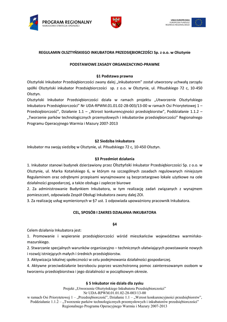 Regulamin Olsztyńskiego Inkubatora Przedsiębiorczości