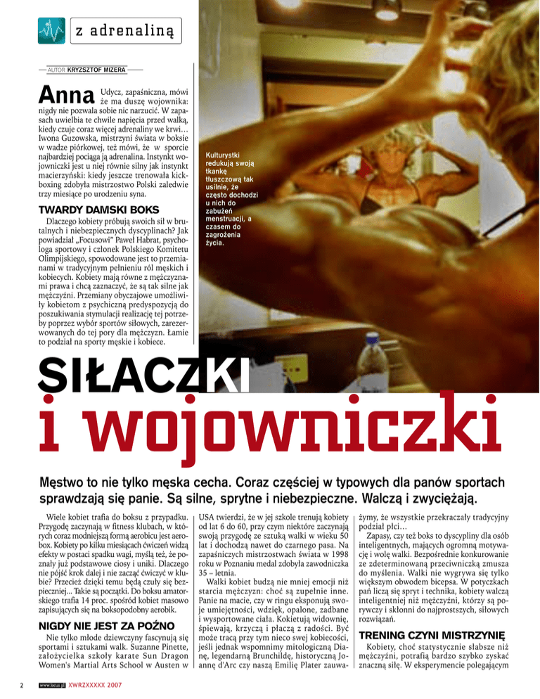 z a d re n a l i n ą Autor kryzsztof mizera Anna Udycz, zapaśniczna, mówi że ma duszę wojownika: nigdy nie pozwala sobie nic narzucić. W zapasach uwielbia te chwile napięcia przed walką, kiedy czuje coraz więcej adrenaliny we krwi… Iwona Guzowska, mistrzyni świata w boksie w wadze piórkowej, też mówi, że w sporcie najbardziej pociąga ją adrenalina. Instynkt wojowniczki jest u niej równie silny jak instynkt macierzyński: kiedy jeszcze trenowała kickboxing zdobyła mistrzostwo Polski zaledwie trzy miesiące po urodzeniu syna. Twardy damski boks Dlaczego kobiety próbują swoich sił w brutalnych i niebezpiecznych dyscyplinach? Jak powiadział „Focusowi” Paweł Habrat, psychologa sportowy i członek Polskiego Komitetu Olimpijskiego, spowodowane jest to przemianami w tradycyjnym pełnieniu ról męskich i kobiecych. Kobiety mają równe z mężczyznami prawa i chcą zaznaczyć, że są tak silne jak mężczyźni. Przemiany obyczajowe umożliwiły kobietom z psychiczną predyspozycją do poszukiwania stymulacji realizację tej potrzeby poprzez wybór sportów siłowych, zarezerwowanych do tej pory dla mężczyzn. Łamie to podział na sporty męskie i kobiece. Kulturystki redukują swoją tkankę tłuszczową tak usilnie, że często dochodzi u nich do zabużeń menstruacji, a czasem do zagrożenia życia. SIŁACZKI i wojowniczki Męstwo to nie tylko męska cecha. Coraz częściej w typowych dla panów sportach sprawdzają się panie. Są silne, sprytne i niebezpieczne. Walczą i zwyciężają. Wiele kobiet trafia do boksu z przypadku. Przygodę zaczynają w fitness klubach, w których coraz modniejszą formą aerobicu jest aerobox. Kobiety po kilku miesiącach ćwiczeń widzą efekty w postaci spadku wagi, myślą też, że poznały już podstawowe ciosy i uniki. Dlaczego nie pójść krok dalej i nie zacząć ćwiczyć w klubie? Przecież dzięki temu będą czuły się bezpieczniej... Takie są początki. Do boksu amatorskiego trafia 14 proc. spośród kobiet masowo zapisujących się na boksopodobny aerobik. Nigdy nie jest za poźno Nie tylko młode dziewczyny fascynują się sportami i sztukami walk. Suzanne Pinette, założycielka szkoły karate Sun Dragon Women's Martial Arts School w Austen w XWRZXXXXX 2007 USA twierdzi, że w jej szkole trenują kobiety od lat 6 do 60, przy czym niektóre zaczynają swoją przygodę ze sztuką walki w wieku 50 lat i dochodzą nawet do czarnego pasa. Na zapaśniczych mistrzostwach świata w 1998 roku w Poznaniu medal zdobyła zawodniczka 35 – letnia. Walki kobiet budzą nie mniej emocji niż starcia mężczyzn: choć są zupełnie inne. Panie na macie, czy w ringu eksponują swoje umiejętności, wdzięk, opalone, zadbane i wysportowane ciała. Kokietują widownię, śpiewają, krzyczą i płaczą z radości. Być może tracą przy tym nieco swej kobiecości, jeśli jednak wspomnimy mitologiczną Dianę, legendarną Brunchildę, historyczną Joannę d'Arc czy naszą Emilię Plater zauwa- żymy, że wszystkie przekraczały tradycyjny podział płci… Zapasy, czy też boks to dyscypliny dla osób inteligentnych, mających ogromną motywację i wolę walki. Bezpośrednie konkurowanie ze zdeterminowaną przeciwniczką zmusza do myślenia. Walki nie wygrywa się tylko większym obwodem bicepsa. W potyczkach pań liczą się spryt i technika, kobiety walczą inteligentniej niż mężczyźni, którzy są porywczy i skłonni do najprostszych, siłowych rozwiązań. Trening czyni mistrzynię Kobiety, choć statystycznie słabsze niż mężczyźni, potrafią bardzo szybko zyskać znaczną siłę. W eksperymencie polegającym planeta laboratorium Kobiety zapaśniczki walcząc wykorzystują w większym niż mężczyżni stopniu inteligencję i spryt. mix er Sumo, tradycyjne japońskie zmagania męskie tu w wykonaniu Europejek: Weroniki Kozłowskiej z Białorusi i Marii Van Den Brink z Holandii. cywilizacja pod m aską o b se r w a t o r i u m f o t o st r o n y z b l i sk a Kiedy Iwona Guzowska była u sczytu bokserskiej kariery samotnie wychowywała dziecko. Biła się, by zarobić na siebie i syna. Kobiety, które odkryją w sobie predyspozycje siłowe chwytają za sztangi. Oczywiście nie są w stanie dźwigać tyle, co mężczyźni (rekord świata w dwuboju mężczyzn ważących 69 kg wynosi 357 kg, podczas gdy rekord kobiet o tej samej wadze: 286 kg), nie ma to jednak dla nich znaczenia, wszak nie chcą one rywalizować z mężczyznami, tylko między sobą. Jak powiedział „Focusowi” profesor Wiesław Pilis trener i sędzia podnoszenia ciężarów: trudno jednoznacznie powiedzieć, t ec h no lo g i e dlaczego kobiety trenują sporty siłowe. Na pewno trening jest dla nich mniej męczący, niż dla mężczyzn, bo w ich mięśniach większy udział mają włókna wolnokurczliwe i trudno męczącące się. Metabolizm ich organizmów jest bardziej tłuszczowy, szczególnie w fazie lutealnej (zaczynającej się dzień po owulacji) cyklu menstruacyjnego. Może pod wpływem ruchów feministycznych pojawiła się tendencja do treningów siłowych kobiet i chęc domniacji nad mężczyznami. Tendencja podnoszenia ciężarów przez kobiety pojawiła się w basenie Morza Śródziemnego, a później d l a ok a Nie taka słaba płeć z a d re n al i ną Słynny Puchar Sześciu Narodowów, najważniejsze w Europie zawody w rugby mają swój kobiecy odpowiednik. Na zdjęciu: Szkotki i Angielki. j a j o K ol um ba na 10-tygodniowym, identycznym treningu kobiet i mężczyzn wykazano, że u kobiet siła w wyciskaniu sztangi wzrosła o 29 proc. podczas gdy u mężczyzn o 17 proc. W przysiadzie siła kobiet wzrosła o 30 proc, a mężczyzn o 26 proc. Można to wytłumaczyć w ten sposób: efekty treningu były większe, bo u pań nietrenujących siła mięśniowa jest dalece mniejsza, niż u nietrenujących mężczyzn. Przyczyny tych dysproporcji nie są znane: badania laboratoryjne wskazują, że tzw. siła względna mięśnia szkieletowego (prze