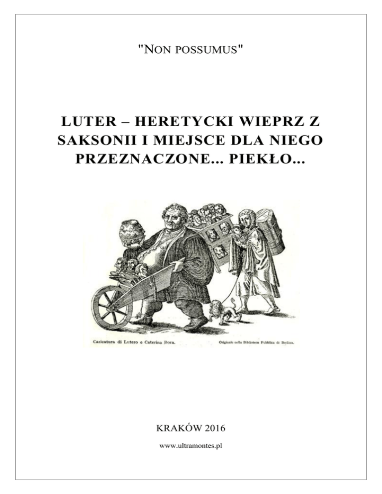 "NON POSSUMUS" LUTER – HERETYCKI WIEPRZ Z SAKSONII I MIEJSCE DLA NIEGO PRZEZNACZONE... PIEKŁO... KRAKÓW 2016 www.ultramontes.pl Luter – heretycki wieprz z Saksonii i miejsce dla niego przeznaczone... piekło... "NON POSSUMUS " –––– "Canis reversus ad suum vomitum; et sus lota in volutabro luti". "Wrócił się pies do wymiotu swego i świnia umyta do kałuży błota". (Św. Piotr Apostoł o heretykach, 2 P. 2, 22) (1) –––––– W roku 1883 czcigodna siostra Maria Serafina Micheli (1849 – 1911), założycielka Instytutu Sióstr od Aniołów, przejeżdżała przez Eisleben, miejsce urodzenia Lutra, w Saksonii. Obchodzono w tym dniu 400-tną rocznicę urodzin herezjarchy (10 listopada 1483) – który dokonał rozłamu w Europie i Kościele – toteż ulice były zatłoczone, na balkonach powiewały flagi. Wśród wielu obecnych dygnitarzy oczekiwano również przybycia cesarza Wilhelma I, który miał się pojawić w każdej chwili, aby przewodniczyć uroczystym obchodom. Świątobliwa siostra, zauważywszy wielkie zamieszanie nie była zainteresowana poznaniem przyczyny tego niecodziennego ożywienia; jedynym jej pragnieniem było znalezienie kościoła, aby się pomodlić i móc złożyć wizytę Panu Jezusowi ukrytemu w Najświętszym Sakramencie. Wędrując jakiś czas, w końcu napotkała jeden, jednakże drzwi były zamknięte... Nie zważając na nic uklękła na schodkach wejściowych, żeby odmówić swoje modlitwy. Ponieważ był już wieczór, nie spostrzegła, że nie był to kościół, lecz zbór protestancki. Gdy tak się modliła, ukazał się jej anioł stróż, który powiedział: "Wstań, bo to jest zbór protestancki". Następnie dodał: "Chcę ci pokazać miejsce potępienia Marcina Lutra i męki, jakie ponosi jako karę za swoją pychę". Po tych słowach ujrzała straszną otchłań ognia, gdzie niezliczone dusze doznawały okrutnych mąk. Na dnie tej przepaści znajdował się człowiek, Marcin Luter, który odróżniał się od pozostałych: był otoczony przez demony, które zmuszały go do klęczenia i wszyscy, wyposażeni w młotki, usiłowali bezskutecznie, wbić w jego głowę ogromny gwóźdź. Siostra pomyślała: gdyby ci świętujący ludzie zobaczyli tę dramatyczną scenę, na pewno nie składaliby mu hołdów, nie wspominali, nie czcili pamięci i nie świętowali urodzin takiego 2 osobnika. Później, gdy tylko nadarzała się okazja przypominała współsiostrom, aby żyły w pokorze i ukryciu. Była przekonana, że Marcin Luter został ukarany piekłem ze względu na pierwszy grzech główny, czyli pychę. (2) Ohyda spustoszenia! Pseudopapież Bergoglio i pomnik herezjarchy Lutra w Watykanie (13. 10. 2016 r.) 3 http://nullapossiamocontrolaverita.blogspot.com/2015/12/leretico-porco-sassone-lutero-e-il.html Z języka włoskiego tłumaczyła Iwona Olszewska ––––––––––– Przypisy: (1) Początkowy cytat i ostatnia ilustracja od red. Ultra montes. (2) Por. 1) Ks. Marceli Nowakowski, Heretycy i sektarze. Marcin Luter, twórca pseudoreformacji. 2) Ks. Rivaux, Sposób wyrażania się Lutra. 3) Ks. Zygmunt Baranowski, Reformy małżeńskie Lutra. 4) "Przegląd Lwowski", "Apostolska łagodność" Marcina Lutra. 5) Konrad von Bolanden, Luter w drodze do narzeczonej. 6) Ks. A. Kraetzig SI, Janssen i historia reformacji. 7) Ks. Jakub Balmes, a) Fanatyzm i indyferentyzm, ich źródła i następstwa. b) Katolicyzm i protestantyzm w stosunku do cywilizacji europejskiej. 8) Ks. Antoni Brzeziński, Rys dziejów świętego Soboru Trydenckiego. 9) O. Jan Jakub Scheffmacher SI, Katechizm polemiczny czyli Wykład nauk wiary chrześcijańskiej przez zwolenników Lutra, Kalwina i innych z nimi spokrewnionych, zaprzeczanych lub przekształcanych. 10) Ks. Adam Kopyciński, Bezwyznaniowy. 11) O. Paweł Segneri SI, a) O piekle. b) O lekceważeniu sobie gróźb Bożych przez niedowiarków. c) Kazanie o Bóstwie Chrystusowym. 12) Ks. Józef Stagraczyński, a) Czego uczy Kościół o piekle. b) Okropność piekła. c) Bojaźń piekła. d) Noc we wieczności. 13) Św. Teresa od Jezusa, a) Starania o nawrócenie heretyków. b) Wizja mąk piekielnych. 14) Dusza potępionej, List z piekła. "Nie módl się za mnie – jestem potępiona!". (Przyp. red. Ultra montes). ( HTM ) © Ultra montes (www.ultramontes.pl) Cracovia MMXVI, Kraków 2016 4