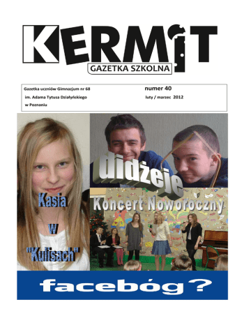 Gazetka uczniów Gimnazjum nr 68 numer 40 im. Adama Tytusa Działyńskiego luty / marzec 2012 w Poznaniu Moi drodzy! Od 6 lat opiekuję się redakcją „Kermita”, ale nie publikuję na łamach tej gazetki własnych tekstów. Dziś robię wyjątek, bo i okazja jest wyjątkowa. Trzymacie w ręku 40. numer naszego pisma. Z tej okazji chciałabym podziękować obecnym i byłym redaktorom za ich pracę, zaangażowanie, niezwykłe pomysły, wytrwałość w działaniu. To dla mnie wielka przyjemność, że mogę współpracować z tak nietuzinkowymi ludźmi. Dla dziennikarzy najważniejsze jest jednak uznanie czytelników. Nie tak dawno otrzymałam sms-a od byłej uczennicy naszego gimnazjum, która napisała: „Właśnie czytam nowego Kermita. Poprawił mi humor lepiej niż poranna kawa.” Dla takich chwil warto tworzyć gazetkę! Redaktorom życzę świetnych pomysłów, lekkiego pióra i wielu udanych tekstów. A czytelników zapraszam do częstej lektury naszej gazetki. Jak zwykła pisać Tosia: „Jest co czytać!” opiekun gazetki Elżbieta Kaźmierska ________________________________________________________________________________ Archiwalne numery Kermita można czytać na www.atohistoria.pl __________________________________________________________________________ Redakcja Kermita dziękuje pani Małgorzacie Wasielewskiej za pomoc. Nasza redakcja: Małgorzata Tosiek, Klaudia Krukawka, Ania Kettner, Ania Graczyk, Ada Banasiewicz, Marysia Banasiewicz, Marta Bąkowska, Weronika Bąkowska, Jagoda Duszyńska , Paulina Nelkowska, Natalia Stęcel, Kasia Rajczyk, Olga Terefenko, Agata Tomaszewska, Dominik Śledź, Adam Janczewski. W tym numerze: KioSziR ……………………………………………………………….….... str. 3 Kasia w Kulisach Sławy…………………………………………..…. str. 4-5 Facebóg …………………………………………………………………... str. 6-7 Amigas & Rivales…………….…………………………….………….. str. 8 Goście w szkole …………………………………………….…….…... str. 9 Co u naszych absolwentów? ………………………..………..…. str. 10 2 KioSziR czyli Kermitowe informacje o Szkole i Reszcie 4 stycznia 2012 Szkolne koło historyczne obejrzało żłóbki w kościele św. Wojciecha oraz kościele św. Franciszka Serafickiego w Poznaniu. Choć szopki bardzo się od siebie różniły, to obie zrobiły na nas ogromne wrażenie! Uczestnicy wycieczki zgodnie zaliczają ją do udanych 9-13 stycznia 2012 Naszą szkołę odwiedzili obcokrajowcy z Nowej Zelandii, Indonezji, Peru i Argentyny. Gościli u nas przez tydzień. Mieliśmy okazję porozmawiać z nimi na przerwach oraz uczestniczyć w zajęciach, na których dowiedzieliśmy się więcej o ich krajach. Dzięki tej wizycie mogliśmy lepiej poznać kulturę innych państw. 18-19 stycznia 2012 Klasy 1a i 1b gimnazjum udały się do policyjnej izby dziecka na prelekcję na temat: „Odpowiedzialność karna nieletnich”. Uczniowie mogli zobaczyć, gdzie trafiają ich rówieśnicy, którzy dopuścili się przestępstwa. 19 stycznia 2012 Odbyła się prelekcja na temat Holocaustu dla klas 2 i 3 gimnazjum. Następnie uczniowie wraz z nauczycielami wybrali się do kina na poruszający film Agnieszki Holland pt. „W ciemności”. 20 stycznia 2012 W naszej szkole odbył się tradycyjny Koncert Noworoczny. Uczniowie, zarówno starszych, jak i młodszych klas, zaprezentowali kolegom, rodzicom i nauczycielom swoje niezwykłe talenty. Następnie wzięliśmy udział w licytacji prac uczniów i nauczycieli. Wszyscy świetnie się bawili! 2 lutego 2012 Podejmowaliśmy w naszej szkole nauczycieli oraz uczniów z Estonii. Najpierw wystąpili nasi uczniowie, a potem goście opowiedzieli o swoim kraju i nauczyli nas tańczyć narodowy taniec estoński. Następnie uczestniczyli w kilku lekcjach, aby zobaczyć jak funkcjonuje szkoła w Polsce . 10 lutego 2012 W naszej szkole odbyła się Closing Gala, czyli spotkanie pożegnalne wszystkich uczestników projektu AISEC. Uczniowie po raz kolejny zaprezentowali gościom swoje liczne talenty, następnie każdy z nich powiedział kilka słów od siebie oraz dowiedzieliśmy się więcej o organizacji AISEC. Marianna 3 Szum wokół tegorocznych konkursów przedmiotowych powoli cichnie wraz z emocjami zawiedzionych uczestników. Są jednak osoby, które wygrały pojedynek z niezwykle wymagającą komisją. Niektórym udało się nawet osiągnąć rzecz, jak się zdawało, niewykonalną i zostać finalistą Wojewódzkiego Konkursu Biologicznego! W „Kulisach Sławy” prezentujemy osobę, która dokonała karkołomnego wyczynu i wróciła z tarczą z konkursu. Kasia Rajczyk - uczennica klasy 3b, FINALISTKA KONKURSU BIOLOGICZNEGO, zawsze uśmiechnięta blondynka o niebanalnym poczuciu humoru, ogromnej wiedzy (nie tylko biologicznej), osoba nietuzinkowa i, co wiedzą tylko wtajemniczeni, prawdziwa dusza towarzystwa. Kermit: A więc zaczynamy… Kasia Rajczyk: Wybierzcie kogoś innego albo zróbmy krzyżówkę w to miejsce. K: Nie ma mowy! Skąd u mistrzyni biologii taka skromność? KR: Tak lubię. K: A od kiedy lubisz biologię? KR: Hm… Po prostu wolę biologię od innych przedmiotów. K: I tylko dlatego masz takie osiągnięcia? Nieźle. Czy tytuł finalisty zmienił coś w Twoim życiu? KR: No, ździebko się dowartościowałam i już wiem, czego chcę (śmiech). K: Widzisz się jako lekarza w białym kitlu? KR: Tak. Myślę, że pójdę w ślady taty i zostanę lekarzem. K: Znając twoją obsesję na punkcie figury podejrzewam, że wybierzesz specjalizację dietetyk . KR: Nie znoszę układać diet od czasu, gdy robiłam takie zadanie na technikę. Widzę siebie raczej jako ortodontę. K: Ortodonta? Lubisz się znęcać nad innymi? KR: Tylko nad braćmi . K: Krążą plotki, że bardzo lubisz jeść (czego oczywiście w ogóle po Tobie nie widać)… KR: Lubię, aczkolwiek jestem