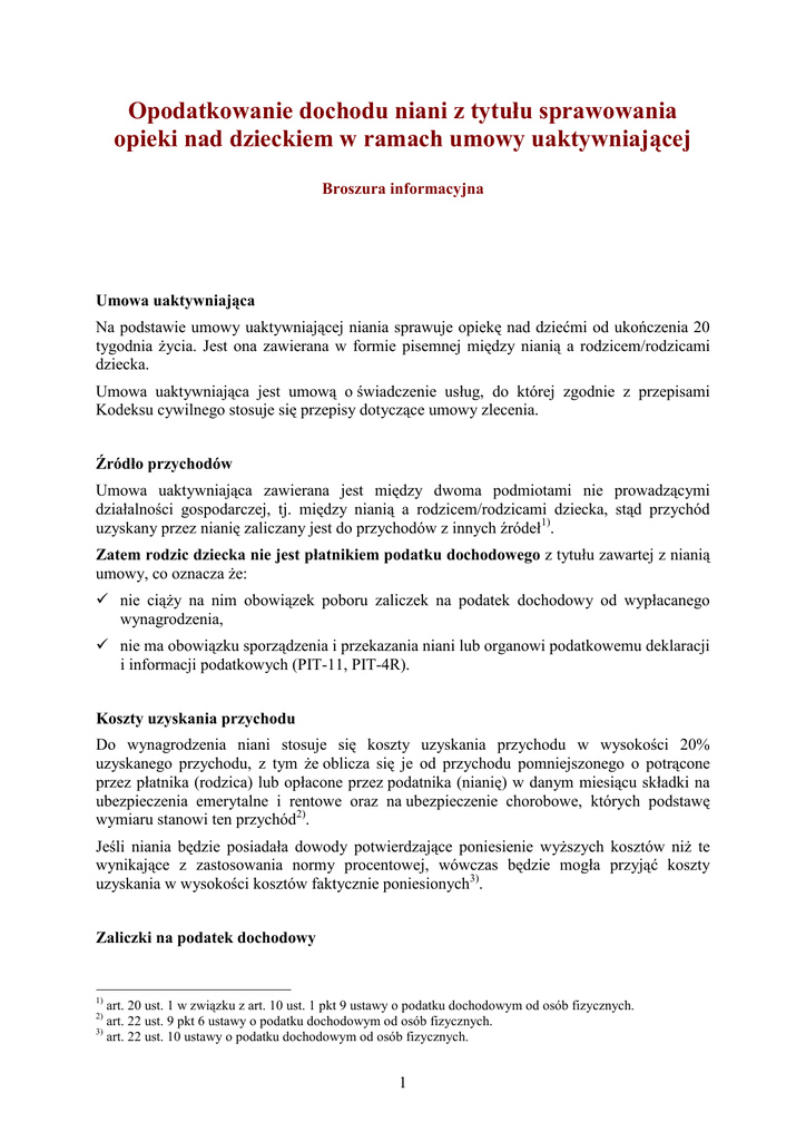 Opodatkowanie dochodu niani z tytułu sprawowania opieki nad dzieckiem w ramach umowy uaktywniającej Broszura informacyjna Umowa uaktywniająca Na podstawie umowy uaktywniającej niania sprawuje opiekę nad dziećmi od ukończenia 20 tygodnia Ŝycia. Jest ona zawierana w formie pisemnej między nianią a rodzicem/rodzicami dziecka. Umowa uaktywniająca jest umową o świadczenie usług, do której zgodnie z przepisami Kodeksu cywilnego stosuje się przepisy dotyczące umowy zlecenia. Źródło przychodów Umowa uaktywniająca zawierana jest między dwoma podmiotami nie prowadzącymi działalności gospodarczej, tj. między nianią a rodzicem/rodzicami dziecka, stąd przychód uzyskany przez nianię zaliczany jest do przychodów z innych źródeł1). Zatem rodzic dziecka nie jest płatnikiem podatku dochodowego z tytułu zawartej z nianią umowy, co oznacza Ŝe: nie ciąŜy na nim obowiązek poboru zaliczek na podatek dochodowy od wypłacanego wynagrodzenia, nie ma obowiązku sporządzenia i przekazania niani lub organowi podatkowemu deklaracji i informacji podatkowych (PIT-11, PIT-4R). Koszty uzyskania przychodu Do wynagrodzenia niani stosuje się koszty uzyskania przychodu w wysokości 20% uzyskanego przychodu, z tym Ŝe oblicza się je od przychodu pomniejszonego o potrącone przez płatnika (rodzica) lub opłacone przez podatnika (nianię) w danym miesiącu składki na ubezpieczenia emerytalne i rentowe oraz na ubezpieczenie chorobowe, których podstawę wymiaru stanowi ten przychód2). Jeśli niania będzie posiadała dowody potwierdzające poniesienie wyŜszych kosztów niŜ te wynikające z zastosowania normy procentowej, wówczas będzie mogła przyjąć koszty uzyskania w wysokości kosztów faktycznie poniesionych3). Zaliczki na podatek dochodowy 1) art. 20 ust. 1 w związku z art. 10 ust. 1 pkt 9 ustawy o podatku dochodowym od osób fizycznych. art. 22 ust. 9 pkt 6 ustawy o podatku dochodowym od osób fizycznych. 3) art. 22 ust. 10 ustawy o podatku dochodowym od osób fizycznych. 2) 1 Co do zasady przychody z innych źródeł podlegają opodatkowaniu dopiero w zeznaniu rocznym. Niania moŜe jednak podjąć decyzję o odprowadzaniu miesięcznych zaliczek na podatek dochodowy w ciągu roku podatkowego4). Zaliczki wpłaca na rachunek urzędu skarbowego właściwego według jej miejsca zamieszkania w terminie do 20 dnia miesiąca następującego po miesiącu, w którym uzyskała dochód, a za grudzień w terminie złoŜenia zeznania podatkowego. Uwaga! JeŜeli niania dokona wpłaty zaliczki w trakcie roku podatkowego, to jest zobowiązana do wpłacania kolejnych zaliczek od dochodów uzyskanych z tego tytułu w następnych miesiącach, aŜ do końca tego roku podatkowego.5) Do uzyskanego przez nianię dochodu (przychód obniŜony o składki na ubezpieczenie społeczne pobrane ze środków niani przez płatnika i o koszty uzyskania przychodu) stosuje się najniŜszą stawkę podatkową określoną w skali podatkowej, czyli 18 %. Przy obliczaniu zaliczki na podatek niania moŜe stosować takŜe wyŜszą stawkę podatkową wynoszącą 32%6). Ubezpieczenia społecznie i ubezpieczenie zdrowotne Rodzic dziecka jest płatnikiem składek na ubezpieczenie emerytalne, rentowe oraz ubezpieczenie zdrowotne od podstawy stanowiącej kwotę nadwyŜki nad kwotę minimalnego wynagrodzenia, co oznacza Ŝe ciąŜy na nim obowiązek obliczania i odprowadzania składek do Zakładu Ubezpieczeń Społecznych (ZUS)7) od tej kwoty, a takŜe obowiązek informowania ZUS o kaŜdej zmianie mającej wpływ na opłacanie składek, w szczególności o rozwiązaniu lub wygaśnięciu umowy uaktywniającej. 1. Składki na ubezpieczenia społeczne Podstawę obliczenia podatku stanowi dochód po odliczeniu kwot składek określonych w ustawie z dnia 13 października 1998 r. o systemie ubezpieczeń społecznych8): a) zapłaconych w roku podatkowym bezpośrednio na własne ubezpieczenia emerytalne, rentowe, chorobowe oraz wypadkowe podatnika oraz osób z nim współpracujących, b) potrąconych w roku podatkowym przez płatnika ze środków podatnika od przychodu podlegającego opodatkowaniu. Składki na ubezpieczenia emerytalne, rentowe i wypadkowe niań obliczone od podstawy, którą stanowi kwota nie wyŜsza niŜ kwota minimalnego wynagrodzenia za pracę, opłaca ZUS. Składki są finansowane przez budŜet państwa niezaleŜnie od tego czy niania podlega ubezpieczeniom emerytalnemu i rentowym obowiązkowo czy dobrowolnie. Składki na ubezpieczenia emerytalne i rentowe niani naliczone od nadwyŜki ponad kwotę minimalnego wynagrodzenia są współfinansowane przez nianię i rodzica. Niania i rodzic finansują w równych częściach składkę na ubezpieczenie emerytalne (po 9,76%). Składkę na ubezpieczenie rentowe w wysokości 1,5% podstawy wymiaru finansuje niania, a w wysokości 4,5% (od lutego 2012 r. - 6,5%) podstawy wymiaru – rodzic. 4) art. 44 ust. 1c ustawy o podatku dochodowym od osób fizycznych. art. 44 ust. 1d ustawy o podatku dochodowym od osób fizycznych. 6) art. 44 ust. 1c ustawy o podatku dochodowym od osób fizycznych. 7) art. 51 ust. 1 pkt 2 ustawy o opiece nad dziećmi w wieku do lat 3. 8) art. 26 ust. 1 pkt 2 ustawy o podatku dochodowym od osób fizycznych. 5) 2 Składkę na ubezpieczenie wypadkowe finansuje w całości rodzic. Składkę na dobrowolne ubezpieczenie chorobowe niani, w kaŜdym przypadku, bez względu na to czy podstawa wymiaru składek na ubezpieczenia społeczne przekracza kwotę minimalnego wynagrodzenia za pracę czy nie, finansuje w całości z własnych środków niania, zaś opłaca ją rodzic. Składki pobrane przez płatnika z wynagrodzenia niani podlegają odliczeniu od podstawy opodatkowania (dotyczy to składek zapłaconych od podstawy wymiaru stanowiącej nadwyŜkę ponad kwotę minimalnego wynagrodzenia). 2. Składka na ubezpieczenie zdrowotne Podatek dochodowy w pierwszej kolejności ulega obniŜeniu o kwotę składki na ubezpieczenie zdrowotne, o której mowa w ust