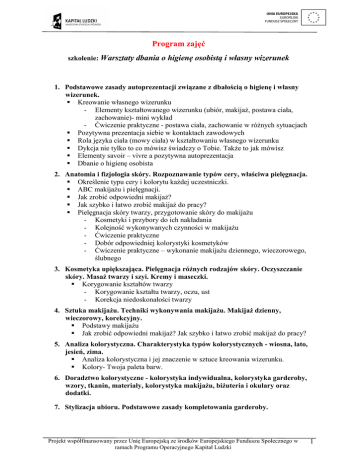Program zajęć szkolenie: Warsztaty dbania o higienę osobistą i własny wizerunek 1. Podstawowe zasady autoprezentacji związane z dbałością o higienę i własny wizerunek. Kreowanie własnego wizerunku - Elementy kształtowanego wizerunku (ubiór, makijaż, postawa ciała, zachowanie)- mini wykład - Ćwiczenie praktyczne - postawa ciała, zachowanie w różnych sytuacjach Pozytywna prezentacja siebie w kontaktach zawodowych Rola języka ciała (mowy ciała) w kształtowaniu własnego wizerunku Dykcja nie tylko to co mówisz świadczy o Tobie. Także to jak mówisz Elementy savoir – vivre a pozytywna autoprezentacja Dbanie o higienę osobista 2. Anatomia i fizjologia skóry. Rozpoznawanie typów cery, właściwa pielęgnacja. Określenie typu cery i kolorytu każdej uczestniczki. ABC makijażu i pielęgnacji. Jak zrobić odpowiedni makijaż? Jak szybko i łatwo zrobić makijaż do pracy? Pielęgnacja skóry twarzy, przygotowanie skóry do makijażu - Kosmetyki i przybory do ich nakładania - Kolejność wykonywanych czynności w makijażu - Ćwiczenie praktyczne - Dobór odpowiedniej kolorystyki kosmetyków - Ćwiczenie praktyczne – wykonanie makijażu dziennego, wieczorowego, ślubnego 3. Kosmetyka upiększająca. Pielęgnacja różnych rodzajów skóry. Oczyszczanie skóry. Masaż twarzy i szyi. Kremy i maseczki. Korygowanie kształtów twarzy - Korygowanie kształtu twarzy, oczu, ust - Korekcja niedoskonałości twarzy 4. Sztuka makijażu. Techniki wykonywania makijażu. Makijaż dzienny, wieczorowy, korekcyjny. Podstawy makijażu Jak zrobić odpowiedni makijaż? Jak szybko i łatwo zrobić makijaż do pracy? 5. Analiza kolorystyczna. Charakterystyka typów kolorystycznych - wiosna, lato, jesień, zima. Analiza kolorystyczna i jej znaczenie w sztuce kreowania wizerunku. Kolory- Twoja paleta barw. 6. Doradztwo kolorystyczne - kolorystyka indywidualna, kolorystyka garderoby, wzory, tkanin, materiały, kolorystyka makijażu, biżuteria i okulary oraz dodatki. 7. Stylizacja ubioru. Podstawowe zasady kompletowania garderoby. Projekt współfinansowany przez Unię Europejską ze środków Europejskiego Funduszu Społecznego w ramach Programu Operacyjnego Kapitał Ludzki 1 8. Typy sylwetek. Fasony ubrań. Sylwetka a ubranie. Harmonia proporcji. Charakterystyka sylwetki każdej uczestniczki typy sylwetek. Określenie stylu i preferencji modowych każdej z Pań. Rozmowa na temat tego co lubią w modzie i w jaki sposób komponują swoją garderobę i dodatki. Jak ubrać się aby zrobić dobre wrażenie na swoim pracodawcy/kliencie? Zasady komponowania i kompletowania garderoby. Z jakich elementów powinna składać się garderoba kobiety 9. Dodatki i ich rola. Podstawowe zasady kompletowania garderoby. Poznaj swój styl-Określenie stylu i preferencji modowych Projekt współfinansowany przez Unię Europejską ze środków Europejskiego Funduszu Społecznego w ramach Programu Operacyjnego Kapitał Ludzki 2