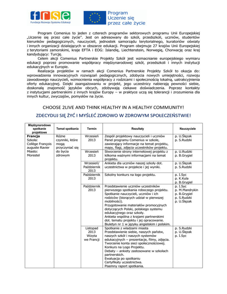 Program Comenius to jeden z czterech programów sektorowych programu Unii Europejskiej „Uczenie się przez całe życie”. Jest on adresowany do szkół, przedszkoli, uczniów, studentów kierunków pedagogicznych, nauczycieli, jednostek samorządu terytorialnego, kuratoriów oświaty i innych organizacji działających w obszarze edukacji. Program obejmuje 27 krajów Unii Europejskiej z terytoriami zamorskimi, kraje EFTA i EOG: Islandię, Liechtenstein, Norwegię, Chorwację oraz kraj kandydujący: Turcję. Celem akcji Comenius Partnerskie Projekty Szkół jest wzmacnianie europejskiego wymiaru edukacji poprzez promowanie współpracy międzynarodowej szkół, przedszkoli i innych instytucji edukacyjnych w Europie. Realizacja projektów w ramach akcji Comenius Partnerskie Projekty Szkół to okazja do: wprowadzenia innowacyjnych rozwiązań pedagogicznych, zdobycia nowych umiejętności, rozwoju zawodowego nauczycieli, wzmocnienia współpracy z rodzicami i społecznością lokalną, uatrakcyjnienia oferty edukacyjnej. Dzięki zaangażowaniu w projekt, jego uczestnicy nabierają pewności siebie, doskonalą znajomość języków obcych, zdobywają ciekawe doświadczenia. Poprzez kontakty z instytucjami partnerskimi z innych krajów Europy – w praktyce uczą się tolerancji i zrozumienia dla innych kultur, zwyczajów, pomysłów na życie. CHOOSE 2LIVE AND THINK HEALTHY IN A HEALTHY COMMUNITY! ZDECYDUJ SIĘ ŻYĆ I MYŚLEĆ ZDROWO W ZDROWYM SPOŁECZEŃSTWIE! Międzynarodowe spotkanie projektowe Francja Szkoła: Collège François auguste Ravier Miasto: Morestel Temat spotkania Termin Różne czynniki, które mogą przyczyniać się do bycia zdrowym Wrzesień 2013 Wrzesień 2013 Wrzesień/ Październik 2013 Październik 2013 Październik 2013 Listopad 2013 Wizyta we Francji Rezultaty Nauczyciele Zespół projektowy nauczycieli i uczniów Panel programu Comenius w szkole, zawierający informacje na temat projektu, mapy, flagi, zdjęcia uczestników projektu. Stworzenie strony internetowej projektu z kilkoma ważnymi informacjami na temat projektu. Ankieta dla uczniów naszej szkoły dot. uczestnictwa w projekcie i jej wyniki. p. U.Ślęzak p. S.Rudzki Szkolny konkurs na logo projektu. p. p. p. p. p. p. p. p. Przedstawienie uczniów uczestników pierwszego spotkania roboczego projektu. Spotkanie nauczycieli, uczniów i ich rodziców (biorących udział w pierwszej mobilności). Przygotowanie materiałów promocyjnych dotyczących Polski, polskiego systemu edukacyjnego oraz szkoły. Ankieta wspólna z krajami partnerskimi dot. tematu projektu i jej opracowanie. Biuletyn nr 1 w języku angielskim i polskim. Spotkanie z władzami miasta Przedstawienie siebie, naszych państw, naszych szkół i naszych systemów edukacyjnych – prezentacje, filmy, zdjęcia. Tworzenie konta sieci społecznościowej. Konkurs na Logo Projektu. Debaty – ankiety zastosowane w szkołach partnerskich. Ewaluacja po spotkaniu Certyfikaty uczestnictwa. Pisemny raport spotkania. p. U.Rudzki p. B.Grygiel p. U.Ślęzak p. S.Rudzki I.Syc K.Kula B.Grygiel I.Syc M.Mandrykin B.Grygiel S.Rudzki U.Ślęzak p. S.Rudzki p. U.Ślęzak p. I.Syc Turcja Szkoła: HASAN TÜREK ANADOLU LİSESİ Miasto: MANİSA Grudzień 2013 Zbilansowana dieta. Witaminy i minerały znajdujące się w różnych produktach spożywczych. Styczeń 2013 Luty 2014 Wizyta w Turcji Marzec 2014 Kwiecień 2014 Skutki palenia papierosów, brania narkotyków i picia alkoholu Maj 2014 Wizyta w Polsce Rozpowszechnianie działalności – każda szkoła (typy: kampanie informacyjne, warsztaty, ulotki na ulicy, w parkach, sportowe zajęcia z dziećmi z innych szkół, artykuły prasowe, obecność mediów, broszur reklamowych, umieszczanie materiałów w miejscach publicznych, z wykorzystaniem logo). Wideo publikacje (YouTube). Cyfrowe karty i wiadomości związane z obchodami świąt. Zrównoważona dieta. Witaminy i minerały znajdujące się w różnych produktach spożywczych (przygotowanie prezentacji i innych materiałów na spotkanie). Spotkanie nauczycieli, uczniów i ich rodziców zaangażowanych w mobilności. Spotkanie z władzami miasta. Przygotowanie prezentacji na temat witamin i minerałów znajdujących się w różnych produktach spożywczych przygotowanych przez uczniów, projekty opracowane w szkołach partnerskich. Przygotowanie produktów na zdrowe potrawy. Przepisy na zdrową żywność (utworzenie stoiska). Zbieranie warzyw i owoców z pól, gotowanie według zdrowych przepisów kulinarnych z uczniami i nauczycielami oraz nagrywanie tych działań. Przygotowanie broszury z tych przepisów. Ewaluacja po spotkaniu. Certyfikaty uczestnictwa. Pisemny raport spotkania. Rozpowszechnianie działalności – każda szkoła (typy: warsztaty, ulotki na ulicy, w parkach, sportowe zajęcia z dziećmi z innych szkół, artykuły prasowe, obecność mediów, broszur reklamowych, umieszczanie materiałów w miejscach publicznych, z wykorzystaniem logo). Strona www i konta sieci społecznościowej zostaną zaktualizowane o rezultaty poprzedniego spotkania. Prace badawcze na tematy związane z trzecim spotkaniem – „Wpływ palenia tytoniu, brania narkotyków i picia alkoholu”. Lokalna kampania na temat „Wybierz zdrowy styl życia!”, z udziałem społeczności lokalnej. Wideo publikacja (YouTube). Przygotowanie planu działania na spotkanie w Polsce Prace badawcze na tematy trzeciego spotkania „Wpływ palenia tytoniu, brania narkotyków i picia alkoholu”. Prezentacje według tematu spotkania, materiały do działalności w czasie spotkania. Plan roboczy spotkania. Spotkanie z władzami miasta. Prezentacje na rozważane tematy przygotowane przez uczniów ze szkół partnerskich w ramach realizacji tego projektu, filmy zdjęcia. Pokazanie szkodliwych wpływów złych p. p. p. p. p. S.Rudzki U.Ślęzak B.Grygiel K.Kęsik I.Syc p. p. p. p. p. I.Biel M.Mandrykin S.Rudzki U.Ślęzak M.Żmudzińska p. S.Rudzki p. U.Ślęzak p. I.Biel p. M.Konopka p. I.