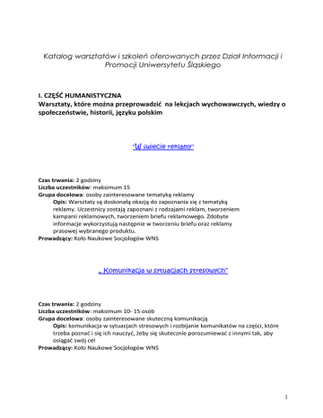Katalog warsztatów i szkoleń oferowanych przez Dział Informacji i Promocji Uniwersytetu Śląskiego I. CZĘŚĆ HUMANISTYCZNA Warsztaty, które można przeprowadzid na lekcjach wychowawczych, wiedzy o społeczeostwie, historii, języku polskim "W świecie reklamy" Czas trwania: 2 godziny Liczba uczestników: maksimum 15 Grupa docelowa: osoby zainteresowane tematyką reklamy Opis: Warsztaty są doskonałą okazją do zapoznania się z tematyką reklamy. Uczestnicy zostają zapoznani z rodzajami reklam, tworzeniem kampanii reklamowych, tworzeniem briefu reklamowego. Zdobyte informacje wykorzystują następnie w tworzeniu briefu oraz reklamy prasowej wybranego produktu. Prowadzący: Koło Naukowe Socjologów WNS „ Komunikacja w sytuacjach stresowych” Czas trwania: 2 godziny Liczba uczestników: maksimum 10- 15 osób Grupa docelowa: osoby zainteresowane skuteczną komunikacją Opis: komunikacja w sytuacjach stresowych i rozbijanie komunikatów na części, które trzeba poznad i się ich nauczyd, żeby się skutecznie porozumiewad z innymi tak, aby osiągad swój cel Prowadzący: Koło Naukowe Socjologów WNS 1 „Poznaj tajemnice swojego głosu” Czas trwania: 3 godziny Liczba uczestników: maksimum 15 Grupa docelowa: przeznaczony dla wszystkich tych, którzy w swojej przyszłości planują wykonywad zawód, w którym wymagana jest sprawnośd głosu powyżej przeciętnej: dziennikarze, prawnicy, telemarketerzy, aktorzy, śpiewacy, itp .Warsztat może byd pomocy również dla przyszłych maturzystów. Brzmienie i ton głosu jest niezwykle ważnym elementem podczas przekazu głosowego. 1. 2. 3. 4. Opis: W ramach warsztatu uczestnicy: Zapoznają się z właściwymi technikami relaksacyjno- oddechowymi. Zapoznają się z zasadami pracy nad uwalnianiem swojego głosu. Zapoznają się z zasadami poprawnej wymowy, dykcji i artykulacji. Poznają podstawy pracy z tekstem i nad tekstem /do przeczytania, wygłoszenia/. Prowadzący: Polonistyczne Koło Naukowe "Bakałarz" przy Katedrze Dydaktyki Języka i Literatury Polskiej UŚ. UWAGI: zajęcia mogą byd prowadzone w semestrze letnim „ Zarządzaj sobą w czasie” Czas trwania: 2 godziny Liczba uczestników: maksimum 10- 15 osób Grupa docelowa: osoby chcące skutecznie zarządzad sobą w czasie Opis: szkolenie dotyczące lepszego gospodarowania własnym czasem, skuteczne planowanie i realizacja zadao w ciągu dnia, tygodnia i miesiąca Prowadzący: Koło Naukowe Socjologów WNS „Negocjacje w komunikacji interpersonalnej” Czas trwania: 2 godziny Liczba uczestników: maksimum 10- 15 osób Grupa docelowa: uczniowie wszystkich zainteresowanych Opis: jak osiągnąd swój cel, bez konfliktu z drugą osobą efektywne rozwiązywanie konfliktów z wypracowywaniem najlepszych możliwości dla obu stron Prowadzący: Koło Naukowe Socjologów WNS 2 „Asertywność- to nie tylko mówienie NIE” Czas trwania: 2 godziny Liczba uczestników: maksimum 10- 15 osób Grupa docelowa: uczniowie wszystkich zainteresowanych roczników, Np. godzina wychowawcza Opis: jak odmówid, żeby nie obrazid i pozostad w zgodzie z własnym sumieniem Prowadzący: Koło Naukowe Socjologów WNS „Kreatywne myślenie- bądź kreatywny” Czas trwania: 2 godziny Liczba uczestników: maksimum 10- 15 osób Grupa docelowa: osoby chcące poznad alternatywne sposoby rozwiązywania problemów Opis: znajdź piąty, szósty, siódmy wymiar swego problemu i po prostu go rozwiąż! Twórcze warsztaty ukazujące różne metody nieschematowego podejścia do nauki, pracy i codzienności Prowadzący: Koło Naukowe Socjologów WNS „Rekrutacja-to, o co będą cię pytać kiedy zaczniesz szukać pracy” Czas trwania: 2,5 h Liczba uczestników: do 15 osób Grupa docelowa: uczniowie liceum którzy po ukooczeniu szkoły chcą zaistnied na rynku pracy, zarówno szukając stałej pracy jak i tylko dorywczego zajęcia na wakacje Opis: jak napisad dokumenty aplikacyjne i przygotowad się do rozmowy kwalifikacyjnej. W ramach warsztatów: zasady pisania CV i listu motywacyjnego, jakich pytao można się spodziewad podczas rozmowy i jak się na nie przygotowad, z jakimi innymi formami selekcji kandydatów możemy się spotkad. Prowadzący: Koło Naukowe Human Resources WNS UWAGI: jeżeli uczestnicy warsztatów napisali już swoje pierwsze CV i listy motywacyjne, prosimy aby wzięli je ze sobą. 3 „Homo niewiadomo. W poszukiwaniu tożsamości płciowej” Czas trwania: 90 min Liczba uczestników: maksimum 10- 15 osób Grupa docelowa: zajęcia proponowane dla klas maturalnych Opis: Warsztaty poświęcone zagadnieniom związanym z tożsamością płciową (rozróżnienie na płed biologiczną oraz kulturową, wprowadzenie w tematykę queer, ograniczenia i możliwości ponowoczesnego definiowania tożsamości płciowej). Prowadzący: Paulina Łuczyk, studentka Wydziału Kulturoznawstwa i Wydziału Polonistyki Uniwersytetu Śląskiego Aleksandra A.Wycisk studentka Wydziału Kulturoznawstwa i Wydziału Nauk Społecznych Uniwersytetu Śląskiego UWAGI: Ze względu na wyjazdy naukowe prowadzącej, warsztaty będą mogły odbywad się tylko w wybranych terminach. „Gdzie jest Śląsk? W poszukiwaniu regionu, dziedzictwa i tradycji.” Czas trwania: 90 min Liczba uczestników: klasa Grupa docelowa: zajęcia proponowane dla klas maturalnych Opis: Co mamy na myśli mówiąc "Śląsk"? Dlaczego aż (lub tylko!) dwa województwa odwołują się do Śląska w swojej nazwie? Dlaczego Uniwersytet Śląski jest w Katowicach a nie we Wrocławiu? Warsztaty nie tylko o kluskach, węglu i gwarze. Prowadzący: Aleksandra A. Wycisk, studentka Wydziału Kulturoznawstwa Uniwersytetu Śląskiego 4 ”Warsztaty dziennikarskie.” Czas trwania: 90 minut, jeden blok tematyczny Liczba uczestników: klasa Grupa docelowa: zajęcia proponowane dla klas maturalnych, w tym osób zainteresowanych dziennikarstwem Opis: Blok nr 1: Prawo prasowe i etyka dziennikarska – uczniowie zostaną zapoznani z prawnym aspektem pracy dziennika