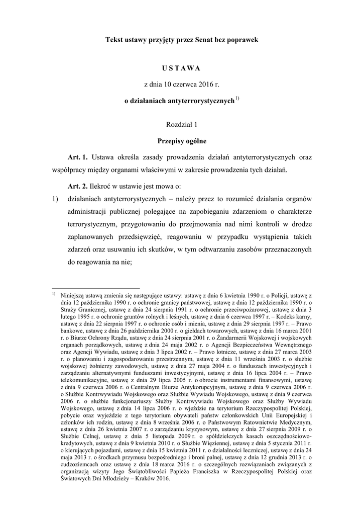 Tekst ustawy przyjęty przez Senat bez poprawek U S T AWA z dnia 10 czerwca 2016 r. o działaniach antyterrorystycznych 1) Rozdział 1 Przepisy ogólne Art. 1. Ustawa określa zasady prowadzenia działań antyterrorystycznych oraz współpracy między organami właściwymi w zakresie prowadzenia tych działań. Art. 2. Ilekroć w ustawie jest mowa o: 1) działaniach antyterrorystycznych – należy przez to rozumieć działania organów administracji publicznej polegające na zapobieganiu zdarzeniom o charakterze terrorystycznym, przygotowaniu do przejmowania nad nimi kontroli w drodze zaplanowanych przedsięwzięć, reagowaniu w przypadku wystąpienia takich zdarzeń oraz usuwaniu ich skutków, w tym odtwarzaniu zasobów przeznaczonych do reagowania na nie; 1) Niniejszą ustawą zmienia się następujące ustawy: ustawę z dnia 6 kwietnia 1990 r. o Policji, ustawę z dnia 12 października 1990 r. o ochronie granicy państwowej, ustawę z dnia 12 października 1990 r. o Straży Granicznej, ustawę z dnia 24 sierpnia 1991 r. o ochronie przeciwpożarowej, ustawę z dnia 3 lutego 1995 r. o ochronie gruntów rolnych i leśnych, ustawę z dnia 6 czerwca 1997 r. – Kodeks karny, ustawę z dnia 22 sierpnia 1997 r. o ochronie osób i mienia, ustawę z dnia 29 sierpnia 1997 r. – Prawo bankowe, ustawę z dnia 26 października 2000 r. o giełdach towarowych, ustawę z dnia 16 marca 2001 r. o Biurze Ochrony Rządu, ustawę z dnia 24 sierpnia 2001 r. o Żandarmerii Wojskowej i wojskowych organach porządkowych, ustawę z dnia 24 maja 2002 r. o Agencji Bezpieczeństwa Wewnętrznego oraz Agencji Wywiadu, ustawę z dnia 3 lipca 2002 r. – Prawo lotnicze, ustawę z dnia 27 marca 2003 r. o planowaniu i zagospodarowaniu przestrzennym, ustawę z dnia 11 września 2003 r. o służbie wojskowej żołnierzy zawodowych, ustawę z dnia 27 maja 2004 r. o funduszach inwestycyjnych i zarządzaniu alternatywnymi funduszami inwestycyjnymi, ustawę z dnia 16 lipca 2004 r. – Prawo telekomunikacyjne, ustawę z dnia 29 lipca 2005 r. o obrocie instrumentami finansowymi, ustawę z dnia 9 czerwca 2006 r. o Centralnym Biurze Antykorupcyjnym, ustawę z dnia 9 czerwca 2006 r. o Służbie Kontrwywiadu Wojskowego oraz Służbie Wywiadu Wojskowego, ustawę z dnia 9 czerwca 2006 r. o służbie funkcjonariuszy Służby Kontrwywiadu Wojskowego oraz Służby Wywiadu Wojskowego, ustawę z dnia 14 lipca 2006 r. o wjeździe na terytorium Rzeczypospolitej Polskiej, pobycie oraz wyjeździe z tego terytorium obywateli państw członkowskich Unii Europejskiej i członków ich rodzin, ustawę z dnia 8 września 2006 r. o Państwowym Ratownictwie Medycznym, ustawę z dnia 26 kwietnia 2007 r. o zarządzaniu kryzysowym, ustawę z dnia 27 sierpnia 2009 r. o Służbie Celnej, ustawę z dnia 5 listopada 2009 r. o spółdzielczych kasach oszczędnościowokredytowych, ustawę z dnia 9 kwietnia 2010 r. o Służbie Więziennej, ustawę z dnia 5 stycznia 2011 r. o kierujących pojazdami, ustawę z dnia 15 kwietnia 2011 r. o działalności leczniczej, ustawę z dnia 24 maja 2013 r. o środkach przymusu bezpośredniego i broni palnej, ustawę z dnia 12 grudnia 2013 r. o cudzoziemcach oraz ustawę z dnia 18 marca 2016 r. o szczególnych rozwiązaniach związanych z organizacją wizyty Jego Świątobliwości Papieża Franciszka w Rzeczypospolitej Polskiej oraz Światowych Dni Młodzieży – Kraków 2016. 2 2) działaniach kontrterrorystycznych – należy przez to rozumieć działania wobec sprawców, osób przygotowujących lub pomagających w dokonaniu przestępstwa o charakterze terrorystycznym, o którym mowa w art. 115 § 20 ustawy z dnia 6 czerwca 1997 r. – Kodeks karny (Dz. U. poz. 553, z późn. zm. 2)), prowadzone w celu wyeliminowania bezpośredniego zagrożenia życia, zdrowia lub wolności osób lub mienia przy wykorzystaniu specjalistycznych sił i środków oraz specjalistycznej taktyki działania; 3) infrastrukturze administracji publicznej – należy przez to rozumieć systemy oraz obiekty niezbędne dla zapewnienia bezpiecznego i ciągłego funkcjonowania organów administracji publicznej; 4) infrastrukturze krytycznej – należy przez to rozumieć infrastrukturę krytyczną, o której mowa w art. 3 pkt 2 ustawy z dnia 26 kwietnia 2007 r. o zarządzaniu kryzysowym (Dz. U. z 2013 r. poz. 1166, z 2015 r. poz. 1485 oraz z 2016 r. poz. 266); 5) Ministrze Koordynatorze Służb Specjalnych – należy przez to rozumieć Ministra – Członka Rady Ministrów, którego zakres działania, wyznaczony na podstawie art. 33 ust. 1 ustawy z dnia 8 sierpnia 1996 r. o Radzie Ministrów (Dz. U. z 2012 r. poz. 392 oraz z 2015 r. poz. 1064), obejmuje zadania związane z działalnością służb specjalnych w rozumieniu ustawy z dnia 24 maja 2002 r. o Agencji Bezpieczeństwa Wewnętrznego oraz Agencji Wywiadu (Dz. U. z 2015 r. poz. 1929 i 2023 oraz z 2016 r. poz. 147 i 437); 6) miejscu zdarzenia o charakterze terrorystycznym – należy przez to rozumieć przestrzeń otwartą lub zamkniętą, w której nastąpiło zdarzenie o charakterze terrorystycznym lub w której wystąpił lub miał wystąpić jego skutek, oraz przestrzeń, w której występują zagrożenia związane ze zdarzeniem o charakterze terrorystycznym; 7) zdarzeniu o charakterze terrorystycznym – należy przez to rozumieć sytuację, co do której istnieje podejrzenie, że powstała na skutek przestępstwa o charakterze terrorystycznym, o którym mowa w art. 115 § 20 ustawy z dnia 6 czerwca 1997 r. – Kodeks karny, lub zagrożenie zaistnienia takiego przestępstwa. 2) Zmiany wymienionej ustawy zostały ogłoszone w Dz. U. z 1997 r. poz. 840, z 1999 r. poz. 729 i 931, z 2000 r. poz. 548, 1027 i 1216, z 2001 r. poz. 1071, z 2003 r. poz. 1061, 1142, 1750, 1935 i 2255, z 2004 r. poz. 219, 626, 889 i 2426, z 2005 r. poz. 732, 757, 1109, 1363, 1479 i 1493, z 2006 r. poz. 1409, 1592 i 1648, z 2007 r. poz. 589, 850, 859 i 1378, z 2008 r. poz. 560, 782, 1056, 1080 i 1344, z 2009 r. poz. 50