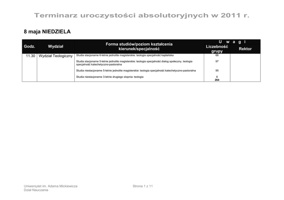 Terminarz uroczystości absolutoryjnych w 2011 r. 8 maja NIEDZIELA Godz. Forma studiów/poziom kształcenia kierunek/specjalność Wydział 11.30 Wydział Teologiczny U w a g i Liczebność Rektor grupy Studia stacjonarne 6-letnie jednolite magisterskie: teologia specjalność kapłańska 66 Studia stacjonarne 5-letnie jednolite magisterskie: teologia specjalność dialog społeczny, teologia specjalność katechetyczno-pastoralna 97 Studia niestacjonarne 5-letnie jednolite magisterskie: teologia specjalność katechetyczno-pastoralna 95 Studia niestacjonarne 3-letnie drugiego stopnia: teologia 6 264 Uniwersytet im. Adama Mickiewicza Dział Nauczania Strona 1 z 11 Terminarz uroczystości absolutoryjnych w 2011 r. 14 maja SOBOTA Godz. Forma studiów/poziom kształcenia kierunek/specjalność Wydział 9.00 Wydział Nauk Geograficznych i Geologicznych 11.30 Wydział Nauk Geograficznych i Geologicznych 14.00 Wydział Nauk Geograficznych i Geologicznych U w a g i Liczebność Rektor grupy Studia stacjonarne 5-letnie jednolite magisterskie: geografia, geografia specjalność geoinformacja, geografia specjalność kształtowanie środowiska przyrodniczego 142 Studia niestacjonarne 5-letnie jednolite magisterskie: geografia Studia stacjonarne 5-letnie jednolite magisterskie: gospodarka przestrzenna 48 190 64 Studia stacjonarne 2-letnie drugiego stopnia: geologia 74 Studia niestacjonarne 5-letnie jednolite magisterskie: gospodarka przestrzenna Studia stacjonarne 5-letnie jednolite magisterskie: turystyka i rekreacja 44 182 110 Studia niestacjonarne 5-letnie jednolite magisterskie: turystyka i rekreacja 121 Studia niestacjonarne 2-letnie drugiego stopnia: turystyka i rekreacja 54 285 Uniwersytet im. Adama Mickiewicza Dział Nauczania Strona 2 z 11 Terminarz uroczystości absolutoryjnych w 2011 r. 15 maja NIEDZIELA Godz. Forma studiów/poziom kształcenia kierunek/specjalność Wydział 9.00 Wydział Nauk Społecznych 11.30 Wydział Nauk Społecznych 14.00 Wydział Nauk Społecznych 16.30 Wydział Nauk Społecznych U w a g i Liczebność Rektor grupy Studia stacjonarne 5-letnie jednolite magisterskie: kognitywistyka, psychologia 209 Studia niestacjonarne (wieczorowe) 5-letnie jednolite magisterskie: psychologia 82 Studia niestacjonarne (zaoczne) 3-letnie jednolite magisterskie: psychologia Studia stacjonarne 5-letnie jednolite magisterskie: socjologia 149 440 90 Studia stacjonarne 2-letnie drugiego stopnia: socjologia 51 Studia stacjonarne 3-letnie pierwszego stopnia: praca socjalna, socjologia 131 Studia niestacjonarne 5-letnie jednolite magisterskie: socjologia 94 Studia niestacjonarne 2-letnie drugiego stopnia: socjologia 74 Studia niestacjonarne 3-letnie pierwszego stopnia: socjologia 52 492 157 Studia stacjonarne 5-letnie jednolite magisterskie: filozofia, filozofia specjalność komunikacja społeczna, filozofia specjalność życie publiczne Studia stacjonarne 3-letnie pierwszego stopnia: filozofia, filozofia specjalność komunikacja społeczna, filozofia specjalność życie publiczne 123 Studia niestacjonarne 5-letnie jednolite magisterskie: filozofia specjalność komunikacja społeczna 73 Studia niestacjonarne 3-letnie pierwszego stopnia: filozofia specjalność komunikacja społeczna 61 Studia niestacjonarne 2-letnie drugiego stopnia: filozofia specjalność komunikacja społeczna Studia stacjonarne 5-letnie jednolite magisterskie: kulturoznawstwo 23 437 120 Studia stacjonarne 3-letnie pierwszego stopnia: kulturoznawstwo 83 Studia niestacjonarne 3-letnie pierwszego stopnia: kulturoznawstwo 48 Studia niestacjonarne 2-letnie drugiego stopnia: kulturoznawstwo 178 429 Uniwersytet im. Adama Mickiewicza Dział Nauczania Strona 3 z 11 Terminarz uroczystości absolutoryjnych w 2011 r. 22 maja NIEDZIELA Godz. Forma studiów/poziom kształcenia kierunek/specjalność Wydział 9.00 Wydział Fizyki U w a g i Liczebność Rektor grupy Studia stacjonarne 5-letnie jednolite magisterskie: astronomia, fizyka, fizyka specjalność fizyka medyczna, fizyka specjalność informatyka stosowana, fizyka specjalność nanotechnologia 54 Studia stacjonarne 3-letnie pierwszego stopnia: akustyka specjalność protetyka słuchu i ochrona przed hałasem, akustyka specjalność reżyseria dźwięku, astronomia specjalność astronomia i zastosowania sztucznych satelitów, astronomia specjalność astronomia z informatyką, biofizyka specjalność biofizyka molekularna, biofizyka specjalność fizyka medyczna, biofizyka specjalność optyka okularowa, fizyka specjalność fizyka ogólna, fizyka specjalność informatyka stosowana, fizyka specjalność nanotechnologia 130 Studia stacjonarne 2-letnie drugiego stopnia: akustyka, fizyka specjalność optometria, techniczne zastosowania Internetu 66 31 Studia niestacjonarne 3-letnie pierwszego stopnia: akustyka specjalność protetyka słuchu, biofizyka specjalność optyka okularowa 11.30 Wydział Matematyki i Informatyki Studia niestacjonarne 2-letnie drugiego stopnia: akustyka, fizyka specjalność optometria Studia stacjonarne 5-letnie jednolite magisterskie: informatyka, matematyka 23 304 234 Studia niestacjonarne 5-letnie jednolite magisterskie: matematyka 20 Studia niestacjonarne 2-letnie drugiego stopnia: informatyka 25 279 301 14.00 Wydział Filologii Polskiej i Klasycznej Studia stacjonarne 5-letnie jednolite magisterskie: filologia polska; filologia polska specjalność filmoznawstwo, telewizja i kultura medialna; wiedza o teatrze 16.30 Wydział Filologii Polskiej i Klasycznej Studia stacjonarne 5-letnie jednolite magisterskie: filologia specjalność filologia klasyczna i filologia polska, filologia specjalność filologia słowiańska i filologia polska Studia stacjonarne 2-letnie drugiego stopnia: filologia polska 31 332 28 Studia stacjonarne 2-letnie drugiego stopnia: filologia specjalność filologia bułgarska, filologia specjalność filologia chorwacka i filologia serbska, filologia specjalność filologia klasyczna, filologia specjalność filologia se