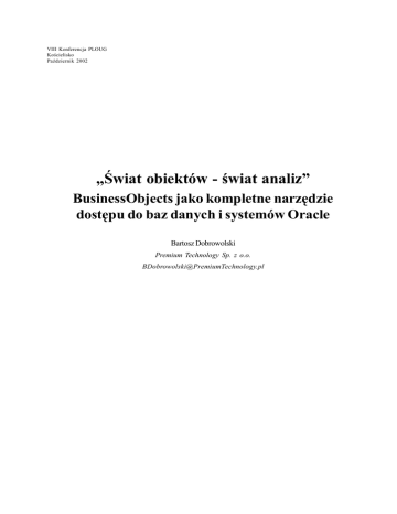 VIII Konferencja PLOUG Koœcielisko PaŸdziernik 2002 „Œwiat obiektów - œwiat analiz” BusinessObjects jako kompletne narzêdzie dostêpu do baz danych i systemów Oracle Bartosz Dobrowolski Premium Technology Sp. z o.o. [email protected] „Świat obiektów – świat analiz” 211 1. Na początku był chaos W piękny, letni, sobotni poranek, w Paryżu, o godzinie 9:30 w mieszkaniu pewnego młodego człowieka przez cichy szum miasta i szelest rosnącej nieopodal domu brzozy dało się słyszeć głośne brzęczenie telefonu. Długo i uparcie próbował on wedrzeć się pod ciężkie po kolejnej nieprzespanej nocy powieki Bernarda Liautaud’a. Kolejnej nocy programowania, kompilowania, testowania, programowania, testowania. Kolejnej, od dnia kiedy przy szklaneczce czerwonego wina wspólnie z kilkoma kolegami postanowił stworzyć jakiś kawałek kodu, który pozwoli tym z Departamentu Analiz dostawać się do serwera ORACLE wtedy kiedy będą chcieli i to bez żadnej pomocy IT. Kawałek kodu, który pozwoli wreszcie tym z Marketingu przewracać dane na wszystkie sposoby bez znajomości SQL’a. Kawałek kodu – dobre sobie. Siedzą nad tym kolejny tydzień. Pomysł jest genialny w swej prostocie. Skoro tylko IT zna język SQL to pozostałym trzeba jakoś przetłumaczyć bazę danych....a bazie danych wytłumaczyć to czego chcą użytkownicy. Mają nawet nazwę dla takiego słownika: angielskie Universe czyli wszechświat, bo dla takiej Claire z Kadr to przecież jak wyprawa w kosmos, tak sobie rozmawiać z bazą danych. Przed nimi jeszcze masa pracy. Teraz spał. Telefon najprawdopodobniej nie zdawał sobie sprawy z tego, że skoro złote promienie zawieszonej nad miastem ognistej gwiazdy nie były w stanie dokonać cudu przebudzenia to on, zwykły kawałek czarnego plastiku, pozostaje bez szans. Kiedy wreszcie postanowił poddać się i pokonany zamilknąć spod kraciastej kołdry wysunęła się leniwie ręka, słuchawka podskoczyła i Bernard usłyszał roześmiane głosy swoich kolegów: ”Udało się! Bernard! Odpowiedziała! Baza widzi nasz świat, nasz Universe!”. 2. Wszechświat Było to dokładnie dwanaście lat temu w 1990 roku. Wtedy to Bernard Laiutaud wraz z kolegami stworzył niezwykle ciekawą aplikację pozwalającą zwykłym, nietechnicznym użytkownikom sięgnąć do wszystkich źródeł danych znajdujących się w przedsiębiorstwie. Sięgnąć samodzielnie. Bez pomocy kolegów informatyków. Bez konieczności kłopotliwego zamawiania raportów. Ponieważ aplikacja pozwalała jakoby „przeskoczyć” znajomość baz danych, języka SQL, architektury i zabezpieczeń systemu bazodanowego użytkownika autorzy systemu nazwali go początkowo Skipper SQL. Dopiero wersja trzecia została przemianowana na BusinessObjects. Bernard Liautaud jest teraz prezesem notowanego na giełdach Business Objects, korporacji która zatrudnia obecnie ponad 3000 pracowników w samej kwaterze głównej w Paryżu, posiada ponadto biura w ponad 40 krajach, nowoczesne centrum wsparcia technicznego w Londynie oraz setki partnerskich firm na całym świecie. Z systemu BusinessObjects korzysta na świecie ponad 1 200 000 użytkowników. W roku 1990, podczas pracy nad swym systemem raportowym zespół Bernarda wynalazł i opatentował nowatorski sposób dostępu do danych oparty o warstwę semantyczną tłumaczącą język używany w codziennym życiu przez użytkowników na język rozumiany przez bazy danych – SQL. Warstwa ta, nazwana przez twórców Universe, została przetłumaczona na tyle języków ile wersji językowych aplikacji pojawiło się na rynku. Premium Technology tłumacząc pierwszą polską wersję systemu na podstawie badań przeprowadzonych wśród użytkowników angielskiej wersji oprogramowania wybrało nazwę Świat Obiektów. 212 Bartosz Dobrowolski Rys. 1. Przykładowy Świat Obiektów niewielkiego biura turystycznego. Te obiekty widzi użytkownik końcowy i z nich buduje raporty Mimo zaawansowanego mechanizmu tłumaczącego pojęcia biznesowe na język SQL sama zasada działania Świata Obiektów jest bardzo prosta. Świat Obiektów to niewielki binarny plik (~10-400KB), który zawiera obraz struktury bazy danych, definicję pogrupowanych w tematyczne klasy obiektów (z nich później użytkownik końcowy buduje raporty), konfigurację połączenia do bazy danych, oraz dodatkowe informacje potrzebne do prawidłowego zbudowania i wykonania raportu (definicję hierarchii drążenia, format danych wynikowych, domyślne czcionki, kolory, etc). Świat obiektów nie zawiera danych źródłowych a jedynie wskazuje źródłową bazę danych i umożliwia połączenie z nią i wygenerowanie zapytania SQL na podstawie wybranej do zapytania kombinacji obiektów. 3. Stworzenie Świata Administrator systemu przy pomocy graficznego narzędzia Designer jednorazowo tłumaczy bazę danych na słowa (obiekty) a następnie udostępnia użytkownikom gotowy Świat Obiektów, z którego jak z klocków lego można budować dowolne zestawienia z zachowaniem istniejącej polityki bezpieczeństwa firmy. Niezwykle prosty i intuicyjny proces tłumaczenia przebiega w kilku krokach wspieranych kreatorami (Kreator Świata Obiektów, Wykrywanie Pętli, Wykrywanie Połączeń, Wykrywanie Krotności, etc.) oraz wewnętrznymi mechanizmami kontroli poprawności (Kontrola Składni, Kontrola Struktury, Kontrola Kontektowa, etc.). Dzięki temu projektant udostępniając Świat Obiektów użytkownikom ma pewność, że generowany przez BusinessObjects SQL będzie poprawny. • Kroki prowadzące do stworzenia efektywnego Świata Obiektów to: • Połączenie z bazą danych • Odwzorowanie (fragmentu lub całości) struktury bazy danych • Przetłumaczenie struktury na słowa (obiekty) • Udostępnienie gotowego Świata Obiektów użytkownikom „Świat obiektów – świat analiz” 213 Połączenie z bazą danych odbywa się za pośrednictwem sterowników dedykowanych (Oracle, DB2, Informix, Terad