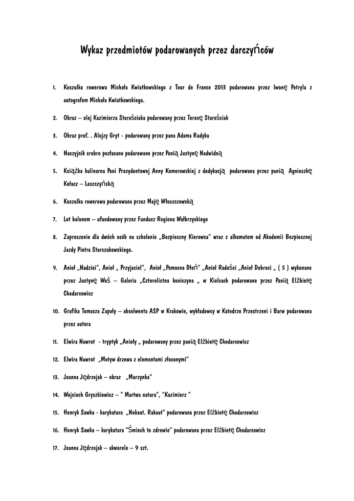Wykaz przedmiotów podarowanych przez darczyńców 1. Koszulka rowerowa Michała Kwiatkowskiego z Tour de France 2013 podarowana przez Iwonę Petryla z autografem Michała Kwiatkowskiego. 2. Obraz – olej Kazimierza Starościaka podarowany przez Teresę Starościak 3. Obraz prof. . Alojzy Gryt - podarowany przez pana Adama Rudyka 4. Naszyjnik srebro pozłacane podarowane przez Panią Justynę Nadwidną 5. Książka kulinarna Pani Prezydentowej Anny Komorowskiej z dedykacją podarowana przez panią Agnieszkę Kołacz – Leszczyńską 6. Koszulka rowerowa podarowana przez Maję Włoszczowską 7. Lot balonem – ufundowany przez Fundusz Regionu Wałbrzyskiego 8. Zaproszenie dla dwóch osób na szkolenie „Bezpieczny Kierowca” wraz z alkomatem od Akademii Bezpiecznej Jazdy Piotra Starczukowskiego. 9. Anioł „Nadziei”, Anioł „ Przyjaciel”, Anioł „Pomocna Dłoń” „Anioł Radości „Anioł Dobroci „ ( 5 ) wykonane przez Justynę Woś – Galeria „Czterolistna koniczyna „ w Kielcach podarowane przez Panią Elżbietę Chodarcewicz 10. Grafika Tomasza Zapały – absolwenta ASP w Krakowie, wykładowcy w Katedrze Przestrzeni i Barw podarowana przez autora 11. Elwira Nawrot - tryptyk „Anioły „ podarowany przez panią Elżbietę Chodarcewicz 12. Elwira Nawrot „Motyw drzewa z elementami złoconymi” 13. Joanna Jędrzejak – obraz „Murzynka” 14. Wojciech Gryszkiewicz – ” Martwa natura”, ”Kazimierz ” 15. Henryk Sawka - karykatura „Nokaut. Rakaut” podarowana przez Elżbietę Chodarcewicz 16. Henryk Sawka – karykatura ”Śmiech to zdrowie” podarowana przez Elżbietę Chodarcewicz 17. Joanna Jędrzejak – akwarele – 9 szt. 18. Pisanki ceramiczne ozdobione przez wałbrzyskich artystów plastyków: - Barbara Mucha – Brodzińska - Janina Sakowicz - Krzysztof Jędrzejec - Halina Jasionowska - Jan Pałka - Magdalena Głocka - Stanisław Możdżeń - Marzena Prokopowicz – Sawicka - Alfred Oruba - Zofia Czerw - Eugeniusz Kiszczak - Małgorzata Laszczak - Cyryl Bartkowiak - Wojciech Jodłowski - Alicja Karwala - Piotr Puterko - Agnieszka Hundert – Wawrzyniak - Norbert Wawrzyniak - Barbara Sałaga - Krzysztof Ślaziński - Małgorzata Rzempowska - Monika Pałka - Ilona Sapka - Magdalena Siejko - Alicja Gorbacz – Palacios 20. Przedmioty podarowane przez Panią Beatę Wojciechowską – choreografa, tancerkę, reżysera m.in. Teatru Narodowego i Dramatycznego w Warszawie: obraz „Japonka „ , zestaw stołowy japoński, talizman wieczności i pomyślności związku Cesarza Chin, znak Feng-shui, 21. Płyta Zespołu AUDIO FEELS, fotografia z dedykacją podarowana przez Panią Elżbietę Chodarcewicz 22. Bogumiła Wiernicka - olej na płycie „Słoneczniki” 23. Bogumiła Wiernicka – akwarele – kwiaty – 3 szt 24. Bogumiła Wiernicka – „Błękitny pejzaż „ 25. Bogumiła Wiernicka – „ Jesień w kolorach wrzosu „ podarowany przez autorkę 26. Płaskorzeźba Św.Jan Paweł II podarowany przez Prałata ks. Andrzeja Raszplę 27. Roberta Myszkowska – fotografie – 9 szt 28. Niciane aniołki podarowane przez panią Karolinę Rudyk. 29. Przedmioty podarowane przez Panią Beatę Wojciechowską – choreografa, tancerkę, reżysera, Teatru Narodowego i Dramatycznego w Warszawie 30. Książki podarowane przez: - Burmistrza Szczawna Zdrój - Warsztaty Terapii Zajęciowej ul. Nałkowskiej - Komendę Miejską Państwowej Straży Pożarnej - Zastępcę Prezydenta Miasta Wałbrzycha - Powiatowa Stacja Sanitarno-Epidemiologiczna - Zespól Szkół Technicznych - AQUA – ZDRÓJ - Komisariat Policji I w Wałbrzychu -Urząd celny w Wałbrzychu - Warsztat Terapii zajęciowej przy PSP Specjalnej Nr 10 w Wałbrzychu - Uzdrowisko Szczawno – Jedlina