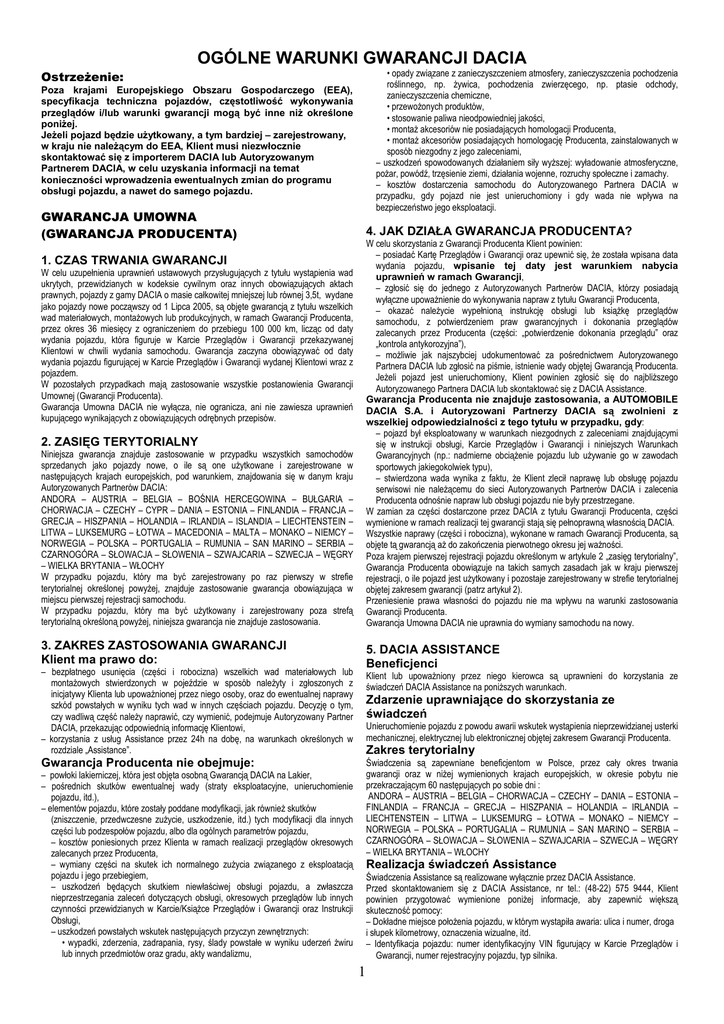OGÓLNE WARUNKI GWARANCJI DACIA • opady związane z zanieczyszczeniem atmosfery, zanieczyszczenia pochodzenia roślinnego, np. Ŝywica, pochodzenia zwierzęcego, np. ptasie odchody, zanieczyszczenia chemiczne, • przewoŜonych produktów, • stosowanie paliwa nieodpowiedniej jakości, • montaŜ akcesoriów nie posiadających homologacji Producenta, • montaŜ akcesoriów posiadających homologację Producenta, zainstalowanych w sposób niezgodny z jego zaleceniami, – uszkodzeń spowodowanych działaniem siły wyŜszej: wyładowanie atmosferyczne, poŜar, powódź, trzęsienie ziemi, działania wojenne, rozruchy społeczne i zamachy. – kosztów dostarczenia samochodu do Autoryzowanego Partnera DACIA w przypadku, gdy pojazd nie jest unieruchomiony i gdy wada nie wpływa na bezpieczeństwo jego eksploatacji. OstrzeŜenie: Poza krajami Europejskiego Obszaru Gospodarczego (EEA), specyfikacja techniczna pojazdów, częstotliwość wykonywania przeglądów i/lub warunki gwarancji mogą być inne niŜ określone poniŜej. JeŜeli pojazd będzie uŜytkowany, a tym bardziej – zarejestrowany, w kraju nie naleŜącym do EEA, Klient musi niezwłocznie skontaktować się z importerem DACIA lub Autoryzowanym Partnerem DACIA, w celu uzyskania informacji na temat konieczności wprowadzenia ewentualnych zmian do programu obsługi pojazdu, a nawet do samego pojazdu. GWARANCJA UMOWNA (GWARANCJA PRODUCENTA) 4. JAK DZIAŁA GWARANCJA PRODUCENTA? Niniejsza gwarancja znajduje zastosowanie w przypadku wszystkich samochodów sprzedanych jako pojazdy nowe, o ile są one uŜytkowane i zarejestrowane w następujących krajach europejskich, pod warunkiem, znajdowania się w danym kraju Autoryzowanych Partnerów DACIA: ANDORA – AUSTRIA – BELGIA – BOŚNIA HERCEGOWINA – BUŁGARIA – CHORWACJA – CZECHY – CYPR – DANIA – ESTONIA – FINLANDIA – FRANCJA – GRECJA – HISZPANIA – HOLANDIA – IRLANDIA – ISLANDIA – LIECHTENSTEIN – LITWA – LUKSEMURG – ŁOTWA – MACEDONIA – MALTA – MONAKO – NIEMCY – NORWEGIA – POLSKA – PORTUGALIA – RUMUNIA – SAN MARINO – SERBIA – CZARNOGÓRA – SŁOWACJA – SŁOWENIA – SZWAJCARIA – SZWECJA – WĘGRY – WIELKA BRYTANIA – WŁOCHY W przypadku pojazdu, który ma być zarejestrowany po raz pierwszy w strefie terytorialnej określonej powyŜej, znajduje zastosowanie gwarancja obowiązująca w miejscu pierwszej rejestracji samochodu. W przypadku pojazdu, który ma być uŜytkowany i zarejestrowany poza strefą terytorialną określoną powyŜej, niniejsza gwarancja nie znajduje zastosowania. W celu skorzystania z Gwarancji Producenta Klient powinien: – posiadać Kartę Przeglądów i Gwarancji oraz upewnić się, Ŝe została wpisana data wydania pojazdu, wpisanie tej daty jest warunkiem nabycia uprawnień w ramach Gwarancji, – zgłosić się do jednego z Autoryzowanych Partnerów DACIA, którzy posiadają wyłączne upowaŜnienie do wykonywania napraw z tytułu Gwarancji Producenta, – okazać naleŜycie wypełnioną instrukcję obsługi lub ksiąŜkę przeglądów samochodu, z potwierdzeniem praw gwarancyjnych i dokonania przeglądów zalecanych przez Producenta (części: „potwierdzenie dokonania przeglądu” oraz „kontrola antykorozyjna”), – moŜliwie jak najszybciej udokumentować za pośrednictwem Autoryzowanego Partnera DACIA lub zgłosić na piśmie, istnienie wady objętej Gwarancją Producenta. JeŜeli pojazd jest unieruchomiony, Klient powinien zgłosić się do najbliŜszego Autoryzowanego Partnera DACIA lub skontaktować się z DACIA Assistance. Gwarancja Producenta nie znajduje zastosowania, a AUTOMOBILE DACIA S.A. i Autoryzowani Partnerzy DACIA są zwolnieni z wszelkiej odpowiedzialności z tego tytułu w przypadku, gdy: – pojazd był eksploatowany w warunkach niezgodnych z zaleceniami znajdującymi się w instrukcji obsługi, Karcie Przeglądów i Gwarancji i niniejszych Warunkach Gwarancyjnych (np.: nadmierne obciąŜenie pojazdu lub uŜywanie go w zawodach sportowych jakiegokolwiek typu), – stwierdzona wada wynika z faktu, Ŝe Klient zlecił naprawę lub obsługę pojazdu serwisowi nie naleŜącemu do sieci Autoryzowanych Partnerów DACIA i zalecenia Producenta odnośnie napraw lub obsługi pojazdu nie były przestrzegane. W zamian za części dostarczone przez DACIA z tytułu Gwarancji Producenta, części wymienione w ramach realizacji tej gwarancji stają się pełnoprawną własnością DACIA. Wszystkie naprawy (części i robocizna), wykonane w ramach Gwarancji Producenta, są objęte tą gwarancją aŜ do zakończenia pierwotnego okresu jej waŜności. Poza krajem pierwszej rejestracji pojazdu określonym w artykule 2 „zasięg terytorialny”, Gwarancja Producenta obowiązuje na takich samych zasadach jak w kraju pierwszej rejestracji, o ile pojazd jest uŜytkowany i pozostaje zarejestrowany w strefie terytorialnej objętej zakresem gwarancji (patrz artykuł 2). Przeniesienie prawa własności do pojazdu nie ma wpływu na warunki zastosowania Gwarancji Producenta. Gwarancja Umowna DACIA nie uprawnia do wymiany samochodu na nowy. 3. ZAKRES ZASTOSOWANIA GWARANCJI Klient ma prawo do: 5. DACIA ASSISTANCE Beneficjenci 1. CZAS TRWANIA GWARANCJI W celu uzupełnienia uprawnień ustawowych przysługujących z tytułu wystąpienia wad ukrytych, przewidzianych w kodeksie cywilnym oraz innych obowiązujących aktach prawnych, pojazdy z gamy DACIA o masie całkowitej mniejszej lub równej 3,5t, wydane jako pojazdy nowe począwszy od 1 Lipca 2005, są objęte gwarancją z tytułu wszelkich wad materiałowych, montaŜowych lub produkcyjnych, w ramach Gwarancji Producenta, przez okres 36 miesięcy z ograniczeniem do przebiegu 100 000 km, licząc od daty wydania pojazdu, która figuruje w Karcie Przeglądów i Gwarancji przekazywanej Klientowi w chwili wydania samochodu. Gwarancja zaczyna obowiązywać od daty wydania pojazdu figurującej w Karcie Przeglądów i Gwarancji wydanej Klientowi wraz z poja