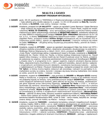 MALTA i GOZO (RAMOWY PROGRAM WYCIECZKI) 1 DZIEŃ godz. 09:45 spotkanie w TERMINALU A Międzynarodowego Lotniska w WARSZAWIE – hala odlotów przy strefie odpraw D, w godz. 11:45-14:50 przelot na MALTĘ, transfer do hotelu w SLIEMIE, czas wolny; kolacja i nocleg, 2 DZIEŃ śniadanie, przejazd do LA VALLETTY – spacer po ogrodach Lower Barracca i Upper Barracca – skąd roztacza się wspaniała panorama Wielkiego Portu i Trzech Miast, wyjazd do wioski rybackiej WIED IŻ-ŻURRIEQ – przy sprzyjającej pogodzie wycieczka łodzią wzdłuż malowniczych klifów południowego wybrzeża do BŁĘKITNEJ GROTY, zwiedzanie wpisanych na Listę UNESCO megalitycznych świątyń HAGAR QIM i MNAJDRA datowanych na IV i III tys. p.n.e., w okolicy SIĠĠIEWI obejrzenie tajemniczych kolein – jednej z największych zagadek Malty, przejazd wzdłuż Klifów Dingli wznoszących się na wysokość 253 m (najwyższy punkt Malty), spacer po ogrodach Buskett, z których roztacza się widok na pałac VERDALA – oficjalną letnią rezydencję prezydenta Malty; powrót do hotelu – kolacja i nocleg, 3 DZIEŃ śniadanie, wyjazd do ATTARD – spacer po ogrodach otaczających Pałac San Anton (od 1974 r. oficjalna siedziba prezydenta Malty), obejrzenie akweduktu zbudowanego na polecenie Wielkiego Mistrza Wignacourta w latach 1610–1614, przejazd do MOSTY – zwiedzanie „Cudu Mosty” zwieńczonego jedną z największych kopuł w Europie, zwiedzanie w RABACIE katakumb św. Pawła i Groty św. Pawła, w której według miejscowej tradycji św. Paweł spędził kilka miesięcy i w której modlił się Jan Paweł II podczas wizyt na Malcie, przejście do położonej na wzgórzu i otoczonej pierścieniem średniowiecznych fortyfikacjami MDINY („miasta ciszy”), w programie m.in.: spacer wąskimi, krętymi uliczkami dawnej stolicy Malty, obejrzenie bramy triumfalnej z 1724 r., pięknych kościołów, starych domów i pałaców z oryginalnymi architektonicznymi detalami, zwiedzanie barokowej katedry – jednej z najładniejszych na Malcie i Muzeum Katedralnego, następnie przejazd do wioski rzemiosła TA’ QALI, w której można będzie zobaczyć jak powstają i zakupić na pamiątkę m.in. maltańskie wyroby ze srebra, koronki i cieszące się dużą renomą maltańskie mini dzieła ze szkła; powrót do hotelu – kolacja i nocleg, 4 DZIEŃ śniadanie, wyjazd do CIRKEWWY – rejs promem do MGARR na Wyspie GOZO zwanej Maltą w miniaturze, w programie: XEWKIJA ROTUNDA z trzecią co do wielkości niczym nie podpartą kopułą na świecie, ruiny prehistorycznych świątyń GGANTIJA – najstarszych, wolno stojących kamiennych budowli, jakie odkryto do tej pory na świecie, zbudowanych jak głosi legenda przez olbrzymkę Ggantiję, wiatrak Ta’ Kola z 1725 r., w którym zachowały się ramiona i drewniane mechanizmy, jaskinia Ninu mieszcząca się w piwnicy domu mieszkalnego, cuda natury na WYBRZEŻU DWEJRA (Lazurowe Okno – monumentalna wapienna arkada, Skała Grzyba – pilnie strzeżona w czasach joannitów ze względu na porastającą ją roślinę o wyjątkowych właściwościach leczniczych i Wewnętrzne Morze – zbiornik ze słoną wodą, otoczony wysokimi wapiennymi klifami), VICTORIA/RABAT – stolica Gozo (spacer po murach cytadeli, skąd roztacza się widok na wyspę, XVII-wieczna barokowa katedra Wniebowzięcia NMP, rynek It-Tokk – serce miasta, bazylika św. Jerzego zwana złotą); powrót do hotelu na Malcie – kolacja i nocleg, 5 DZIEŃ śniadanie, wyjazd do TARXIEN – zwiedzanie kompleksu czterech megalitycznych świątyń z okresu między 3600 a 2500 r. p.n.e. (jeśli zostaną udostępnione po ukończeniu budowy zadaszenia nad świątyniami), zwiedzanie TRZECH MIAST: VITTORIOSY – pierwszej siedziby zakonu joannitów, gdzie zachowały się reprezentacyjne budowle z tego okresu m.in.: fort św. Anioła – najpotężniejsza twierdza joannitów, kościół św. Wawrzyńca, Pałac Inkwizytora z 1535 r. i oberże rycerskie, COSPICUI z Margherita Lines – pierścieniem bastionów z bogato zdobionymi bramami triumfalnymi, SENGLEI – jednego z najstarszych miast Malty i jednego z najsilniej ufortyfikowanych miejsc na wyspie, położonej na wąskim półwyspie z malowniczym nabrzeżem, czas wolny w wiosce MARSAXLOKK uważanej za najładniejszą wioskę rybacką na Malcie, przejazd do BIRŻEBBUĠI – zwiedzanie Jaskini Ciemności (Ghar Dalam), w której odkryto ludzkie i zwierzęce szczątki z okresu fenickiego (I w. p.n.e.), fragmenty ceramiki oraz szczątki zwierząt domowych z neolitu (5200-4500 r. p.n.e.), skamieniałe szkielety, rogi i zęby jeleni, niedźwiedzi, karłowatych hipopotamów i słoni z okresu plejstocenu (1,8 mln – 11 tys. lat temu); powrót do hotelu – kolacja i nocleg, 6 DZIEŃ śniadanie, wyjazd do NAXXAR – zwiedzanie Pałacu Parisio – jednej z najpiękniejszych rezydencji zamożnych rodów maltańskich, przejazd do MGARR – obejrzenie słynącego z owalnej kopuły kościoła NMP oraz znajdujących się na Liście UNESCO ruin megalitycznych świątyń TA' HAGRAT i SKORBA datowanych na IV i III tysiąclecie p.n.e., przejazd do położonej wśród pięknych krajobrazów Złotej Zatoki otoczonej złotordzawymi klifami oraz jedną z najładniejszych i najpopularniejszych plaż na Malcie, wizyta w wiosce POPEYE nad Zatoką Kotwic, zbudowanej na potrzeby kręconego w 1980 r. filmu Popeye, przejazd wzdłuż plaży Ghadira (Melieha Bay) – najdłuższej piaszczystej plaży na Malcie oraz zatoki św. Pawła i zatoki Spinola do SLIEMY – głównego ośrodka turystycznego Malty – czas wolny; kolacja i nocleg w hotelu, 7 DZIEŃ śniadanie, rejs promem do LA VALLETTY – zwiedzanie wzniesionej przez joannitów stolicy Malty, najpiękniejszego miasta obronnego w Europie, w programie m.in.: XVI-wieczna katedra św. Jana – arcydzieło baroku z bogato zdobionym wnętrzem, Pałac Wielkiego Mistrza – obecnie siedziba urzędu prezydenta i parlamentu Malty, Teatr Manoel – perł