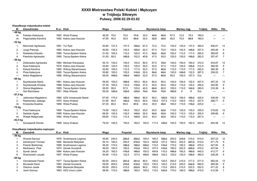 XXXII Mistrzostwa Polski Kobiet i Mężczyzn w Trójboju Siłowym Puławy, 2008.02.29-03.02 Klasyfikacja indywidualna kobiet M. Zawodniczka - 48 kg nk Feledyn Katarzyna nk Pogorzelska Karolina - 52 kg 1. Marciniak Agnieszka 2. Jurga Patrycja 3. Rzetelska Klaudia 4. Pawlicka Agnieszka - 56 kg 1. Ziolkowska Agnieszka 2. Sysa Katarzyna 3. Kalwat Karolina 4. Pluta Katarzyna — Nobis Magdalena - 60 kg 1. Szymkowiak Maria 2. Szymkowiak Wioleta 3. Sloma Magdalena — Gal Stanislawa - 67,5 kg 1. Jablonska Magdalena 2. Radwanska Jadwiga nk Krzesicka Ewelina - 75 kg 1. Pulut Katarzyna 2. Sedziak Agata nk Wiejak Malgorzata - 82,5 kg 1. Szczepanik Dorota Klasyfikacja indywidualna mężczyzn M. Zawodnik - 56 kg 1. Wszola Dariusz 2. Zambrzycki Tomasz 3. Polecki Bartlomiej 4. Markiewicz Piotr 5. Synak Jakub 6. Wasniowski Leszek - 60 kg 1. Osmialowski Pawel 2. Murawski Karol 3. Olechno Jacek 4. Janik Dariusz R.ur. Klub Waga Przysiad Wyciskanie leżąc 1993 Wisla Pulawy 1992 Kobra-Jass Koscian 46,50 47,50 70,0 45,0 75,0 55,0 77,5 60,0 35,0 30,0 40,0 32,5 40,0 32,5 67,5 65,0 72,5 75,0 75,0 85,0 1981 Tur Ryki 50,80 137,5 147,5 150,0 67,5 72,5 75,0 130,0 135,0 1982 Kobra-Jass Koscian 1986 Tecza-Spolem Kielce 1985 Tecza-Spolem Kielce 50,60 51,00 51,00 135,0 105,0 95,0 145,0 115,0 102,5 150,0 120,0 102,5 62,5 47,5 47,5 67,5 52,5 47,5 70,0 52,5 50,0 130,0 105,0 125,0 142,5 112,5 130,0 1984 1978 1985 1985 1986 Michael Warszawa Kobra-Jass Koscian Wiking Starachowice Tecza-Spolem Kielce Wiking Starachowice 55,10 53,60 52,80 55,80 56,00 130,0 120,0 105,0 100,0 105,0 140,0 130,0 112,5 105,0 105,0 145,0 135,0 117,5 115,0 105,0 60,0 50,0 52,5 50,0 52,5 67,5 52,5 57,5 55,0 57,5 70,0 57,5 60,0 55,0 60,0 140,0 110,0 110,0 120,0 95,0 1961 1988 1985 1961 Kobra-Jass Koscian Kobra-Jass Koscian Tecza-Spolem Kielce Atlas Wesola 59,50 57,30 58,50 59,30 155,0 100,0 95,0 120,0 165,0 110,0 97,5 120,0 165,0 115,0 105,0 120,0 80,0 47,5 40,0 70,0 85,0 55,0 60,0 70,0 90,0 60,0 60,0 70,0 1985 AZS Uniwersytet Slaski 1975 Azory Krakow 1989 Wisla Pulawy 67,00 61,60 67,30 175,0 90,0 80,0 185,0 100,0 85,0 185,0 100,0 87,5 80,0 90,0 25,0 90,0 100,0 30,0 1990 Tecza-Spolem Kielce 1989 Kobra-Jass Koscian 1992 Wisla Pulawy 74,50 68,00 69,80 130,0 120,0 110,0 140,0 130,0 112,5 150,0 140,0 120,0 45,0 50,0 35,0 1969 Azory Krakow 79,30 140,0 150,0 160,0 100,0 R.ur. Klub Waga 1978 1985 1988 1974 1984 1957 Srodmiescie Legnica Bacieczki Bialystok Srodmiescie Legnica Zamek Kurzetnik Kobra-Jass Koscian Wisla Pulawy 55,80 55,10 56,00 56,00 54,20 55,90 240,0 190,0 175,0 150,0 165,0 115,0 250,0 200,0 185,0 160,0 175,0 122,5 250,0 210,0 190,0 172,5 180,0 127,5 155,0 102,5 105,0 100,0 100,0 100,0 160,0 107,5 110,0 107,5 107,5 100,0 165,0 107,5 115,0 110,0 110,0 102,5 200,0 190,0 175,0 190,0 165,0 120,0 210,0 202,5 185,0 202,5 165,0 130,0 210,0 207,5 190,0 205,0 180,0 135,0 1977 1983 1989 1983 Tecza-Spolem Kielce Zamek Kurzetnik Bacieczki Bialystok AZS Umcs Lublin 60,00 59,50 60,00 58,90 240,0 205,0 205,0 170,0 251,0 215,0 215,0 180,0 251,0 215,0 222,5 180,0 90,0 130,0 90,0 105,0 100,0 135,0 105,0 115,0 120,0 140,0 115,0 122,5 200,0 210,0 200,0 170,0 210,0 220,0 215,0 180,0 217,5 232,5 222,5 190,0 Przysiad Martwy ciąg Wilks Pkt. 185,0 160,0 — — — — 137,5 360,0 456,91 12 145,0 117,5 135,0 357,5 285,0 282,5 455,09 360,63 357,47 9 8 7 150,0 120,0 115,0 130,0 100,0 160,0 125,0 117,5 132,5 107,5 372,5 312,5 292,5 287,5 Out 443,87 380,50 360,36 339,22 — 12 9 8 7 — 140,0 105,0 105,0 160,0 150,0 115,0 115,0 # 152,5 125,0 122,5 # 407,5 295,0 280,0 Out 457,25 340,90 318,38 — 12 9 8 — 100,0 107,5 35,0 150,0 110,0 100,0 160,0 120,0 110,0 165,0 130,0 115,0 425,0 337,5 225,0 436,09 368,71 — 12 9 — 50,0 52,5 40,0 52,5 52,5 42,5 115,0 105,0 100,0 125,0 115,0 110,0 135,0 125,0 115,0 335,0 305,0 267,5 319,82 309,66 — 12 9 — 117,5 125,0 140,0 150,0 162,5 440,0 404,58 12 Wilks Pkt. 610,0 510,0 470,0 470,0 440,0 360,0 557,23 471,75 427,84 427,84 413,77 328,28 12 9 8 7 6 5 577,5 565,0 552,5 475,0 492,54 485,56 471,22 412,06 12 9 8 7 Wyciskanie leżąc Martwy ciąg Trójbój Trójbój 5. Szymaniak Michal 6. Kropiwnicki Andrzej - 67,5 kg 1. Kepczynski Grzegorz 2. Giczan Artur 3. Golak Dominik 4. Kowalik Bartlomiej 5. Uziello Grzegorz 6. Wisniewski Patryk 7. Kalinski Antoni - 75 kg 1. Olech Jaroslaw 2. Kaminski Arkadiusz 3. Laszko Lukasz 4. Jakimiuk Piotr 5. Nosorowski Wladyslaw — Kwiatkowski Mikolaj - 82,5 kg 1. Miller Daniel 2. Jarosiewicz Tomasz 3. Poterala Arkadiusz 4. Cieplak Daniel 5. Olszewski Kornel 6. Skorlutowski Wojciech 7. Jakubic Waldemar 8. Roznowski Edward 9. Tamilowski Kazimierz — Bielski Maciej — Ruminski Tomasz — Szmeja Miroslaw - 90 kg 1. Klimek Zbigniew 2. Grzechnik Radoslaw 3. Murcha Dominik 4. Bieganski Andrzej 5. Pietrusinski Eryk 6. Wisniewski Damian 7. Baldyga Bartosz 8. AL Naal Khalill Kamil 9. Szczesny Witold 10. Pajak Jan — Muszynski Karol — Kosendiak Wojciech - 100 kg 1. Wiak Jacek 2. Bielski Marcin 3. Kopienka Karol 4. Mista Zdzislaw 5. Kita Pawel — Szczepaniak Pawel - 110 kg 1. Czarkowski Marian 1986 Politechnika Warszawa 1983 Michael Warszawa 59,50 59,60 155,0 170,0 162,5 185,0 165,0 185,0 120,0 90,0 120,0 100,0 125,0 100,0 150,0 160,0 160,0 170,0 165,0 185,0 455,0 455,0 391,02 390,43 6 5 1981 1988 1982 1984 1975 1987 1953 Kobra-Jass Koscian Bacieczki Bialystok Megatron II Elk AZS Umcs Lublin Tecza-Spolem Kielce Politechnika Warszawa MKutno 67,50 65,90 61,60 66,30 66,20 67,40 62,70 225,0 220,0 200,0 190,0 180,0 215,0 130,0 235,0 230,0 200,0 200,0 190,0 215,0 140,0 242,5 240,0 220,0 205,0 195,0 220,0 145,0 132,5 115,0 130,0 120,0 115,0 130,0 115,0 137,5 125,0 140,0 127,5 120,0 135,0 115,0 137,5 132,5 147,5 127,5 122,5 137,5 120,0 225,0 215,0 200,0 200,0 225,0 195,0 140,0 235,0 235,0 212,5 215,0 225,0 202,5 150,0 240,0 235,0 220,0 225,0 230,0 202,5 155,0 607,5 577,5 560,0 545,0 542,5 540,0 420,0 468,38 454,03 466,42 426,35 424,88 416,82 344,40 12 9 8 7 6 5 4 1974 1982 1983 1987 1958 1992 Tecza-Spolem Kielce Zamek K