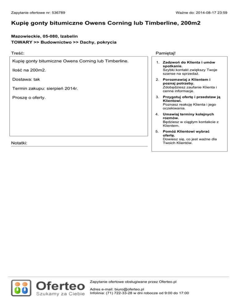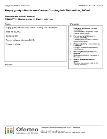Zapytanie ofertowe nr: 536789 Ważne do: 2014-08-17 23:59 Kupię gonty bitumiczne Owens Corning lub Timberline, 200m2 Mazowieckie, 05-080, Izabelin TOWARY >> Budownictwo >> Dachy, pokrycia Treść: Pamiętaj! Kupię gonty bitumiczne Owens Corning lub Timberline. 1. Zadzwoń do Klienta i umów spotkanie. Szybki kontakt zwiększy Twoje szanse na sprzedaż. Ilość na 200m2. Dostawa: tak Termin zakupu: sierpień 2014r. Proszę o oferty. Notatki: 2. Porozmawiaj z Klientem i poznaj potrzeby. Zdobędziesz zaufanie Klienta i cenne informacje. 3. Przygotuj ofertę i przedstaw ją Klientowi. Poznasz reakcję Klienta i jego oczekiwania. 4. Umawiaj terminy kolejnych rozmów. Będziesz w ciągłym kontakcie z Klientem. 5. Pomóż Klientowi wybrać ofertę. Dowiesz się, co jest ważne dla Twoich Klientów. Zapytanie ofertowe obsługiwane przez Oferteo.pl Adres e-mail: [email protected] Infolinia: (71) 722-33-28 w dni robocze od 9:00 do 17:00