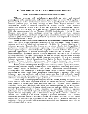 GŁÓWNE ASPEKTY IMIGRACJI WE WŁOSZECH W 2006 ROKU Dossier Statistico Immigrazione 2007 Caritas/Migrantes Widoczna przewaga osób posiadających pozwolenie na pobyt nad osobami posiadającymi stałe zameldowanie. Cudzoziemcy przebywający na terenie Włoch zgodnie z prawem, dzielą się na tzw. przebywających czasowo oraz na posiadających stałe zameldowanie. Przeważa pierwsza grupa, do której zaliczają się m.in. osoby przybyłe niedawno i nie zarejestrowane jeszcze w urzędach wojewódzkich. Według obliczeń Dossier Statistico Immigrazione włoskiego Caritasu, w końcu 2006 roku na terenie Włoch przebywało 3.690.052 obcokrajowców, o 21,6% więcej niż w roku ubiegłym. Włoski Urząd Statystyczny podaje, że w 2006 roku zameldowanych było we Włoszech 2.938.932 obcokrajowców (+10,1%). W ciągu bieżącego roku urzędy stanu cywilnego zarejestrują większość przybyłych, mających niejednokrotnie problemy z uzyskaniem stałego miejsca zamieszkania, zarówno z powodu trudnej sytuacji na rynku mieszkaniowym, jak i piętrzących się trudności biurokratycznych związanych z wydawaniem pozwoleń na pobyt. Wielkie zróżnicowanie krajów pochodzenia, z przewagą krajów europejskich. Między 2000 a 2006 rokiem wzrosła o 14 punktów procentowych ilość imigrantów z Europy Wschodniej, natomiast obniżyła się o 5% ilość osób pochodzących z Afryki i o 2% z Ameryki. Aktualnie na 10 imigrantów przypada 5 Europejczyków (z czego prawie połowa z krajów Unii Europejskiej), 4 przybyszów z kontynentów afrykańskiego i azjatyckiego, oraz 1 z kontynentu amerykańskiego. Z Rumunii pochodzi prawie jedna szósta (15,1%) imigrantów obecnych na terenie Włoch (556 tys. jednostek), wyprzedzając o 5 punktów procentowych Maroko (387 tys.) i Albanię (381 tys.) obywatele każdego z tych krajów stanowią 10% ogółu imigrantów. Ukraina (195 tys.) i Chiny (186 tys.) stanowią każde 5% ogółu. Filipińczyków jest 113 tys., niewiele mniejsze grupy stanowią obywatele Mołdawii, Tunezji, Indii i Polski. Następną grupę (między 50 a 80 tys.) stanowią imigranci pochodzący z Serbii, Bangladeszu, Perù, Egiptu, Sri Lanki, Ekwadoru, Macedonii, Senegalu, Pakistanu i Stanów Zjednoczonych. Około połowa imigrantów jest wyznania chrześcijańskiego, jedna trzecia muzułmańskiego, reszta to przedstawiciele innych wyznań. Wzrost procesu strukturyzacji. Przez proces strukturyzacji rozumie się zespół czynników, które powodują utrwalanie imigracji w kraju: wysoki numer imigrantów; zauważalny rytm wzrostu; coraz większy wpływ na zaludnienie kraju; wyraźny policentryzm etniczno-kulturalny z występowaniem grup narodowych z większości krajów świata; rozłożęnie zróżnicowane lecz powszechne na całym terenie kraju; normalizacja demograficzna z przewagą kobiet wśród imigrantów; przewaga małżeństw nad osobami samotnymi; duża ilość nieletnich; ciągłość zapotrzebowania na siłę roboczą; projekty migracyjne charakteryzujące się wzrostem dążenia do stabilności; wzrost dążenia do udziału w życiu społecznym. Główne cechy charakterystyczne imigracji: kobiety, nieletni, rodziny. Postępował nadal wzrost obecność kobiet wśród imigrantów; stały się one obecnie większością. Pozostało już tylko kilka regionów o przeważającej ilości imigrantów mężczyzn: Lombardia, regiony północnowschodnie, Apulia, wyspy. Liczba nieletnich wśród imigrantów dochodzi do 700 tys. Ich procent w porównaniu do ogółu zmniejszył się jednak, głównie z powodu napływu w 2006 r. ponad 500 tys. nowych, dorosłych pracowników. Liczba nieletnich jest szczególnie wysoka w regionach północnych, oraz w niektórych regionach środkowych Włoch, osiągając najwyższe kwoty w regionie Wenecji Euganejskiej (25%; w miejscowości Rovigo 29,2%), oraz w Lombardii i w Marche (24%). Wskazuje to na wzrost imigracji z powodów rodzinnych, która – według nowoczesnej kalkulacji Dossier – stanowi już ponad 1/3 wszystkich obecności (35,6%). Około połowa (17,2%) cudzoziemców przebywających na terenie Włoch z powodów rodzinnych to małżonkowi. Są to w większości kobiety posiadające pozwolenie na wykonywanie pracy, którą na ogół wykonują jednak na czarno. 1/2 Cudzoziemcy, a zarazem obywatele. W odróżnieniu od krajów będących tradycyjnym celem imigracji, we Włoszech obywatelstwo uzyskała dotąd jedynie niewielka cześć ogromnej rzeszy obcokrajowców mieszkających na terenie państwa. Sytuacja ta ulega jednak powoli zmianie. W latach 1995-2005 złożonych zostało 213.047 wniosków o przyznanie obywatelstwa włoskiego, z czego pozytywnie rozpatrzonych zostało 125.535. W ogromnej większości przypadków dotyczy to przyznania obywatelstwa na skutek zawarcia małżeństwa z obywatelem włoskim, niewiele jest natomiast przypadków naturalizowania obcokrajowców (20.731). Gwałtowny wzrost liczby cudzoziemców spowodował jednak wzrost przypadków nadania obywatelstwa, których w 2005 roku było 19.266 (dla porównania: w 2004 r. było ich 11.945). O więcej niż 50% wzrosła również liczba przypadków naturalizacji cudzoziemców (z 16,3% do 38,5%), mimo iż nie udało się dotąd przeprowadzić reformy ustawy regulującego tą kwestię. W końcu 2006 roku było we Włoszech 398.295 osób należących do drugiego pokolenia imigrantów: synów imigrantów, urodzonych we Włoszech i uważających ten kraj za swoją ojczyznę, lecz nadal nie posiadających włoskiego obywatelstwa. Szacuje się, że w ciągu dziesięciu lat liczba ich dojdzie do miliona. Rozłożenie nierównomierne lecz obejmujące całość w terytorium. Największe skupiska imigrantów występują na północy kraju (60% całości, 2,2 miliony jednostek). W centrum obecność ta jest znacznie mniejsza (26%, ok. miliona jednostek) i zmniejsza się postępując na południe (14%, pół miliona). W procentach wielkości te nie uległy zmianie w ciągu ostatnich trzech lat i wskazu