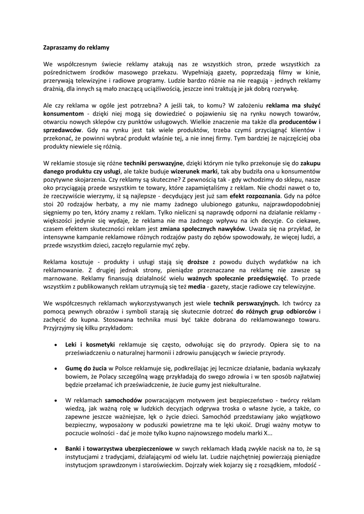 Zapraszamy do reklamy We współczesnym świecie reklamy atakują nas ze wszystkich stron, przede wszystkich za pośrednictwem środków masowego przekazu. Wypełniają gazety, poprzedzają filmy w kinie, przerywają telewizyjne i radiowe programy. Ludzie bardzo różnie na nie reagują - jednych reklamy drażnią, dla innych są mało znaczącą uciążliwością, jeszcze inni traktują je jak dobrą rozrywkę. Ale czy reklama w ogóle jest potrzebna? A jeśli tak, to komu? W założeniu reklama ma służyć konsumentom - dzięki niej mogą się dowiedzieć o pojawieniu się na rynku nowych towarów, otwarciu nowych sklepów czy punktów usługowych. Wielkie znaczenie ma także dla producentów i sprzedawców. Gdy na rynku jest tak wiele produktów, trzeba czymś przyciągnąć klientów i przekonać, że powinni wybrać produkt właśnie tej, a nie innej firmy. Tym bardziej że najczęściej oba produkty niewiele się różnią. W reklamie stosuje się różne techniki perswazyjne, dzięki którym nie tylko przekonuje się do zakupu danego produktu czy usługi, ale także buduje wizerunek marki, tak aby budziła ona u konsumentów pozytywne skojarzenia. Czy reklamy są skuteczne? Z pewnością tak - gdy wchodzimy do sklepu, nasze oko przyciągają przede wszystkim te towary, które zapamiętaliśmy z reklam. Nie chodzi nawet o to, że rzeczywiście wierzymy, iż są najlepsze - decydujący jest już sam efekt rozpoznania. Gdy na półce stoi 20 rodzajów herbaty, a my nie mamy żadnego ulubionego gatunku, najprawdopodobniej sięgniemy po ten, który znamy z reklam. Tylko nieliczni są naprawdę odporni na działanie reklamy większości jedynie się wydaje, że reklama nie ma żadnego wpływu na ich decyzje. Co ciekawe, czasem efektem skuteczności reklam jest zmiana społecznych nawyków. Uważa się na przykład, że intensywne kampanie reklamowe różnych rodzajów pasty do zębów spowodowały, że więcej ludzi, a przede wszystkim dzieci, zaczęło regularnie myć zęby. Reklama kosztuje - produkty i usługi stają się droższe z powodu dużych wydatków na ich reklamowanie. Z drugiej jednak strony, pieniądze przeznaczane na reklamę nie zawsze są marnowane. Reklamy finansują działalność wielu ważnych społecznie przedsięwzięć. To przede wszystkim z publikowanych reklam utrzymują się też media - gazety, stacje radiowe czy telewizyjne. We współczesnych reklamach wykorzystywanych jest wiele technik perswazyjnych. Ich twórcy za pomocą pewnych obrazów i symboli starają się skutecznie dotrzeć do różnych grup odbiorców i zachęcić do kupna. Stosowana technika musi być także dobrana do reklamowanego towaru. Przyjrzyjmy się kilku przykładom: Leki i kosmetyki reklamuje się często, odwołując się do przyrody. Opiera się to na przeświadczeniu o naturalnej harmonii i zdrowiu panujących w świecie przyrody. Gumę do żucia w Polsce reklamuje się, podkreślając jej lecznicze działanie, badania wykazały bowiem, że Polacy szczególną wagę przykładają do swego zdrowia i w ten sposób najłatwiej będzie przełamać ich przeświadczenie, że żucie gumy jest niekulturalne. W reklamach samochodów powracającym motywem jest bezpieczeństwo - twórcy reklam wiedzą, jak ważną rolę w ludzkich decyzjach odgrywa troska o własne życie, a także, co zapewne jeszcze ważniejsze, lęk o życie dzieci. Samochód przedstawiany jako wyjątkowo bezpieczny, wyposażony w poduszki powietrzne ma te lęki ukoić. Drugi ważny motyw to poczucie wolności - dać je może tylko kupno najnowszego modelu marki X... Banki i towarzystwa ubezpieczeniowe w swych reklamach kładą zwykle nacisk na to, że są instytucjami z tradycjami, działającymi od wielu lat. Ludzie najchętniej powierzają pieniądze instytucjom sprawdzonym i staroświeckim. Dojrzały wiek kojarzy się z rozsądkiem, młodość - z brawurą. Bank z tradycjami daje gwarancję, że nikt nie będzie robił ryzykownych eksperymentów z naszymi pieniędzmi. Zupełnie inaczej reklamuje się towary, których potencjalnymi odbiorcami są nastolatki. Tutaj kładzie się nacisk na przygodę i dobrą zabawę w dobranym towarzystwie. Obiecuje się, że dany napój zapewni niezwykłe odczucia, że krój danych spodni jest oznaką modnego stylu życia. Ponieważ w życiu nastolatków istotne miejsce zajmują sprawy uczuć, reklamy zapewniają im powodzenie, jeśli tylko np. użyją reklamowanego dezodorantu czy perfum. Reklamy dla młodzieży starają się być także zaskakujące i żartobliwe - nastolatki lubią, gdy reklama ma nieoczekiwaną, dowcipną puentę i jest lekko odlotowa... Reklamy wielu marek papierosów dążą do pokazania papierosa jako atrybutu męskości - stąd reklamy ukazujące palaczy jako kowbojów czy w ogóle ludzi doskonale radzących sobie w ekstremalnych sytuacjach. W reklamach środków czystości podkreśla się przede wszystkim ich absolutną skuteczność. Doskonale wywabiają wszystkie plamy, każdą brudną bluzkę czynią na powrót śnieżnobiałą. Sprawiają, że "kuchnia aż lśni czystością". Dodatkowo podkreślana jest łatwość stosowania danych środków, bo prace domowe powszechnie uważane są za zajęcia uciążliwe i męczące. W reklamach produktów żywnościowych często wykorzystuje się naszą tęsknotę do szczęśliwego domu, w którym cała rodzina zasiada do stołu, by wspólnie zjeść posiłek. Dania błyskawiczne reklamuje się inaczej: podkreślając, że ich przygotowanie nie zabiera czasu i jest możliwe w każdych warunkach, na przykład w pracy. Rzeczy przedstawiane w reklamach są do pewnego stopnia nierealne. Są lśniące, idealne, bez jakiejkolwiek skazy. Kobiety są piękne i zalotne, mężczyźni przystojni i odważni, dzieci słodkie i grzeczne. W reklamach oprócz pozytywnych bohaterów występują także czarne charaktery, często, żeby podkreślić walory oferowanego produktu, zestawia się go z innym, np. "zwykłym proszkiem", "zwykłym