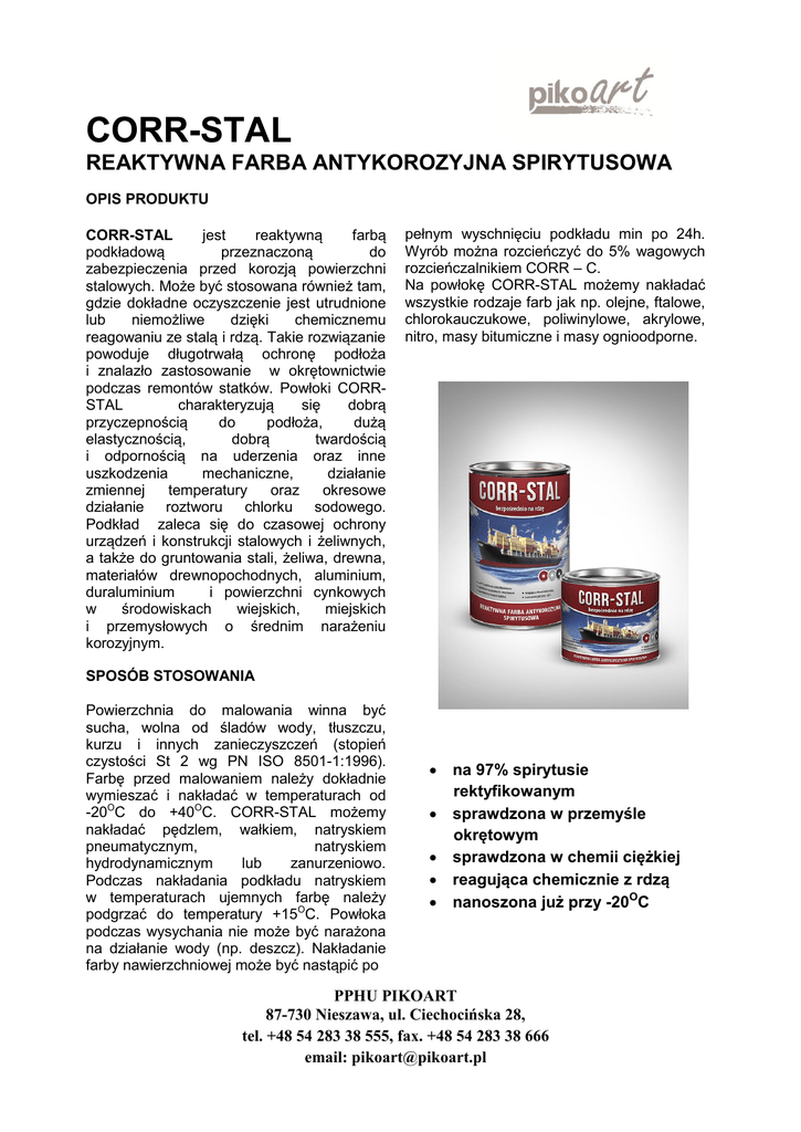 CORR-STAL REAKTYWNA FARBA ANTYKOROZYJNA SPIRYTUSOWA OPIS PRODUKTU CORR-STAL jest reaktywną farbą podkładową przeznaczoną do zabezpieczenia przed korozją powierzchni stalowych. Może być stosowana również tam, gdzie dokładne oczyszczenie jest utrudnione lub niemożliwe dzięki chemicznemu reagowaniu ze stalą i rdzą. Takie rozwiązanie powoduje długotrwałą ochronę podłoża i znalazło zastosowanie w okrętownictwie podczas remontów statków. Powłoki CORRSTAL charakteryzują się dobrą przyczepnością do podłoża, dużą elastycznością, dobrą twardością i odpornością na uderzenia oraz inne uszkodzenia mechaniczne, działanie zmiennej temperatury oraz okresowe działanie roztworu chlorku sodowego. Podkład zaleca się do czasowej ochrony urządzeń i konstrukcji stalowych i żeliwnych, a także do gruntowania stali, żeliwa, drewna, materiałów drewnopochodnych, aluminium, duraluminium i powierzchni cynkowych w środowiskach wiejskich, miejskich i przemysłowych o średnim narażeniu korozyjnym. pełnym wyschnięciu podkładu min po 24h. Wyrób można rozcieńczyć do 5% wagowych rozcieńczalnikiem CORR – C. Na powłokę CORR-STAL możemy nakładać wszystkie rodzaje farb jak np. olejne, ftalowe, chlorokauczukowe, poliwinylowe, akrylowe, nitro, masy bitumiczne i masy ognioodporne. SPOSÓB STOSOWANIA Powierzchnia do malowania winna być sucha, wolna od śladów wody, tłuszczu, kurzu i innych zanieczyszczeń (stopień czystości St 2 wg PN ISO 8501-1:1996). Farbę przed malowaniem należy dokładnie wymieszać i nakładać w temperaturach od -20OC do +40OC. CORR-STAL możemy nakładać pędzlem, wałkiem, natryskiem pneumatycznym, natryskiem hydrodynamicznym lub zanurzeniowo. Podczas nakładania podkładu natryskiem w temperaturach ujemnych farbę należy podgrzać do temperatury +15OC. Powłoka podczas wysychania nie może być narażona na działanie wody (np. deszcz). Nakładanie farby nawierzchniowej może być nastąpić po na 97% spirytusie rektyfikowanym sprawdzona w przemyśle okrętowym sprawdzona w chemii ciężkiej reagująca chemicznie z rdzą nanoszona już przy -20OC PPHU PIKOART 87-730 Nieszawa, ul. Ciechocińska 28, tel. +48 54 283 38 555, fax. +48 54 283 38 666 email: [email protected]