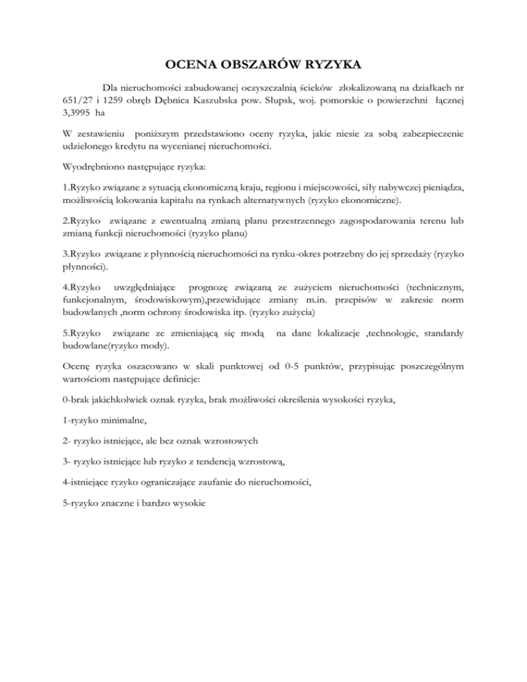 OCENA OBSZARÓW RYZYKA Dla nieruchomości zabudowanej oczyszczalnią ścieków zlokalizowaną na działkach nr 651/27 i 1259 obręb Dębnica Kaszubska pow. Słupsk, woj. pomorskie o powierzchni łącznej 3,3995 ha W zestawieniu poniższym przedstawiono oceny ryzyka, jakie niesie za sobą zabezpieczenie udzielonego kredytu na wycenianej nieruchomości. Wyodrębniono następujące ryzyka: 1.Ryzyko związane z sytuacją ekonomiczną kraju, regionu i miejscowości, siły nabywczej pieniądza, możliwością lokowania kapitału na rynkach alternatywnych (ryzyko ekonomiczne). 2.Ryzyko związane z ewentualną zmianą planu przestrzennego zagospodarowania terenu lub zmianą funkcji nieruchomości (ryzyko planu) 3.Ryzyko związane z płynnością nieruchomości na rynku-okres potrzebny do jej sprzedaży (ryzyko płynności). 4.Ryzyko uwzględniające prognozę związaną ze zużyciem nieruchomości (technicznym, funkcjonalnym, środowiskowym),przewidujące zmiany m.in. przepisów w zakresie norm budowlanych ,norm ochrony środowiska itp. (ryzyko zużycia) 5.Ryzyko związane ze zmieniającą się modą budowlane(ryzyko mody). na dane lokalizacje ,technologie, standardy Ocenę ryzyka oszacowano w skali punktowej od 0-5 punktów, przypisując poszczególnym wartościom następujące definicje: 0-brak jakichkolwiek oznak ryzyka, brak możliwości określenia wysokości ryzyka, 1-ryzyko minimalne, 2- ryzyko istniejące, ale bez oznak wzrostowych 3- ryzyko istniejące lub ryzyko z tendencją wzrostową, 4-istniejące ryzyko ograniczające zaufanie do nieruchomości, 5-ryzyko znaczne i bardzo wysokie DLA WYCENIANEJ NIERUCHOMOŚCI OCENĘ RYZYKA PRZEDSTAWIONOW PONIŻSZEJ TABELI Ryzyko ekonomiczne 2,0 Ryzyko planu przestrzennego 0,0 Ryzyko płynności 2,0 Ryzyko zużycia 2,0 Ryzyko mody 1,0 Ryzyko średnie 1,4 Podsumowanie: ryzyko mieści się w przedziale ryzyka minimalnego 8 grudzień 2015 r. Krystyna Popiel Rzeczoznawca majątkowy nr 289 Podstawą prawną sporządzenia obszarów ryzyka jest standard „Wycena dla zabezpieczenia wierzytelności” uzgodniony i zatwierdzony przez Ministerstwo Infrastruktury . Poniżej cytuję Komunikat Ministra Infrastruktury oraz Załącznik do Komunikatu Ministra Infrastruktur z dnia 04 stycznia 2010 r. oraz wybrane punkty ze standardu zawodowego „Wycena dla zabezpieczenia wierzytelności”: KOMUNIKAT MINISTRA INFRASTRUKTURY z dnia 04 stycznia 2010 r. w sprawie uzgodnienia standardu zawodowego rzeczoznawców majątkowych „Wycena dla zabezpieczenia wierzytelności” Na podstawie art. 175 ust. 6 ustawy z dnia 21 sierpnia 1997 r. o gospodarce nieruchomościami (Dz. U. z 2004 r. Nr 261, poz. 2603, z późn. zm. informuje się o uzgodnieniu standardu zawodowego rzeczoznawców majątkowych „Wycena dla zabezpieczenia wierzytelności ” ustalonego przez Polską Federację Stowarzyszeń Rzeczoznawców Majątkowych, Stanowiącego załącznik do komunikatu. MINISTER INFRASTRUKTURY (-) Cezary Grabarczyk STANDARD ZAWODOWY RZECZOZNAWCÓW MAJĄTKOWYCHWYCENA DLA ZABEZPIECZENIA WIERZYTELNOŚCI 4.3. Rzeczoznawca majątkowy ma również obowiązek, na podstawie dostępnych źródeł informacji i znajomości rynku, wskazać obszary ryzyka związanego z wycenianą nieruchomością, w tym z przewidywanymi zmianami na danym rynku nieruchomości oraz ryzykiem związanym z oceną danej nieruchomości przez inwestorów wraz z ogólną opinią na temat kierunku wpływu powyższego na poziom wartości wycenianej nieruchomości w przyszłości. Powyższe dodatkowe informacje przedstawia się w formie załącznika do operatu szacunkowego. 4.4. Określanie wartości należy odróżnić od szacowania ryzyka kredytowego. Szczegółowa interpretacja i analiza ryzyka, związanego z przedmiotem zabezpieczenia, o którym mowa w pkt. 4.3, może być dla rzeczoznawcy majątkowego dodatkową czynnością lub przedmiotem odrębnego opracowania, niestanowiącego operatu szacunkowego. Rzeczoznawca majątkowy może, na zamówienie wierzyciela lub zamawiającego, w miarę posiadanych kompetencji, w ramach dodatkowej usługi, wykonać analizę wrażliwości, która pozwoli na pełniejszą ocenę ryzyka przyjęcia konkretnej nieruchomości, jako zabezpieczenia wierzytelności. Analiza wrażliwości przedstawia wrażliwość wartości nieruchomości wycenianej na zmiany parametrów wejściowych, wpływających na tę wartość. Ostateczna ocena ryzyka, związanego z zabezpieczeniem wierzytelności na nieruchomości, należy w każdym przypadku do wierzyciela.