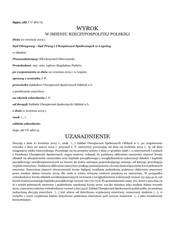 Sygn. akt V U 482/15 WYROK W IMIENIU RZECZYPOSPOLITEJ POLSKIEJ Dnia 22 września 2015 r. Sąd Okręgowy - Sąd Pracy i Ubezpieczeń Społecznych w Legnicy w składzie: Przewodniczący: SSO Krzysztof Główczyński Protokolant: star. sekr. sądowy Magdalena Pańków po rozpoznaniu w dniu 22 września 2015 r. w Legnicy sprawy z wniosku J. P. przeciwko Zakładowi Ubezpieczeń Społecznych Oddział w L. o przeliczenie emerytury na skutek odwołania J. P. od decyzji Zakładu Ubezpieczeń Społecznych Oddział w L. z dnia 21 kwietnia 2015 r. znak (...) oddala odwołanie. Sygn. akt VU 482/15 UZASADNIENIE Decyzją z dnia 21 kwietnia 2015 r., znak (...) Zakład Ubezpieczeń Społecznych Oddział w L. po rozpatrzeniu wniosku z dnia 20 marca 2015 r. przyznał J. P. emeryturę poczynając od dnia 09 kwietnia 2015 r., tj. od dnia osiągnięcia wieku emerytalnego. Powołując się na przepisy ustawy z dnia 17 grudnia 1998 r. o emeryturach i rentach z Funduszu Ubezpieczeń Społecznych, organ rentowy wskazał, że podstawę obliczenia emerytury stanowi kwota składek na ubezpieczenie emerytalne oraz kapitału początkowego z uwzględnieniem waloryzacji składek i kapitału początkowego zewidencjonowanych na koncie do końca miesiąca poprzedzającego miesiąc, od którego przysługuje wypłata emerytury. Podstawa obliczenia emerytury podlega pomniejszeniu o kwotę stanowiącą sumę kwot pobranych emerytur. Emerytura stanowi równowartość kwoty będącej wynikiem podzielenia podstawy obliczenia emerytury przez średnie dalsze trwanie życia, dla osób w wieku równym wiekowi przejścia na emeryturę. W przypadku wnioskodawcy kwota składek zewidencjonowanych na koncie z uwzględnieniem waloryzacji wynosi 131.544,41 zł, zaś kwota zwaloryzowanego kapitału początkowego wynosi 750.701,73 zł. Po pomniejszeniu sumy ww. kwot o 323.094,79 zł z tytułu pobranych emerytur i podzieleniu uzyskanej kwoty przez 212,80 miesięcy jako średnie dalsze trwanie życia, emerytura należna wnioskodawcy wynosi 2.627,59 zł. Zakład Ubezpieczeń Społecznych podał nadto, że ustalona zaskarżoną decyzją emerytura (...) jest niższa od dotychczas wypłacanej emerytury oznaczonej znakiem (...), w związku z czym wypłacana będzie dotychczas pobierana emerytura pod nowym numerem (...) jako świadczenie korzystniejsze. Od powyższej decyzji odwołanie złożył wnioskodawca J. P. podnosząc, że nie zgadza się z interpretacją wskazaną w przepisach dotyczących reformy emerytalnej, a dotyczącą średniego dalszego trwania życia osób pobierających emeryturę. Zdaniem wnioskodawcy, skoro zgodnie z danymi GUS średni wiek życia dla kobiet wynosi 81 lat, a dla mężczyzn 73 lata, to daje to na obywatela średnią długość życia wynoszącą 77 lat. Nawet w sytuacji powołania się na przepisy unijne, należałoby przyjąć 79 lat, a nie 83,4 lat, jak przyjął organ rentowy. Zdaniem wnioskodawcy, wysokość należnej mu emerytury powinna zostać obliczona poprzez przyjęcie w miejsce 212,80 miesięcy jako średniego dalszego trwania życia innej liczby miesięcy – tj.159,6. Uprawniałoby to wnioskodawcę do emerytury w wysokości 3.503,45 zł. W odpowiedzi na odwołanie, Zakład Ubezpieczeń Społecznych Oddział w L. wniósł o jego oddalenie, podtrzymując argumentację przedstawioną w zaskarżonej decyzji. Organ rentowy powołał się na treść przepisu art. 24 ust. 1b pkt 3 ustawy emerytalnej, zgodnie z którym wiek emerytalny dla mężczyzn urodzonych – jak wnioskodawca – w okresie od dnia 01 lipca 1949 r. do 30 września 1949 r. wynosi co najmniej 65 lat i 7 miesięcy. Stosownie do treści komunikatu Prezesa Głównego Urzędu Statystycznego z dnia 26 marca 2015 r. w sprawie tablicy średniego dalszego trwania życia kobiet i mężczyzn (M.P. z 2015 r., poz. 296), średnie dalsze trwanie życia dla osób w wieku 65 lat i 7 miesięcy wynosi 212,80 miesięcy. Taką też wartość organ rentowy przyjął przy ustaleniu wysokości świadczenia wnioskodawcy. Sąd ustalił następujący stan faktyczny: J. P. urodził się w dniu (...) W dniu 20 marca 2015 r. wnioskodawca złożył wniosek o emeryturę. Decyzją z dnia 21 kwietnia 2015 r. Zakład Ubezpieczeń Społecznych Oddział w L. przyznał wnioskodawcy prawo do emerytury od dnia 09 kwietnia 2015 r., tj. od osiągnięcia wieku emerytalnego. Podstawę obliczenia emerytury stanowiła ustalona na ostatni dzień miesiąca poprzedzającego miesiąc, od którego przysługuje wypłata emerytury: • kwota składek na ubezpieczenie emerytalne zewidencjonowanych na koncie z uwzględnieniem waloryzacji – 131.544,41 zł, • kwota kapitału początkowego zaewidencjonowana na koncie wnioskodawcy z uwzględnieniem waloryzacji – 750.701,73 zł, • średnie dalsze trwanie życia dla osoby w wieku 65 lat i 7 miesięcy, według tablic średniego trwania życia obowiązujących w dniu zgłoszenia wniosku o emeryturę – 212,80 miesięcy. Kwota składek zaewidencjonowanych na koncie wnioskodawcy z uwzględnieniem waloryzacji – 131.544,41 zł i kwota zwaloryzowanego kapitału początkowego – 750.701,73 zł po zsumowaniu zostały następnie pomniejszone o kwotę 323.094,79 zł z tytułu pobranych już emerytur, a następnie podzielone przez średnie dalsze trwanie życia, tj. przez liczbę 212,80 miesięcy. Tak obliczona wysokość emerytury wyniosła 2.627,59 zł. D o w ó d: decyzja Zakładu Ubezpieczeń Społecznych z dnia 21 kwietnia 2015 r., znak (...) (k. 11 akt emerytalnych). Sąd zważył, co następuje: Odwołanie J. P. podlegało oddaleniu. W rozpoznawanej sprawie wnioskodawca kwestionował zastosowaną przez organ rentowy w decyzji z dnia 21 kwietnia 2015 r., przyznającej mu prawo do emerytury, ilość miesięcy (212,80) przyjętą w celu obliczenia wysokości emerytury. Liczba miesięcy została ustalona przez organ rentowy dla osoby w wieku 65 lat i 7 miesięcy. Zgodnie bowiem z przepisem art. 25 ust. 1b pkt 3 ustawy z dnia 17 grudnia 1998 r. o e