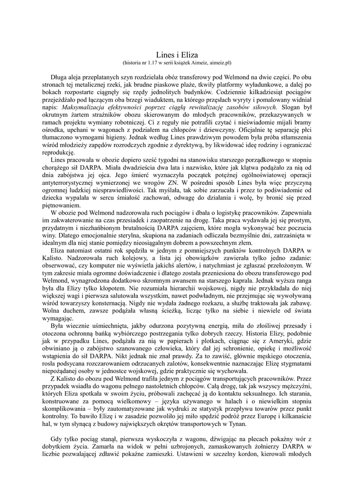 Lines i Eliza (historia nr 1.17 w serii książek Aimeiz, aimeiz.pl) Długa aleja przeplatanych szyn rozdzielała obóz transferowy pod Welmond na dwie części. Po obu stronach tej metalicznej rzeki, jak brudne piaskowe plaże, tkwiły platformy wyładunkowe, a dalej po bokach rozpostarte ciągnęły się rzędy jednolitych budynków. Codziennie kilkadziesiąt pociągów przejeżdżało pod łączącym oba brzegi wiaduktem, na którego przęsłach wyryty i pomalowany widniał napis: Maksymalizacja efektywności poprzez ciągłą rewitalizację zasobów siłowych. Slogan był okrutnym żartem strażników obozu skierowanym do młodych pracowników, przekazywanych w ramach projektu wymiany robotniczej. Ci z reguły nie potrafili czytać i nieświadomie mijali bramy ośrodka, upchani w wagonach z podziałem na chłopców i dziewczyny. Oficjalnie tę separację płci tłumaczono wymogami higieny. Jednak według Lines prawdziwym powodem była próba stłamszenia wśród młodzieży zapędów rozrodczych zgodnie z dyrektywą, by likwidować ideę rodziny i ograniczać reprodukcję. Lines pracowała w obozie dopiero sześć tygodni na stanowisku starszego porządkowego w stopniu chorążego sił DARPA. Miała dwadzieścia dwa lata i nazwisko, które jak klątwa podążało za nią od dnia zabójstwa jej ojca. Jego śmierć wyznaczyła początek potężnej ogólnoświatowej operacji antyterrorystycznej wymierzonej we wrogów ZN. W pośredni sposób Lines była więc przyczyną ogromnej ludzkiej niesprawiedliwości. Tak myślała, tak sobie zarzucała i przez to podświadomie od dziecka wypalała w sercu śmiałość zachowań, odwagę do działania i wolę, by bronić się przed piętnowaniem. W obozie pod Welmond nadzorowała ruch pociągów i dbała o logistykę pracowników. Zapewniała im zakwaterowanie na czas przesiadek i zaopatrzenie na drogę. Taka praca wydawała jej się prostym, przydatnym i niezhańbionym brutalnością DARPA zajęciem, które mogła wykonywać bez poczucia winy. Dlatego emocjonalnie sterylna, skupiona na zadaniach odliczała bezmyślnie dni, zatrzaśnięta w idealnym dla niej stanie pomiędzy nieosiągalnym dobrem a powszechnym złem. Eliza natomiast ostatni rok spędziła w jednym z pomniejszych punktów kontrolnych DARPA w Kalisto. Nadzorowała ruch kolejowy, a lista jej obowiązków zawierała tylko jedno zadanie: obserwować, czy komputer nie wyświetla jakichś alertów, i natychmiast je zgłaszać przełożonym. W tym zakresie miała ogromne doświadczenie i dlatego została przeniesiona do obozu transferowego pod Welmond, wynagrodzona dodatkowo skromnym awansem na starszego kaprala. Jednak wyższa ranga była dla Elizy tylko kłopotem. Nie rozumiała hierarchii wojskowej, nigdy nie przykładała do niej większej wagi i pierwsza salutowała wszystkim, nawet podwładnym, nie przejmując się wywoływaną wśród towarzyszy konsternacją. Nigdy nie wydała żadnego rozkazu, a służbę traktowała jak zabawę. Wolna duchem, zawsze podążała własną ścieżką, licząc tylko na siebie i niewiele od świata wymagając. Była wiecznie uśmiechnięta, jakby odurzona pozytywną energią, miła do złośliwej przesady i otoczona ochronną bańką wybiórczego postrzegania tylko dobrych rzeczy. Historia Elizy, podobnie jak w przypadku Lines, podążała za nią w papierach i plotkach, ciągnąc się z Ameryki, gdzie obwiniano ją o zabójstwo szanowanego człowieka, który dał jej schronienie, opiekę i możliwość wstąpienia do sił DARPA. Nikt jednak nie znał prawdy. Za to zawiść, głównie męskiego otoczenia, rosła podsycana rozczarowaniem odrzucanych zalotów, konsekwentnie naznaczając Elizę stygmatami niepożądanej osoby w jednostce wojskowej, gdzie praktycznie się wychowała. Z Kalisto do obozu pod Welmond trafiła jednym z pociągów transportujących pracowników. Przez przypadek wsiadła do wagonu pełnego nastoletnich chłopców. Całą drogę, tak jak wszyscy mężczyźni, których Eliza spotkała w swoim życiu, próbowali zachęcać ją do kontaktu seksualnego. Ich starania, konstruowane za pomocą wielkomowy – języka używanego w halach i o niewielkim stopniu skomplikowania – były zautomatyzowane jak wydruki ze statystyk przepływu towarów przez punkt kontrolny. To bawiło Elizę i w zasadzie pozwoliło jej miło spędzić podróż przez Europę i kilkanaście hal, w tym słynącą z budowy największych okrętów transportowych w Tynan. Gdy tylko pociąg stanął, pierwsza wyskoczyła z wagonu, dźwigając na plecach pokaźny wór z dobytkiem życia. Zamarła na widok w pełni uzbrojonych, zamaskowanych żołnierzy DARPA w liczbie pozwalającej zdławić pokaźne zamieszki. Ustawieni w szczelny kordon, kierowali młodych robotników prosto do bram bloków przejściowych, jak ściana odbijając każdego, kto chciał zboczyć z kursu. Eliza ładnie uśmiechnęła się do zreplikowanych czarnych posągów, prosząc o przepuszczenie, ale nie dostała odpowiedzi, natrafiając na bezruch przyklejonych do piersi kompozytowych karabinów. Dopiero kapitan jednostki szczeknięciem rozkazał żołnierzom ustąpić, jak zauważył, „tej blond ślicznotce”. Gardząc zwierzęcym pomiotem w myślach, na twarzy wdzięcząc się jednak słonecznie, Eliza podziękowała i pognała w stronę wskazanego jej obleśnym palcem służbowego przejścia i właściwej części obozu. W drodze do biur oficerskich zrobiła kilka rund wokół najbliższych baraków, gdzie młodzi robotnicy z reguły spędzali jedną noc, czekając na właściwy dla nich transport. Z ciekawości zbadała zamki w drzwiach zamykane jedynie z zewnątrz, a potem próbowała zmierzyć wzrokiem horyzont obozu, przytłoczona liczbą rozrzuconych wokół budynków, ich różnorodnością i stopniem ogołocenia ze wszelkich zbędności. Zgodnie z Wielkim Planem marnotrawstwo stanowiło zbrodnię cięższą niż terroryzm, więc architekci łamali prawa fizyki i przy okazji zasady be
