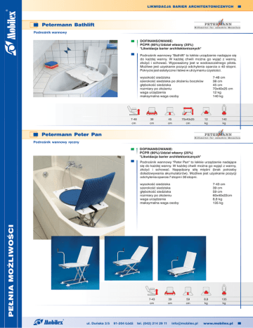 LIKWIDACJA BARIER ARCHITEKTONICZNYCH Petermann Bathlift Podnośnik wannowy DOFINANSOWANIE: PCPR (80%)/Udział własny (20%) "Likwidacja barier architektonicznych" Podnośnik wannowy "Bathlift" to lekkie urządzenie nadające się do każdej wanny. W każdej chwili można go wyjąć z wanny, złożyć i schować. Wyposażony jest w wodoszczelnego pilota. Możliwe jest uzyskanie pozycji odchylenia oparcia o 40 stopni. Pokrycie jest estetyczne i łatwe w utrzymaniu czystości. wysokość siedziska szerokość siedziska po złożeniu boczków głębokość siedziska rozmiary po złożeniu waga urządzenia maksymalna waga osoby 7-48 cm 38 cm 45 cm 70x40x25 cm 7-48 cm 38 cm 45 cm 70x40x25 cm 12 kg 140 kg 12 kg 140 kg Petermann Peter Pan Podnośnik wannowy ręczny DOFINANSOWANIE: PCPR (80%)/Udział własny (20%) "Likwidacja barier architektonicznych" Podnośnik wannowy "Peter Pan" to lekkie urządzenie nadające się do każdej wanny. W każdej chwili można go wyjąć z wanny, złożyć i schować. Napędzany siłą mięśni (brak potrzeby doładowywania akumulatorów). Możliwe jest uzyskanie pozycji odchylenia oparcia 7 stopni i 30 stopni. PEŁNIA MOŻLIWOŚCI wysokość siedziska szerokość siedziska głębokość siedziska rozmiary po złożeniu waga urządzenia maksymalna waga osoby 7-43 cm ul. Duńska 3/5 91-204 Łódź tel. (042) 214 29 11 39 cm 7-43 cm 39 cm 59 cm 60x40x22cm 8,8 kg 135 kg 59 cm [email protected] 8,8 kg 135 kg www.mobilex.pl