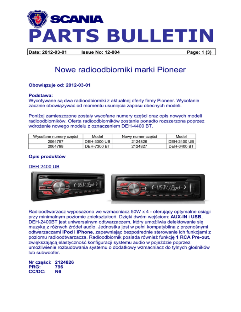 PARTS BULLETIN Date: 2012-03-01 Issue No: 12-004 Page: 1 (3) Nowe radioodbiorniki marki Pioneer Obowiązuje od: 2012-03-01 Podstawa: Wycofywane są dwa radioodbiorniki z aktualnej oferty firmy Pioneer. Wycofanie zacznie obowiązywać od momentu usunięcia zapasu obecnych modeli. Poniżej zamieszczone zostały wycofane numery części oraz opis nowych modeli radioodbiorników. Oferta radioodbiorników zostanie ponadto rozszerzona poprzez wdrożenie nowego modelu z oznaczeniem DEH-4400 BT. Wycofane numery części 2064797 2064798 Model DEH-3300 UB DEH-7300 BT Nowy numer części 2124826 2124827 Model DEH-2400 UB DEH-6400 BT Opis produktów DEH-2400 UB Radioodtwarzacz wyposażono we wzmacniacz 50W x 4 - oferujący optymalne osiągi przy minimalnym poziomie zniekształceń. Dzięki dwóm wejściom: AUX-IN i USB, DEH-2400BT jest uniwersalnym odtwarzaczem, który umożliwia delektowanie się muzyką z różnych źródeł audio. Jednostka jest w pełni kompatybilna z przenośnymi odtwarzaczami iPod i iPhone, zapewniając bezpośrednie sterowanie ich funkcjami z poziomu radioodtwarzacza. Radioodbiornik posiada również funkcję 1 RCA Pre-out, zwiększającą elastyczność konfiguracji systemu audio w pojeździe poprzez umożliwienie rozbudowania systemu o dodatkowy wzmacniacz do tylnych głośników lub subwoofer. Nr części: 2124826 PRG: 796 CC/DC: N6 PARTS BULLETIN Date: 2012-03-01 Issue No: 12-004 Page: 2 (3) DEH-6400 BT Wyposażony w pełną funkcjonalność Bluetooth radioodtwarzacz, który umożliwia wykonywanie i odbieranie połączeń z Twojego telefonu. System posiada mikrofon zewnętrzny, który zapewnia czyste brzmienie Twojego głosu po drugiej stronie, bez zakłóceń lub hałasów. Nie potrzebujesz już kabli, słuchawek ani przyłączy urządzeń zewnętrznych. Podłącz swojego iPoda lub iPhona poprzez tylne wejście USB (przewód dołączony) lub inny telefon albo przenośny odtwarzacz bezpośrednio do przedniego wejścia AUX-IN. Zintegrowana funkcja MIXTRAX umożliwia tworzenie własnych zestawów muzycznych na wzór klubowy z rożnymi efektami miksera. Kolor oraz intensywność podświetlenia zmieniają się w zależności od charakterystyki dźwięku utworu. Utwory można również odtwarzać z karty SD. Radioodbiornik posiada funkcję 3 RCA Pre-out, zwiększającą elastyczność konfiguracji systemu audio w pojeździe poprzez umożliwienie rozbudowania systemu o dodatkowy wzmacniacz do tylnych głośników lub subwoofer. Radioodtwarzacz posiada wzmacniacz 50W x 4. Nr części: 2124827 PRG: 796 CC/DC: N6 PARTS BULLETIN Date: 2012-03-01 Issue No: 12-004 Page: 3 (3) DEH-4400 BT Wyposażony w pełną funkcjonalność Bluetooth radioodtwarzacz, który umożliwia wykonywanie i odbieranie połączeń z Twojego telefonu. System posiada mikrofon zewnętrzny, który zapewnia czyste brzmienie Twojego głosu po drugiej stronie, bez zakłóceń lub hałasów. Nie potrzebujesz już kabli, słuchawek ani przyłączy urządzeń zewnętrznych. Gniazdo USB i wejście AUX-II na panelu przednim umożliwiają podłączenie urządzeń iPod/iPhone (przewód nie jest dołączony), nośnika USB lub przenośnego odtwarzacza MP3, dzięki czemu można będzie korzystać z całej swojej kolekcji muzycznej w trasie. Radioodbiornik posiada również funkcję 3 RCA Pre-out, zwiększającą elastyczność konfiguracji systemu audio w pojeździe poprzez umożliwienie rozbudowania systemu o dodatkowy wzmacniacz do tylnych głośników lub subwoofer. Radioodtwarzacz posiada wzmacniacz 50W x 4. Nr części: 2124825 PRG: 796 CC/DC: N6 Podsumowanie aktualnej oferty Pioneer Numer części Model 2064796 DEH-1320 UB 2124826 DEH-2400 UB 2124825 DEH-4400 BT 2124827 DEH-6400 BT 2064799 AVIC -F930BT Wejście AUX Wejście USB Bluetooth Wejście SD Nawigacja • • • • • • • • • • • • • • • Więcej informacji o radioodbiornikach, które nie zostały tutaj wymienione, można znaleźć w biuletynie 11-029. (2064796/DEH-1320UB & 2064799/AVIC-F930BT)