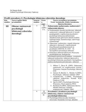 Dr Danuta Rode Zakład Psychologii klinicznej i Sądowej Profil zawodowy I: Psychologia kliniczna człowieka dorosłego Rok studiów III azwa ogólna bloku przedmiotów Obszar zastosowań psychologii klinicznej człowieka dorosłego Semestr studiów 5 Form a zajęć 30 (30W) Ćw. azwa szczegółowa przedmiotu Treści kształcenia. Efekty kształcenia. Bazowa literatura Zaburzenia zachowania, osobowości i zaburzenia lękowe • Problematyka choroby psychicznej, zaburzeń osobowości i zaburzeń lękowych w świetle paradygmatów współczesnej psychiatrii i psychologii klinicznej-definiowanie charakterystyka głównych założeń modelu: typologicznego, dynamicznego, opisowego, systemowego • Zaburzenia osobowości- zespoły kliniczne zaburzeń w dawnych i współczesnych klasyfikacjach psychiatrycznych na przykładzie DSM III, IV, ICD – 10. Szczegółowa prezentacja zaburzeń. • Koncepcje zaburzeń lękowych. Przyczyny psychospołeczne, biologiczne Prezentacja teoretycznych podstaw rozumienia zaburzeń osobowości, zaburzeń lękowych w psychologii klinicznej, psychiatrii. Szczegółowa analiza mechanizmu powstawania zaburzeń 1. Milton T., Davis R. (2005). Zaburzenia osobowości we współczesnym świecie. Warszawa. Instytut Psychologii Zdrowia PTP. 2. Garson R.,Butcher J., Mineka S.(2003). Psychologia zaburzeń. Gdańsk. GWP 3. Cierpiałowska L.(2004). Psychologia zaburzeń osobowości. Poznań. Wyd. Naukowe UAM 4. Sęk H.(2007). Psychologia kliniczna. Warszawa. Wyd. naukowe PWN 5. Rachman S.(2005). Zaburzenia lękowe. Modele kliniczne i techniki terapeutyczne. Gdańsk. GWP 6 30 (15W) W. Przedmiot i struktura psychologii klinicznej. Zakres zastosowań psychologii klinicznej • Psychologia kliniczna jako dziedzina stosowana. Dynamika rozwoju, aktualne tendencje. Pojecie normy i patologii w psychologii klinicznej i psychiatrii. • Pojęcie sytuacji trudnej i stresu w świetle literatury psychologicznej i psychiatrycznej. Uraz psychiczny jako szczególny rodzaj sytuacji trudnej. Charakterystyka zdarzeń traumatycznych w życiu jednostki, symptomatologia i psychologiczne mechanizmy rozwoju stresu pourazowego. Kryzys i jego główne przejawy w życiu człowieka. Odporność psychiczna. • Praca z objawem psychopatologicznymgłówne trendy w procesie udzielania pomocy osobom doświadczającym lęku jawnego i konwersyjnego. • Zastosowanie wybranych elementów pomocy psychologicznej w różnych zaburzeniach psychicznych (zaburzenia nerwicowe, osobowości, psychozy) Uzyskanie wiedzy o przyczynach i obrazie klinicznym wybranych zaburzeń. Umiejętność rozpoznawania zwiastunów problemów klinicznych. Psychologiczne aspekty pomocy w różnych zaburzeniach psychicznych 1. Aleksandrowicz J. (2002).Psychopatologia zaburzeń nerwicowych i osobowości. Kraków. Wyd, Naukowe UJ. 2. Caplan H., Sadoch B.J. (1995). Psychiatria kliniczna. Wrocław. Wyd.Urban-Partner 3. Carson, R. Mineka, S. (2003). Psychologia zaburzeń. Gdańsk: GWP 4. Rosenhan D.L.Seligman M.E. (1994). Psychopatologia. T.I, II. Warszawa. Wyd. Polskiego Towarzystwa Psychologicznego 5. Sęk H. (2007). Psychologia kliniczna. Warszawa. Wyd. naukowe PWN. 6 30 (15W) Ćw. Zaburzenia spowodowane używaniem środków psychoaktywnych • Nadużywanie i uzależnienie od substancji psychoaktywnych-obraz kliniczny. Koncepcje i modele uzależnienia. Uwarunkowania biologiczne, psychologiczne, społeczne • Alkoholizm jako choroba. Modele i koncepcje przyczyn uzależnienia. Obraz kliniczny uzależnienia od alkoholu. Mechanizm uzależnienia fizjologicznego, mechanizm uzależnienia psychologicznego. • Pomoc psychologiczna i profilaktyka uzależnień. Terapia Uzależnień, grupy samopomocowe. Farmakoterapia. • Problemy współuzależnienia. Poznanie obrazu klinicznego i mechanizmów uzależnienia od alkoholu. Rozpoznawanie problemów i potrzeb osób uzależnionych od alkoholu i współuzależnionych. Orientacja w obszarze pomocy psychologicznej udzielanej alkoholikom i ich rodzinom oraz w ofercie placówek udzielających pomocy i wsparcia osobom uzależnionym i członkom ich rodzin. 1. Cierpiałowska L.(2000). Alkoholizm. Przyczyny, leczenie, profilaktyka. Poznań. Wyd. Naukowe Uniwersytetu im. A. Mickiewicza 2. Cierpiałowska L.(red.)(2006c). Oblicza współczesnych uzależnień. Poznań. Wyd.Naukowe Uniwersytetu im. A. Mickiewicza 3 .Mellibruda J., Sobolewska Z. (2006).Integracyjna psychoterapia uzależnień. Teoria i praktyka. Warszawa. Instytut Psychologii Zdrowia 4. Sęk H. (2007). Psychologia kliniczna. Warszawa. Wyd. naukowe PWN. 5. Seligmann M., Walker E.F., Rosenhan D.L.(2003). Psychopatologia. Poznań. Wydawnictwo Zysk i S-ka 6 30 (15W) Lab. Zaburzenia psychotyczne i zaburzenia afektywne • • Schizofrenia obraz kliniczny schizofrenii. Psychologiczne mechanizmy schizofrenii (procesy poznawcze, dynamika emocji, indywiduacja i tożsamość). Klasyczne postaci schizofrenii. Przyczyny (czynniki biologiczne, psychospołeczne, społeczno-kulturowe). Aspekty terapii i rehabilitacji. Zaburzenia afektywne. Zespól depresyjny, zespól maniakalny- kryteria diagnostyczne, obraz kliniczny. Koncepcje i modele mechanizmu i patogenezy zaburzeń afektywnych (modele biologiczne, psychoanalityczne koncepcje zaburzeń nastroju, koncepcje poznawczo-behawioralne, modele podatności na stres, podejście interpersonalne). Wybrane aspekty terapii zaburzeń afektywnych Uzyskanie wiedzy na temat zaburzeń psychotycznych, orientacja w diagnozowaniu symptomów choroby, poznanie wybranych aspektów terapii i rehabilitacji zaburzeń afektywnych. 1. Caplan H., Sadoch B.J. (1995). Psychiatria kliniczna. Wrocław. Wyd.Urban-Partner 2. Pużyński S.(2002b). Depresje i zaburzenia afektywne. Warszawa. Wyd. lekarskie PZWL 3. Bilikiewicz A., Pużyński S., Robakowski J., Wciórka J.(2002a).Psychiatria.( t.I). Wrocław. Wyd. Medyczne Urban i Partner 4. Seligmann M., Walker E.F., Rosenhan D.L.(2003). Psychopatologia. Poznań. Wydawnictwo Zysk i S-ka 5. Cierpiałowska