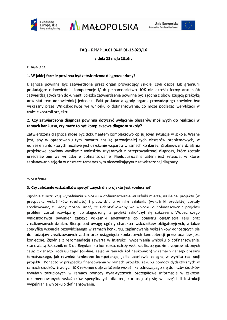 FAQ – RPMP.10.01.04-IP.01-12-023/16 z dnia 23 maja 2016r. DIAGNOZA 1. W jakiej formie powinna być zatwierdzona diagnoza szkoły? Diagnoza powinna być zatwierdzona przez organ prowadzący szkołę, czyli osobę lub gremium posiadające odpowiednie kompetencje i/lub pełnomocnictwo. IOK nie określa formy oraz osób zatwierdzających ten dokument. Ścieżka zatwierdzenia powinna być zgodna z obowiązującą praktyką oraz statutem odpowiedniej jednostki. Fakt posiadania zgody organu prowadzącego powinien być wskazany przez Wnioskodawcę we wniosku o dofinansowanie, co może podlegać weryfikacji w trakcie kontroli projektu. 2. Czy zatwierdzona diagnoza powinna dotyczyć wyłącznie obszarów możliwych do realizacji w ramach konkursu, czy może to być kompleksowa diagnoza szkoły? Zatwierdzona diagnoza może być dokumentem kompleksowo opisującym sytuację w szkole. Ważne jest, aby w opracowaniu tym zawarto analizę przynajmniej tych obszarów problemowych, w odniesieniu do których możliwe jest uzyskanie wsparcia w ramach konkursu. Zaplanowane działania projektowe powinny wynikać z wniosków uzyskanych z przeprowadzonej diagnozy, które zostały przedstawione we wniosku o dofinansowanie. Niedopuszczalna zatem jest sytuacja, w której zaplanowano zajęcia w obszarze tematycznym niewynikającym z zatwierdzonej diagnozy. WSKAŹNIKI 3. Czy założenie wskaźników specyficznych dla projektu jest konieczne? Zgodnie z Instrukcją wypełniania wniosku o dofinansowanie wskaźniki mierzą, na ile cel projektu (w przypadku wskaźników rezultatu) i przewidziane w nim działania (wskaźniki produktu) zostały zrealizowane, tj. kiedy można uznać, że zidentyfikowany we wniosku o dofinansowanie projektu problem został rozwiązany lub złagodzony, a projekt zakończył się sukcesem. Wobec czego wnioskodawca powinien założyć wskaźniki adekwatne do pomiaru osiągnięcia celu oraz zrealizowanych działań. Biorąc pod uwagę ogólny charakter wskaźników obligatoryjnych, a także specyfikę wsparcia przewidzianego w ramach konkursu, zaplanowanie wskaźników odnoszących się do rodzajów zrealizowanych zadań oraz osiągnięcia konkretnych kompetencji przez uczniów jest konieczne. Zgodnie z rekomendacją zawartą w Instrukcji wypełniania wniosku o dofinansowanie, stanowiącą Załącznik nr 3 do Regulaminu konkursu, należy wskazać liczbę godzin przeprowadzonych zajęć z danego rodzaju zajęć (on-line, zajęć w ramach kół naukowych) w ramach danego obszaru tematycznego, jak również konkretne kompetencje, jakie uczniowie osiągną w wyniku realizacji projektu. Ponadto w przypadku finansowania w ramach projektu zakupu pomocy dydaktycznych w ramach środków trwałych IOK rekomenduje założenie wskaźnika odnoszącego się do liczby środków trwałych zakupionych w ramach pomocy dydaktycznych. Szczegółowe informacje w zakresie rekomendowanych wskaźników specyficznych dla projektu znajdują się w części II Instrukcji wypełniania wniosku o dofinansowanie. 4. Czy wykonanie wskaźnika przypisanego do kwoty ryczałtowej należy dokumentować z każdym wnioskiem o płatność, czy na koniec rozliczając kwotę ryczałtową? Zgodnie zapisami umowy o dofinansowanie projektu rozliczanymi kwotami ryczałtowymi: kolejne transze dofinansowania (n+1) przekazywane są po złożeniu i zweryfikowaniu wniosku o płatność rozliczającego ostatnią transzę dofinansowania (n), (…) w którym wykazano wydatki kwalifikowalne wynikające z realizacji zadań objętych kwotą ryczałtową rozliczające co najmniej 70% łącznej kwoty otrzymanych transz dofinansowania lub po zatwierdzeniu wniosku o płatność, w którym Beneficjent oświadczył, ze wydatkował 70% otrzymanych transz, oraz zatwierdzeniu przez IP wniosku o płatność rozliczającego przedostatnią transzę dofinansowania (n-1). Dokumenty, które stanowią dowód wykonania tych zadań zostały wymienione w umowie o dofinansowanie projektu. 5. Jak określić liczbę uczestników w kontekście wskaźnika obowiązkowego liczba uczniów, którzy nabyli kompetencje kluczowe po opuszczeniu programu? Wnioskodawca powinien na podstawie diagnozy ustalić, jaka liczba uczniów jest zainteresowana korzystaniem z projektu. Następnie w oparciu o te informacje należy zaplanować liczbę osób, które wezmą udział w projekcie. Liczba osób, które uzyskały kompetencje w wyniku realizacji wsparcia projektowego, powinna być oszacowana rzetelnie i racjonalnie. W tym celu zasadne jest uwzględnienie doświadczenia w realizacji podobnych przedsięwzięć. Należy przy tym wziąć pod uwagę fakt, że dla tego wskaźnika osoba uczestnicząca w kilku rodzajach zajęć i osiągająca w efekcie różne kompetencje kluczowe wykazywana jest tylko raz. 6. Pytanie dotyczy wskaźnika udział projektu w odniesieniu do obszaru objętego programem rewitalizacji. Jeśli szkoła nie jest zlokalizowana na obszarze rewitalizowanym, ale uczniowie mieszkają na takim obszarze, w jaki sposób należy określić wartość docelową wskaźnika? Czy w takiej sytuacji można uznać, iż projekt wpływa na obszar rewitalizowany? W takim przypadku udział projektu w odniesieniu do obszaru programu rewitalizacji należy oszacować proporcjonalnie do wydatków planowanych do poniesienia lub poniesionych na danym obszarze, tj. w odniesieniu do uczestników projektu zamieszkujących obszar rewitalizowany. FINANSE 7. W jaki sposób wykazać wkład pieniężny w budżecie? Wkład pieniężny powinien zostać wykazany w części I Budżet ogólny w wierszu w tym w ramach kosztów bezpośrednich lub w wierszu w tym w ramach kosztów pośrednich. Planując wkład własny, należy zawsze dokonać sprawdzenia wymaganego poziomu wkładu własnego dla danej wartości projektu. 8. Czy dopuszczalne jest wniesienie wkładu własnego w formie niefinansowej? Jeżeli tak, to jak należy poprawnie taki wkład oznaczyć we wniosku oraz jak należy dokumentować wniesiony wkład w