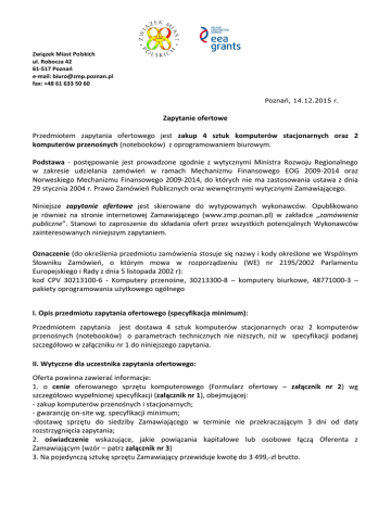 Związek Miast Polskich ul. Robocza 42 61-517 Poznań e-mail: [email protected] fax: +48 61 633 50 60 Poznań, 14.12.2015 r. Zapytanie ofertowe Przedmiotem zapytania ofertowego jest zakup 4 sztuk komputerów stacjonarnych oraz 2 komputerów przenośnych (notebooków) z oprogramowaniem biurowym. Podstawa - postępowanie jest prowadzone zgodnie z wytycznymi Ministra Rozwoju Regionalnego w zakresie udzielania zamówień w ramach Mechanizmu Finansowego EOG 2009-2014 oraz Norweskiego Mechanizmu Finansowego 2009-2014, do których nie ma zastosowania ustawa z dnia 29 stycznia 2004 r. Prawo Zamówień Publicznych oraz wewnętrznymi wytycznymi Zamawiającego. Niniejsze zapytanie ofertowe jest skierowane do wytypowanych wykonawców. Opublikowano je również na stronie internetowej Zamawiającego (www.zmp.poznan.pl) w zakładce „zamówienia publiczne”. Stanowi to zaproszenie do składania ofert przez wszystkich potencjalnych Wykonawców zainteresowanych niniejszym zapytaniem. Oznaczenie (do określenia przedmiotu zamówienia stosuje się nazwy i kody określone we Wspólnym Słowniku Zamówień, o którym mowa w rozporządzeniu (WE) nr 2195/2002 Parlamentu Europejskiego i Rady z dnia 5 listopada 2002 r): kod CPV 30213100-6 - Komputery przenośne, 30213300-8 – komputery biurkowe, 48771000-3 – pakiety oprogramowania użytkowego ogólnego I. Opis przedmiotu zapytania ofertowego (specyfikacja minimum): Przedmiotem zapytania jest dostawa 4 sztuk komputerów stacjonarnych oraz 2 komputerów przenośnych (notebooków) o parametrach technicznych nie niższych, niż w specyfikacji podanej szczegółowo w załączniku nr 1 do niniejszego zapytania. II. Wytyczne dla uczestnika zapytania ofertowego: Oferta powinna zawierać informacje: 1. o cenie oferowanego sprzętu komputerowego (Formularz ofertowy – załącznik nr 2) wg szczegółowo wypełnionej specyfikacji (załącznik nr 1), obejmującej: - zakup komputerów przenośnych i stacjonarnych; - gwarancję on-site wg. specyfikacji minimum; -dostawę sprzętu do siedziby Zamawiającego w terminie nie przekraczającym 3 dni od daty rozstrzygnięcia zapytania; 2. oświadczenie wskazujące, jakie powiązania kapitałowe lub osobowe łączą Oferenta z Zamawiającym (wzór – patrz załącznik nr 3) 3. Na pojedynczą sztukę sprzętu Zamawiający przewiduje kwotę do 3 499,-zł brutto. III. Zasady współpracy, które będą zawarte w zamówieniu. 1. Zakup realizowany będzie na podstawie zamówienia. 2. Zamówienie określi warunki dostawy (max. 3 dni od daty rozstrzygnięcia postępowania), płatności (na podstawie faktur VAT wystawionych przez wybranego Dostawcę/Wykonawcę płatnych w ciągu 7 dni od daty odbioru). 3. Na każdy z komputerów będzie wystawiona oddzielna faktura. IV. Wybór Wykonawcy. 1. Przesłane oferty będą oceniane w dwu etapach: 1.1. Ocena spełnienia minimalnych wymogów technicznych określonych w niniejszej specyfikacji – załącznik nr 1 – Specyfikacja techniczna i opis spełnienia wymogów 1.2. Te z ofert, które spełniają minimalne wymogi techniczne zostaną ocenione pod względem kryterium ceny (brutto) – załącznik nr 2 2. Zamawiający dokona porównania i wyboru najkorzystniejszej ofert spośród wszystkich złożonych zgodnie z warunkami zapytania ofertowego – przy czym zostanie wybrany sprzęt o najniższej cenie. V. Termin i miejsce złożenia oferty na realizację ww. usług. Oferta powinna odpowiadać w pełni na zapytanie ofertowe, powinna określać Wykonawcę/Dostawcę oraz wskazywać osobę do kontaktu – zgodnie z formularzem stanowiącym załącznik nr 2 do niniejszego zapytania ofertowego. Oferty prosimy przesyłać do 17 grudnia 2015 r. do godz. 12:00 na adres biura ZMP podany w nagłówku zapytania. Prosimy o przesyłanie ofert e-mailem na adres: [email protected] . Oferta może być również przesłana faxem lub za pośrednictwem poczty i jej otrzymanie (decyduje data wpływu) w każdej z tych form w określonym w zapytaniu terminie uznane będzie jako spełnienie warunku dotrzymania terminu złożenia oferty. Wszystkich dodatkowych informacji na temat zapytania ofertowego udziela Mikołaj Śmiarowski, tel. 606 484 148, e-mail [email protected] Z poważaniem Alicja Grenda Data: 14 grudnia 2015r. Z-ca Dyrektora Biura ZMP podpis osoby mającej uprawnienia do reprezentowania Zamawiającego Załącznik nr 1 do zapytania ofertowego Przedmiot zamówienia parametry wymagane minimum parametry oferowane system operacyjny Windows 7 Professional 64-bit PL Procesor: Intel Core i5 Pamięć podręczna: Pamięć RAM :4 GB DDR3 (możliwość rozszerzenia do min. 12 GB) Dysk HDD: 500 GB napęd optyczny: DVD SuperMulti; DVD+ RW; 24x (CD)/8x (DVD) karta graficzna typu: Intel HD Graphics 4000; 2 GB komputer przenośny lub o równoważnych parametrach (notebook), komputery stacjonarne praca w sieci: 802.11n;, Gigabit Ethernet Gwarancja: 36 miesięcy (on site), w miejscu instalacji Oprogramowanie: preinstalowany system operacyjny Windows 7 Professional 64-bit PL Microsoft Office 2013 dla Użytkowników Domowych i Małych Firm 32/64 Bit PL (zawierający min. Word, Excel, PowerPoint, OneNote i Outlook oraz dla jednej sztuki komputera stacjonarnego - Access) sterowniki, dysk startowy z systemem operacyjnym na osobnym nośniku (CD/DVD); oraz dysk z nośnikiem oprogramowania MS Office (Box) interfejsy: 3 x USB 3.0, wejście i wyjście słuchawek Warunki dodatkowe: Komputer przenośny elementy wbudowane: zintegrowana kamera internetowa; karta dźwiękowa; głośniki stereo, mikrofon, panel dotykowy, wbudowana klawiatura numeryczna; interfejsy: 3 x USB 3.0, wejście i wyjście słuchawek, HDMI, VGA, LAN, czytniki kart (minimum 3 typów/systemów) praca na baterii: min 4 godz. Klawiatura - podświetlana waga nie przekraczająca 2,5 kg z bateriami wyświetlacz 15''; (rozdzielczość 1920x1080; Full HD, anti glare) klawiatura plus myszka bezprzewodowa Komputery stacjonarne monitor od 22" do 24" (cale), LCD, rozdzielczo