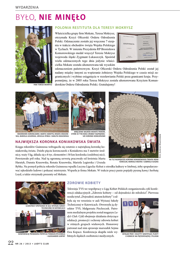 WYDARZENIA BYŁO, NIE MINĘŁO POLONIA RESTITUTA DLA TERESY MOKRYSZ REKORDOWE KORONCZARKI: MARTA HARATYK, RENATA KRASOWSKA, MARIOLA LEGIERSKA, URSZULA RYBKA I DANUTA KRASOWSKA WRĘCZENIE NAGRÓD MOKATE PANIOM, KTÓRE W TYM ROKU ZROBIŁY NAJPIĘKNIEJSZE KORONKI KONKURSOWE NAJWIĘKSZA KORONKA KONIAKOWSKA ŚWIATA Fot. Janusz Małyjurek PANI TERESA MOKRYSZ Właścicielka grupy firm Mokate, Teresa Mokrysz, otrzymała Krzyż Oficerski Orderu Odrodzenia Polski. Odznaczenie zostało jej wręczone 7 sierpnia w trakcie obchodów święta Wojska Polskiego w Tychach. W imieniu Prezydenta RP Bronisława Komorowskiego medal wręczył Teresie Mokrysz wojewoda śląski Zygmunt Łukaszczyk. Spośród wielu odznaczonych tego dnia jedynie właścicielka Mokate została uhonorowana tak wysokim odznaczeniem państwowym. Krzyż Oficerski Orderu Odrodzenia Polski został jej nadany między innymi za wspieranie żołnierzy Wojska Polskiego w czasie misji zagranicznych i wybitne osiągnięcia w rozsławianiu Polski poza granicami kraju. Przypomnijmy, że w 2005 roku Teresa Mokrysz została uhonorowana Krzyżem Komandorskim Orderu Odrodzenia Polski. Gratulujemy! Księga rekordów Guinnessa wzbogaciła się ostatnio o największą koronkę koniakowską świata. Dzieło pięciu koronczarek z Koniakowa ma 5 metrów średnicy, waży 5 kg, składa się z 8 tys. elementów i 50 km kordonka (ozdobnej nici). Powstawało pół roku. Nad tą ogromną serwetą pracowały od kwietnia Marta NA TLE NAJWIĘKSZEJ KORONKI KONIAKOWSKIEJ ŚWIATA IRENA KAWULOK, MARIOLA WOJTAS I GABRIELA SUSZKA Haratyk, Danuta Krasowska, Renata Krasowska, Mariola Legierska i Urszula Rybka. Na pomysł pobicia rekordu Guinnessa wpadła Lucyna Ligocka-Kohut z ośrodka kultury w Istebnej, żeby spopularyzować rękodzieło ludowe i pokazać mistrzynie. Wsparła je firma Mokate. W trakcie pracy panie popijały pyszną kawę i herbatę Loyd, a także otrzymały prezenty od Mokate. ZDROWIE KOBIETY UCZESTNICY SPOTKANIA W AULI WYŻSZEJ SZKOŁY TECHNICZNEJ W KATOWICACH KONFERENCJĘ PROWADZILI PATRYCJA TOMASZCZYK-KINDLA I ALEKSANDER GORTAT 22 NR 26 / 2013 • LADY’S CLUB Telewizja TVS we współpracy z Ligą Kobiet Polskich zorganizowała cykl konferencji edukacyjnych „Zdrowie kobiety – od dojrzałości do młodości”. Pierwsza nosiła tytuł „Dojrzałość atutem kobiety” i odbyła się we wrześniu w auli Wyższej Szkoły Technicznej w Katowicach. Otworzyła ją dyrektor TVS, Małgorzata Piechoczek. Patronem medialnym projektu został magazyn Lady’s Club. Cykl obejmuje działania dotyczące edukacji, promocji i ochrony zdrowia kobiet w różnych grupach wiekowych. Honorowy patronat nad nim sprawuje marszałek Sejmu Ewa Kopacz. Konferencja skupiła wiele wyWYKŁAD PROF. VIOLETTY SKRZYPULEC-PLINTY bitnych śląskich osobistości medycznych. O KOBIECIE NA PIĘĆDZIESIĄTKĘ Z PLUSEM NOWOŚCI NISSANA Micra, Note, Leaf – bielska firma Japan Motors zorganizowała z końcem lata w salonie przy ul. Wyzwolenia przedpremierowy pokaz nowych modeli Nissana. Wzbudził on spore zainteresowanie miłośników motoryzacji. Nowe odsłony popularnych modeli spodobały się oglądającym, bo są to samochody nowoczesne, eleganckie, wysmakowane w swojej stylistyce. Na liczne pytania odpowiadali eksperci, wśród nich Tomasz Patrzykowski i Radek Pszczółka. Szczególne zainteresowanie wzbudził model elektrycznego Leafa. Nie jest to auto tanie, ale bez wątpienia z przyszłością. Kolejna generacja eko-auta na polskim rynku oznacza, że Nissan docenił troskę Polaków o ochronę środowiska. Cena elektrycznego kompaktu o zerowej emisji spalin rozpoczyna się jednak od 126.080 zł, więc ekologia ma swoją wartość. Od czegoś trzeba jednak zacząć. Nissan Leaf przeszedł szereg modyfikacji i został dostosowany do wymagań europejskich klientów. To pierwszy na świecie samochód w 100% elektryczny. Jego realny zasięg po naładowaniu wynosi 199 km. Do napędu służy w pełni zintegrowany układ obejmujący ładowarkę, falownik i silnik elektryczny. Ładowarka umieszczona jest pod pokrywą silnika. Ładowanie ze standardowego gniazdka trwa około 8 godzin, jednak dzięki opcjonalnej ładowarce można skrócić ten czas o połowę albo i więcej. Koszt przejazdu 100 km wynosi tylko 7,4 zł! Bielszczanom spodobał się ten 5-drzwiowy hatchback. Na świecie sprzedano już 65 tys. Leafów, w Bielsku na razie ani jednego, ale cierpliwości... SAMURAJE IAIDŌ W WILKOWICACH Klub Szermierki Japońskiej Renshudojo we współpracy z Polskim Stowarzyszeniem Iaidō zorganizował na początku października w Wilkowicach koło Bielska-Białej ogólnopolski staż szkoleniowy iaidō. Zajęcia prowadził Krzysztof Górnicki z Opola (na co dzień informatyk), prezes Polskiego Stowarzyszenia Iaidō, 6 dan iaidō Renshi, który pobierał nauki m.in. od Sensei Hakuo Sagawa (8 dan kendo, 9 dan iaidō). Takie treningi, jak ostatnio w Wilkowicach, adepci tej sztuki odbywają co dwa miesiące. W programie były ćwiczenia seitei iai, koryu musoshindenryu. Mistrz Górnicki ćwiczy iaidō od ponad 20 lat, zaczął w Niemczech, a egzaminy na 4, 5 i 6 stopień tej sztuki zdawał w Japonii. Iaidō jest sztuką dobywania miecza (katana), japońską narodową odmianą szermierki. Kanon tej sztuki powstał około roku 1500 dzięki wojownikowi Hayashizaki Jinsuke Minamoto no Shigenobu. Nauczał on sposobów błyskawicznego wyjmowania miecza z pochwy i zadawania uderzenia w nieprzerwanym ruchu. Usystematyzowana tradycja iaidō przekazywana była z pokolenia na pokolenie. Największy rozwój zawdzięcza mistrzowi Hayashizaki Jinsuke Shigenobu, który 400 lat temu stworzył pierwszą szkołę, co pozwoliło na uznanie jej za samodzielną sztukę walki. Iaidō jest sztuką przewidywania ataku przeciwnika, obrony i przeprowadzenia własnego kontrataku. Dla samuraja miecz był czymś więcej niż zwykłą bronią. Był też oznaką rangi, męskości, uosobieniem honoru i lojalności, której się 