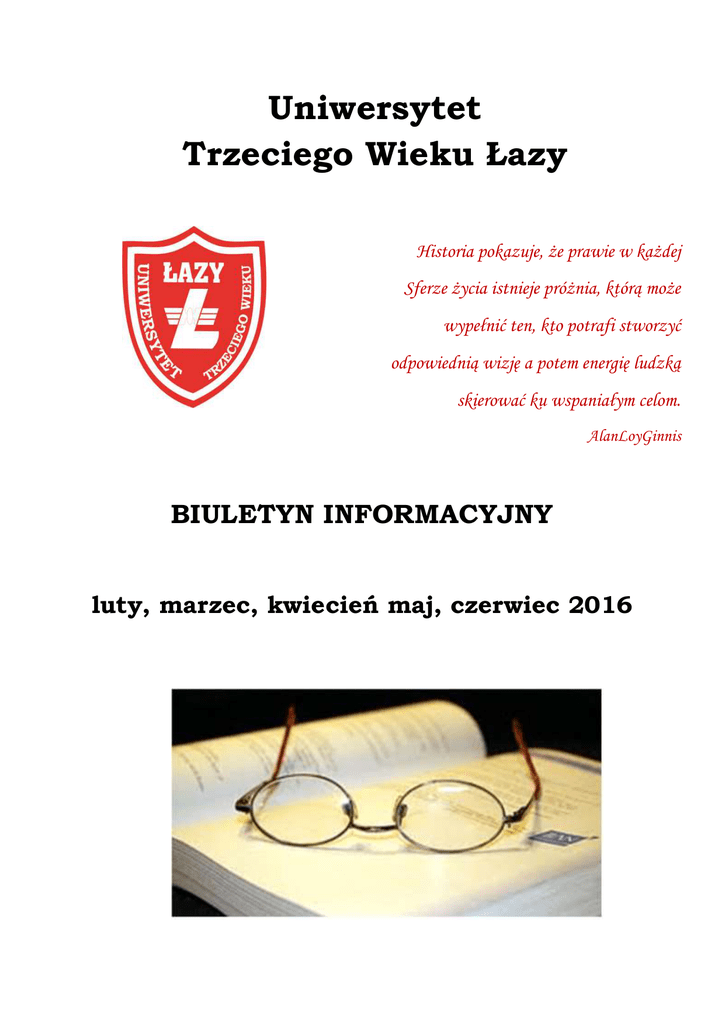 Uniwersytet Trzeciego Wieku Łazy Historia pokazuje, że prawie w każdej Sferze życia istnieje próżnia, którą może wypełnić ten, kto potrafi stworzyć odpowiednią wizję a potem energię ludzką skierować ku wspaniałym celom. AlanLoyGinnis BIULETYN INFORMACYJNY luty, marzec, kwiecień maj, czerwiec 2016 Tematy wykładów UTW dla słuchaczy w roku akademickim 2015/2016 (semestr letni) Miejski Ośrodek Kultury w Łazach ul. Kościuszki 5 Wykłady odbywają się w czwartki o godz. 17.00 data temat wykładowca 25.02.2016 03.03.2016 „Feministki” Jak współczesne rolnictwo wpływa na bioróżnorodność. Teatr „Miraż” Elilia Slimko 10.03.2016 Służba zdrowia na wesoło Pokaz strojów w stylu Coco Chanel Kabaret 50+ Modelki 50+ 17.03.2016 Debata dotycząca wolontariatu Przedstawiciele władz miasta 31.03.2016 Burzliwe dzieje Françoise Sagan 07.04.2016 Elekt cieplarniany Prof. Krystyna WojtynekMusik Krzysztof Figarski 14.04.2016 Zadziwiający Krym Andrzej Samarcew 21.04.2016 Komputer – internet a nowoczesne technologie Mgr inż. Paweł Kluba 28.04.2016 Zdrowy Senior – profilaktyka i fitoterapia Lek. med. Krzysztof Blecha 05.05.2016 Czy wszystkie drogi prowadzą do Rzymu? – Giganci odrodzenia Mgr Hanna Krzywda 12.05.2016 Irena Łopuszyńska 19.05.2016 Nanotechnologia w kosmetyce i medycynie Bezpieczeństwo Seniorów 02.06.2016 Walne Zebranie i zakończenie semestru Przedstawiciele Policji Dla Seniorów to naprawdę wielka sprawa, Że się mogą spotkać w Łazach, w Uniwersytecie. Tutaj mogą wysłuchać wykładów: O swym zdrowiu, o kraju, o świecie. W licznych sekcjach mogą oddać się swym pasjom: Malowaniu, gotowaniu czy kulturze, Mogą wybrać kijki, rower czy pływanie. Możliwości są naprawdę bardzo duże. Na Pogorii czeka na nich łódź „OLEŃKA”Chętnych śmiałków zawsze w piękny rejs zabiera. Dzięki takiej aktywności swych studentów UTW, co roku Olimpiadę swą otwiera. Jest z niej słynny, już nie tylko w naszym kraju, Ale również poza jego granicami. Trzeba wspomnieć o Seniorów Juwenaliach: Tu też Łazy słyną obrazami. A do tego literackich moc sukcesów; Wielką chwałę też Kabaret nam przysparza, A Modelek występ z ich kolekcją strojów, Wciąż sympatię otoczenia nam pomnaża. A wycieczki i imprezy kulturalne Rozwijają w nas wrażliwość i kulturę. I dlatego wszyscy naszą Alma Mater Opiewamy: pędzlem, słowem, piórem. Bożena Haczyk > 25.02.2016 Teatr MOK-u Miraż – spektakl „Feministki” Członkami tego Teatru są nasze studentki. Spektakl jest pracą dyplomową reżyserowaną przez mgr Dorotę Zglejc, studiującą na UW Pedagogikę teatru. Tematyka dotyczy trudności komunikacyjnych na styku relacji damsko- męskich. >3.032016 „Jak współczesne rolnictwo wpływa na bioróżnorodność” Emilia Slimko Emulia Slimko – edukatorka ekologiczna; współtworzy krakowską fundację Otwarty Plan, od kilku lat współpracuje z Polską Zieloną Siecią, w której prowadzi kampanię „Wyżywić świat” na rzecz suwerenności żywieniowej oraz „Klimat dla rolników” - o zrównoważonym rolnictwie. Wykład będzie dotyczył bioróżnorodności w kontekście rolnictwa. >10.03.2016 Dzień Kobiet W programie biorą udział nasze studentki występujące w Kabvarecie 50+ i pokaz mody w wykonaniu Modelek 50+ >17.03.2016 Debata z udziałem Władz Miasta i Gminy Łazy – dotycząca wolontariatu. >31.03.2016 „Burzliwe dzieje Françoise Sagan” Prof. Krystyna Wojtynek – Musik Jej dziedziną naukową jest romanistyka, gł. literaturoznawstwo francuskie i włoskie Saganka (1935 – 2004) – jedna z największych skandalistek Francji. Autorka kultowych powieści, kobieta barwna i niepospolita. Swą błyskotliwą karierę literacką rozpoczęła brawurowo, jako 18-letnia dziewczyna powieścią „Witaj smutku”. Była prekursorką swobód obyczajowych we Francji…. >7.04.2016 „Efekt cieplarniany – przyczyny, konsekwencje, możliwość zapobiegania” Mgr Krzysztof Figarski Absolwent Prawa i Administracji UMCS w Lublinie. Podobnie jak All Gore stara się przybliżyć ludziom obecną sytuację na naszej planecie, jeśli chodzi o efekt cieplarniany, zmiany klimatyczne oraz przyszłość, jaka czeka nas i kolejne pokolenia, jeśli nie zmieni się podejście człowieka do ekologii. Uczestniczy oraz wykłada na wielu szkoleniach i konferencjach poświęconych tematyce efektu cieplarnianego. >14.04.2016 „Zadziwiający Krym” Andrzej Samarcew Animator kultury, globtroter, miłośnik i wykonawca pieśni i ballad rosyjskich; na swych spotkaniach porywa słuchaczy swoim przekazem. >21.04 2016 „Internet i komputer a nowoczesne technologie” Paweł Kluba Absolwent Politechniki śląskiej w Gliwicach, informatyk. >28.04.2016 „Zdrowy Senior – profilaktyka i fitoterapia” Lek. med. Krzysztof Blecha Lek. med. Krzysztof Blecha z Centrum Ziołolecznictwa O.Grzegorza; lekarz z wieloletnim doświadczeniem w obszarze fitoterapii, współpracujący przez wiele lat z O. Grzegorzem Sroką – niekwestionowanym autorytetem w zakresie ziołolecznictwa. Prezentacja fitoterapeutę. dot. Profilaktyki zdrowia Seniorów, prowadzona przez lek. med., >5.05.2016 „Czy wszystkie drogi prowadzą do Rzymu? – Giganci Odrodzenia” Mgr Hanna Krzywda Mgr Hanna Krzywda – wieloletni nauczyciel historii w LO, współautorka monografii, wielokrotnie uhonorowana nagrodami. Zostaniemy zabrani w podróż do Florencji, kolebki włoskiego Renesansu, miasta niezwykłego, pełnego kwiatów, artystów i niezrównanych dzieł sztuki. Poznamy także życie i twórczość artystów, jakich historia nie znała nigdy wcześniej ani później, czyli Leonarda da Vinci i Michała Anioła. >12.05.2016 „Nanotechnologia w kosmetyce i medycynie” Irena Łopuszyńska Irena Łopuszyńska od 25 lat zajmuje się promocją zdrowia i kosmetologią. Wykład przedstawia najnowsze osiągnięcia w nanotechnologii ( nanocząsteczki są to bardzo małe cząstki materii;