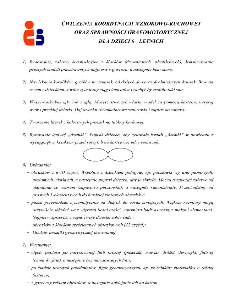 ĆWICZENIA KOORDYNACJI WZROKOWO-RUCHOWEJ ORAZ SPRAWNOŚCI GRAFOMOTORYCZNEJ DLA DZIECI 6 - LETNICH 1) Budowanie, zabawy konstrukcyjne z klocków (drewnianych, plastikowych), konstruowanie prostych modeli przestrzennych najpierw wg wzoru, a następnie bez wzoru. 2) Nawlekanie koralików, guzików na sznurek, od dużych do coraz drobniejszych dziurek. Baw się razem z dzieckiem, stwórz rytmiczny ciąg elementów i zachęć by zrobiło taki sam. 3) Wyszywanki bez igły lub z igłą. Możesz stworzyć własny model za pomocą kartonu, narysuj wzór i przekłuj dziurki. Daj dziecku różnokolorowe sznurówki i zaproś do zabawy. 4) Tworzenie literek z kolorowych pinezek na tablicy korkowej. 5) Rysowanie leniwej „ósemki”. Poproś dziecko, aby rysowało kształt „ósemki” w powietrzu z wyciągniętym kciukiem przed sobą lub na kartce bez odrywania ręki. 6) Układanie: obrazków z 6-10 części. Wspólnie z dzieckiem potnijcie, np. pocztówki wg linii pionowych, poziomych, ukośnych, a następnie poproś dziecko, aby je złożyło. Można rozpocząć zabawę od układania ze wzorem (zapasowa pocztówka), a następnie samodzielnie. Przechodzimy od prostych 1-elementowych do bardziej złożonych obrazków; puzzli przechodząc systematycznie od dużych do coraz mniejszych. Większe rozmiary mogą oczywiście składać się z większej ilości części, natomiast bądź ostrożny z małymi elementami. Najpierw sprawdź, z czym Twoje dziecko sobie radzi; obrazków z klocków sześciennych obrazkowych (12 części); klocków mozaiki geometrycznej drewnianej. 7) Wycinanie: cięcie papieru po narysowanej linii prostej (paseczki, trawka, dróżki, deszczyk), falistej (chmurki, fale), a następnie bez narysowanych linii; po śladzie prostych przedmiotów, figur geometrycznych, np. ze ścinków materiałów o różnej fakturze; z gazet czy reklam obrazków, a następnie naklejanie ich na karton. 8) Kreślenie dużych swobodnych ruchów: jedną ręka w powietrzu, na dywanie przy użyciu obu rąk jednocześnie, np. w kształcie torów kolejowych, fal, okien, ślimaków. 9) Kalkowanie, pisanie po śladzie. Pogrubianie konturów obrazków, rysunków. 10) Odwzorowywanie graficzne szlaczków, ornamentów, wzorów z pojedynczych elementów złożonych ze znaków (linie proste, faliste, kropki), figur geometrycznych czy symboli. 11) Odtwarzanie kształtów przedmiotów przez łączenie liniami punktów, a następnie zamalowywanie specjalnie oznaczonych pól. 12) Malowanie linii falujących, poziomych, pionowych, pętli: palcem na całej powierzchni papieru, farbami, pęczkiem waty, pędzlem. 13) Rysowanie: na różnych formatach papieru z wykorzystaniem całej powierzchni arkusza, piórkiem na tackach z materiałem sypkim, kredą na tablicy, węglem, mazakiem, patykiem na śniegu, ubitej ziemi. 14) Lepienie z plasteliny, modeliny, gliny, z masy solnej: cienkich wałeczków, prostych kształtów, form kulistych, miseczek, rzeźb warzyw, owoców, ugniatanie plasteliny i zapełnianie nią powierzchni obrazków 15) Ugniatanie kul i małych kulek z gazet, bibułki 16) Wykonywanie drobnych ruchów palcami: spacerowanie palcami po stole, naśladowanie gry na fortepianie jedną ręką i obiema rękami, odtwarzanie rytmu padającego deszczu 17) Masowanie palców, dłoni, przedramion.