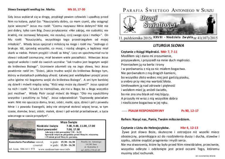 Słowa Ewangelii według św. Marka. Mk 10, 17-30 Gdy Jezus wybierał się w drogę, przybiegł pewien człowiek i upadłszy przed Nim na kolana, pytał Go: "Nauczycielu dobry, co mam czynić, aby osiągnąć życie wieczne?" Jezus mu rzekł: "Czemu nazywasz Mnie dobrym? Nikt nie jest dobry, tylko sam Bóg. Znasz przykazania: «Nie zabijaj, nie cudzołóż, nie kradnij, nie zeznawaj fałszywie, nie oszukuj, czcij swego ojca i matkę»". On Mu rzekł: "Nauczycielu, wszystkiego tego przestrzegałem od mojej młodości". Wtedy Jezus spojrzał z miłością na niego i rzekł mu: "Jednego ci brakuje. Idź, sprzedaj wszystko, co masz, i rozdaj ubogim, a będziesz miał skarb w niebie. Potem przyjdź i chodź za Mną". Lecz on spochmurniał na te słowa i odszedł zasmucony, miał bowiem wiele posiadłości. Wówczas Jezus spojrzał wokoło i rzekł do swoich uczniów: "Jak trudno jest bogatym wejść do królestwa Bożego". Uczniowie zdumieli się na Jego słowa, lecz Jezus powtórnie rzekł im: "Dzieci, jakże trudno wejść do królestwa Bożego tym, którzy w dostatkach pokładają ufność. Łatwiej jest wielbłądowi przejść przez ucho igielne niż bogatemu wejść do królestwa Bożego". A oni tym bardziej się dziwili i mówili między sobą: "Któż więc może się zbawić?" Jezus spojrzał na nich i rzekł: "U ludzi to niemożliwe, ale nie u Boga; bo u Boga wszystko jest możliwe". Wtedy Piotr zaczął mówić do Niego: "Oto my opuściliśmy wszystko i poszliśmy za Tobą". Jezus odpowiedział: "Zaprawdę powiadam wam: Nikt nie opuszcza domu, braci, sióstr, matki, ojca, dzieci i pól z powodu Mnie i z powodu Ewangelii, żeby nie otrzymał stokroć więcej teraz, w tym czasie, domów, braci, sióstr, matek, dzieci i pól wśród prześladowań, a życia wiecznego w czasie przyszłym". 7.00, 9.00, 11.00, 17.00 7.00, 17.00 Adoracja w dni powszednie 7.30 – 16.30 Spowiedź święta na pół godziny przed Mszą św. wieczorną i 15 minut przed Mszą św. poranną. Kancelaria Parafialna: wtorek, w godz: 15.30 - 16.30 czwartek w godz: 15.30 - 16.30 tel. kom. 506 611 573 www.sanktuarium-susz.info W SUSZU 11. października 2015r. XXV III - Niedziela Zw ykła nr 41(107)/2015 LITURGIA SŁOWA Czytanie z Księgi Mądrości. Mdr 7, 7-11 Modliłem się i dano mi zrozumienie, przyzywałem, i przyszedł na mnie duch mądrości. Przeniosłem ją na berła i trony i w porównaniu z nią za nic miałem bogactwa. Nie porównałem z nią drogich kamieni, bo wszystko złoto wobec niej jest garścią piasku, a srebro przy niej ma wartość błota. Umiłowałem ją nad zdrowie i piękność i wolałem mieć ją aniżeli światło, bo nie zna snu blask od niej bijący. A przyszły mi wraz z nią wszystkie dobra i niezliczone bogactwa w jej ręku. PSALM RESPONSORYJNY Ps 90, 12-17 Refren: Nasyć nas, Panie, Twoim miłosierdziem. Msze Święte Niedziela i święta Dzień powszedni P A R A F I A Ś W I Ę T E G O ANTONIEGO Parafia św. Antoniego 14-240 Susz ul. Kościelna 6 tel. (055) 278 63 49 Czytanie z Listu do Hebrajczyków. Hbr 4, 12-13 Żywe jest słowo Boże, skuteczne i ostrzejsze niż wszelki miecz obosieczny, przenikające aż do rozdzielenia duszy i ducha, stawów i szpiku, zdolne osądzić pragnienia i myśli serca. Nie ma stworzenia, które by było przed Nim niewidzialne, przeciwnie, wszystko odkryte i odsłonięte jest przed oczami Tego, któremu musimy zdać rachunek. cd. n a os tatniej stronie OGŁOSZENIA PARAFIALNE Intencje Mszy św. 1. Trwa miesiąc październik zapraszamy na modlitwę różańcową o godzinie 16.30, dzieci zapraszamy we wtorek również na 16.30. 2. Poszukujemy osób, które chciałyby pomóc w zabezpieczeniu naszej wieży przed ptakami, (stolarka okienna, siatka itp.) 3. Ofiary, które składamy dzisiaj na tacę przeznaczone są na spłatę 7.00 9.00 11.00 17.00 naszego dachu. 4. Dzisiaj obchodzimy Dzień Papieski do puszek będą zbierane 7.00 ofiary na Dzieło Nowego Tysiąclecia. Wszystkich zapraszamy 17.00 dzisiaj na godzinę 21.00 na wspomnienie o św. Janie Pawle II. 5. Są wyłożone kartki z prośbami na nowennę do św. Antoniego, 7.00 17.00 którą odprawiamy w każdy wtorek, intencje będą odczytane przez 9. Kolejnych wtorków. Msza św. składkowa w każdy wtorek będzie odprawiana w intencjach czcicieli św. Antoniego. 7.00 17.00 6. Są wyłożone koperty z kartkami na wypominki listopadowe, roczne i na Msze zbiorową za zmarłych w dniu2. Listopada oraz 7.00 w miesiącu listopadzie, która będzie odprawiana codziennie o 17.00 godzinie 17.00. 7. Zapraszamy na Rekolekcje dla Małżeństw do Krynicy Morskiej na weekend 23-25.10 br., szczegóły w biuletynie. 8. Zapraszamy do zabierania biuletynu. I „Antka” dla dzieci i młodzieży 7.00 17.00 7.00 17.00 9. Wszystkim Jubilatom i Solenizantom życzymy wielu radosnych dni i Bożej opieki. 10. Serdecznie zapraszamy do nabywania „Gościa Niedzielnego” z naszym dodatkiem elbląskim w cenie 5zł, jest także Mały Gość niedzielny w cenie 4 zł. 7.00 9.00 11.00 17.00 11.10 XXVIII Niedziela Zwykła Śp. Anna i Jan Szczukowscy Śp. zmarli pochowani przez zakład po grzebowy Kalia Śp. Julian M ądry w 23.rocznicę śmierci. Śp. M irosław Przygócki, Antoni Białek – brat, Stefan Białek 12.10 – Poniedziałek O Boże błogosławieństwo i potrzebne łaski dla Radosława i Anny Śp. Ana w 42.rocznicę śmierci. 13.10 –Wtorek bł. Honorata Śp. Jadwiga W intencjach czcicieli św. Antoniego. 14.10 –Środa Śp. Tadeusz Błaszczak w 30 . dzień po pogrzebie. Śp. Kazimiera Karnat w 4.rocznicę śmierci, zmarli z rodzin: Karnat, Chapko i Dybich. 15 .10 – Czwartek św. Teresy od Jezusa Śp. Bogdan M archlewski w 1.rocznicę śmierci, Bron isław i Bronisław a M archlewscy. 16.10 – Piątek św . J adw igi Śląskiej . W intencji osób noszących szkaplerz. 17.10 – Sobo ta św. Ignacego Śp. Bożena i Ryszard Reda W intencji III Zakonu św. Franciszka 18.1 0 XXIX Niedziela Zw ykła Śp. Zofia, Bernard, 