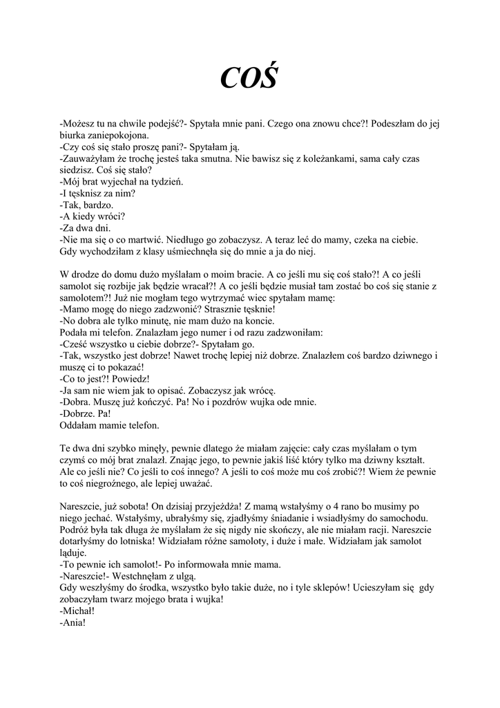 COŚ -Możesz tu na chwile podejść?- Spytała mnie pani. Czego ona znowu chce?! Podeszłam do jej biurka zaniepokojona. -Czy coś się stało proszę pani?- Spytałam ją. -Zauważyłam że trochę jesteś taka smutna. Nie bawisz się z koleżankami, sama cały czas siedzisz. Coś się stało? -Mój brat wyjechał na tydzień. -I tęsknisz za nim? -Tak, bardzo. -A kiedy wróci? -Za dwa dni. -Nie ma się o co martwić. Niedługo go zobaczysz. A teraz leć do mamy, czeka na ciebie. Gdy wychodziłam z klasy uśmiechnęła się do mnie a ja do niej. W drodze do domu dużo myślałam o moim bracie. A co jeśli mu się coś stało?! A co jeśli samolot się rozbije jak będzie wracał?! A co jeśli będzie musiał tam zostać bo coś się stanie z samolotem?! Już nie mogłam tego wytrzymać wiec spytałam mamę: -Mamo mogę do niego zadzwonić? Strasznie tęsknie! -No dobra ale tylko minutę, nie mam dużo na koncie. Podała mi telefon. Znalazłam jego numer i od razu zadzwoniłam: -Cześć wszystko u ciebie dobrze?- Spytałam go. -Tak, wszystko jest dobrze! Nawet trochę lepiej niż dobrze. Znalazłem coś bardzo dziwnego i muszę ci to pokazać! -Co to jest?! Powiedz! -Ja sam nie wiem jak to opisać. Zobaczysz jak wrócę. -Dobra. Muszę już kończyć. Pa! No i pozdrów wujka ode mnie. -Dobrze. Pa! Oddałam mamie telefon. Te dwa dni szybko minęły, pewnie dlatego że miałam zajęcie: cały czas myślałam o tym czymś co mój brat znalazł. Znając jego, to pewnie jakiś liść który tylko ma dziwny kształt. Ale co jeśli nie? Co jeśli to coś innego? A jeśli to coś może mu coś zrobić?! Wiem że pewnie to coś niegroźnego, ale lepiej uważać. Nareszcie, już sobota! On dzisiaj przyjeżdża! Z mamą wstałyśmy o 4 rano bo musimy po niego jechać. Wstałyśmy, ubrałyśmy się, zjadłyśmy śniadanie i wsiadłyśmy do samochodu. Podróż była tak długa że myślałam że się nigdy nie skończy, ale nie miałam racji. Nareszcie dotarłyśmy do lotniska! Widziałam różne samoloty, i duże i małe. Widziałam jak samolot ląduje. -To pewnie ich samolot!- Po informowała mnie mama. -Nareszcie!- Westchnęłam z ulgą. Gdy weszłyśmy do środka, wszystko było takie duże, no i tyle sklepów! Ucieszyłam się gdy zobaczyłam twarz mojego brata i wujka! -Michał! -Ania! Pobiegłam do niego najszybciej jak mogłam i go przytuliłam. Szybko, wszyscy weszli do samochodu. -No i jak było?- Spytałam. -Było super! Tyle fajnych rzeczy, no i widziałem lwy, tygrysy, małpy, żyrafy i słonie. No i tak rozmawialiśmy przez całą drogę. Jak już prawie dotarliśmy, przypomniałam sobie o czymś: -Mówiłeś że znalazłeś coś dziwnego. Co to? Michał włożył dłoń do jego granatowego plecaka i wyciągnął coś okrągłego. Przez chwilę oglądałam to coś, ale nie przypominało niczego prawdziwego. -Nie mam pojęcia co to jest.- Przyznałam się. -Najbardziej to przypomina jakieś jajko. -No może, ale to nie wygląda na prawdziwe jajko! -Sam wiem, ale jak nie jajko to co? Nie odpowiedziałam. Wjechaliśmy do naszego ogromnego garażu o 8:30 rano. Było widać po jego oczach że mój brat się cieszył z tego że jest w domu. Od razu pobiegł do swojego pokoju i szybko usnął. Długo przyglądałam się temu „jajku” i próbowałam to jakoś wyjaśnić ale nie było żadnego wyjaśnienia. Myślałam że to może być jakiś dziwny kamień, albo jajko dinozaura, albo jajo kosmity, albo jakiegoś smoka czy potwora. Wiem że to nie możliwe, ale nie ma innego wyjaśnienia. Nie pokazywałam jajka mamie bo pewnie by je wyrzuciła czy coś i potem byśmy mieli szlaban. Tej nocy nie mogłam spać, cały czas próbowałam wyjaśnić czym jest to jajko. Nagle z oddali usłyszałam dziwny dźwięk, jakby jakiś olbrzym się zbliżał. Szybko obudziłam brata i popatrzyliśmy przez okno. Okna były zaparowane więc nie dało się wszystkiego wyraźnie zobaczyć. Widzieliśmy jakąś czerwono pomarańczowo żółtą kropkę która robiła się coraz większa. Wreszcie zdaliśmy sobie sprawę że to wielki pożar! Spanikowaliśmy, nie wiedzieliśmy co zrobić, ale wiedzieliśmy że nie możemy tak stać bezczynnie. Bez wydawania żadnych dźwięków wyszliśmy z domu na podwórko. Zamknęliśmy za sobą drzwi i pobiegliśmy w stronę pożaru. Pożar był ogromny, większy niż go sobie wyobrażałam! -Boje się!- Szepnęłam mojemu bratu. -Nie ty jedna. Gdy się zbliżaliśmy, kątem oka zauważyłam coś wielkiego skaczącego z dachu na dach. -Michał, widziałeś?!- Zapytałam przerażona. -A co? -No, to coś wielkiego! Skakało z jednego budynku na drugi! -No weź nie żartuj! Mnie nie przestraszysz! -Ale ja nie kłamie! Naprawdę coś widziałam! -Wiem że kłamiesz! -Dobra jak mi nie wierzysz to sama wracam do domu! Szybko pobiegłam w stronę mojego domu. Mój brat mnie błyskawicznie dogonił: -Gdzie idziesz?!- Zapytał mnie. -Do domu! -No, ej! Poczekaj! -Ja się boje! Mama mnie zabije jak się obudzi rano i zobaczy że mnie nie ma! -No dobra! Chodźmy do domu!- Powiedział znudzony. Więc najszybciej jak mogliśmy, pobiegliśmy do domu. Otworzyliśmy drzwi jego kluczem (który zawsze ma przy sobie),weszliśmy do domu, z ulgą że nic nam się nie stało. Było bardzo cicho czyli chyba mama jeszcze spała chociaż była 7:15 rano. Niezauważeni weszliśmy do naszych pokoi i położyliśmy się w łóżkach, udając że śpimy. Po 10 minutach, mama weszła do pokoju, w swojej piżamie: -Dobrze się spało?- Zapytała mnie. -Tak, bardzo!- Skłamałam, chyba bym jej nie powiedziała o tym, o czym nie chciałam żeby wiedziała! -Za 15 minut przyjdź na dół na śniadanie. -Dobrze. Mama wyszła z pokoju, nie wyglądała na zdenerwowaną więc chyba wtedy spała. Zeszłam na dół. Mama czekała tam z naszym śniadaniem. Po chwili mój brat też się pojawił. Zjedliśmy śniadanie i poszliśmy do jego pokoju: -No i co, mama wie?- Zapytał zaniepokojony. -Raczej nie. -Fju! Cały dzi