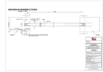 SKOCZNIA DO SKOKÓW O TYCZCE skala 1:100 4 300 200 Nawierzchnia sportowa pogrubiona do 20 mm 800 A1 Linia szer. 1,0cm Biała linia min. 200 (±1.00) 60 80 min. 600cm min. 800 100 A1 5 122 120 min. 600,00 5 ZESKOK 160 Fundament pod stojak do poprzeczki 80x160x120cm, góra na poziomie rozbiegu ZESKOK siedziba 71-247 SZCZECIN ul.Sebastiana Klonowica 23/11 tel/fax. (91) 81 82 664 inwestor / adres : GMINA MIASTO SUWAŁKI reprezentowana przez OŚRODEK SPORTU I REKREACJI ul. WOJSKA POLSKIEGO 2, 16-400 SUWAŁKI projekt / obiekt : Rozbudowa i przebudowa Stadionu Lekkoatletycznego Ośrodka Sportu i Rekreacji w Suwałkach adres inwestycji : SUWAŁKI 16-400 ul. WOJSKA POLSKIEGO 17 dz. nr 32996/6 obręb nr 9 rysunek / temat / treść : ARENA - SKOCZNIA DO SKOKU O TYCZCE autor /projektant imię i nazwisko podpis : mgr inż. arch. Dagmara Adamy-Kołodziejska upr. nr 16/ZPOIA/2006 sprawdził mgr inż arch. Robert Dawidowski upr. nr 50/Sz/2000 opracował inż. Ewa Felisiak mgr inż. arch. Agnieszka Strarska branża : faza : PBW skala : 1:100 rys . nr : ARCHITEKTURA data: GRUDZIEŃ 2012 17 PRAWAAUTORSKIE ZASTRZEŻONE Przedmiotowy projekt / utwór architektoniczny jest chroniony prawem autorskim zgodnie z art.1 i nastêpne Ustawy o Prawie Autorskim i Prawach Pokrewnych z dn. 4 lutego 1994 roku ( DU nr 24 poz.83 z 23 lutego 1994 r. )