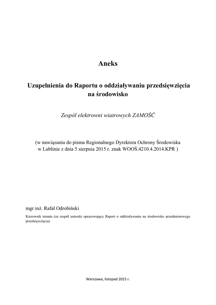 Aneks Uzupełnienia do Raportu o oddziaływaniu przedsięwzięcia na środowisko Zespół elektrowni wiatrowych ZAMOŚĆ (w nawiązaniu do pisma Regionalnego Dyrektora Ochrony Środowiska w Lublinie z dnia 5 sierpnia 2015 r. znak WOOŚ.4210.4.2014.KPR ) mgr inż. Rafał Odrobiński Kierownik tematu (za zespół autorski opracowujący Raport o oddziaływaniu na środowisko przedmiotowego przedsięwzięcia) Warszawa, listopad 2015 r. Aneks – Uzupełnienia do Raportu o oddziaływaniu przedsięwzięcia na środowisko Zespół Elektrowni Wiatrowych "Zamość" __________________________________________________________________________________ SPIS TREŚCI 1. UWAGI WSTĘPNE ........................................................................................................................ 3 2. ODPOWIEDZI NA UWAGI I UZUPEŁNIENIA DO RAPORTU O ODDZIAŁYWANIU PRZEDSIĘWZIĘCIA NA ŚRODOWISKO ................................................................................... 4 3. 2.1. UWAGI DOTYCZĄCE INFORMACJI OGÓLNYCH RAPORTU ...................................... 4 2.2. UWAGI DOTYCZĄCE OCHRONY PRZYRODY ............................................................. 24 2.3. UWAGI DOTYCZĄCE OCHRONY PRZED HAŁASEM ................................................. 44 2.4. UWAGI DOTYCZĄCE OCHRONY POWIETRZA ........................................................... 56 2.5. UWAGI DOTYCZĄCE GOSPODARKI WODNO – ŚCIEKOWEJ ................................... 56 OCENA ODDZIAŁYWANIA FARMY WIATROWEJ O ZMIENIONYCH PARAMETRACH NA POSZCZEGÓLNE KOMPONENTY ŚRODOWISKA PRZYRODNICZEGO .................... 60 3.1. Oddziaływanie na klimat akustyczny .................................................................................... 60 3.2. Oddziaływanie na wody powierzchniowe i podziemne ........................................................ 64 3.3. Oddziaływanie na powierzchnię ziemi i gleby ..................................................................... 64 3.4. Oddziaływanie na przyrodę ożywioną .................................................................................. 65 3.5. Oddziaływanie na stan powietrza atmosferycznego .............................................................. 66 3.6. Oddziaływanie na krajobraz .................................................................................................. 66 ZAŁĄCZNIKI ....................................................................................................................................... 66 2 Aneks – Uzupełnienia do Raportu o oddziaływaniu przedsięwzięcia na środowisko Zespół Elektrowni Wiatrowych "Zamość" __________________________________________________________________________________ 1. UWAGI WSTĘPNE Niniejszy aneks został sporządzony do Raportu o oddziaływaniu na środowisko przedsięwzięcia polegającego na budowie Zespołu elektrowni wiatrowych ZAMOŚĆ, składającego się z maksymalnie 12 elektrowni wiatrowych o mocy do 4 MW każda, o maksymalnej całkowitej wysokości do 210 m n. p. t. wraz z infrastrukturą towarzyszącą (Eko – Efekt Sp. z o.o., maj 2015). W Raporcie o oddziaływaniu na środowisko przedsięwzięcia polegającego na budowie Zespołu elektrowni wiatrowych ZAMOŚĆ podano, że maksymalne parametry pojedynczej turbiny wiatrowej mają wynosić: całkowita, maksymalna wysokość od powierzchni terenu – do 191 m, średnica wirnika – do 131 m, maksymalna wysokość wieży – do 125 m, moc generatora – do 3,5 MW, maksymalny poziom mocy akustycznej – do 106,5 dB. Poddano jednak ponownemu przeanalizowaniu uwarunkowania środowiskowe, w tym: warunki meteorologiczne i techniczne oraz wpływ planowanego przedsięwzięcia na awifaunę, chiropterofaunę i siedliska przyrodnicze, jak również wpływ na klimat akustyczny. W związku z wynikami powyższych analiz Inwestor, ze względów ekonomicznych oraz środowiskowych zdecydował się powrócić do pierwotnych parametrów wskazanych we wniosku dla planowanego Zespołu elektrowni Wiatrowych „Zamość”. Wariant pierwotnie wskazany we wniosku jest najkorzystniejszy ze względu na opłacalność ekonomiczną przedsięwzięcia oraz charakteryzuje się najmniejszym negatywnym wpływem na środowisko przyrodnicze. W związku z tym Inwestor wnosi o uwzględnienie tej zmiany i przyjęcie poniższych parametrów za finalne: całkowita, maksymalna wysokość od powierzchni terenu – do 210 m, średnica wirnika – do 140 m, maksymalna wysokość wieży – do 140 m, moc generatora – do 4 MW, maksymalny poziom mocy akustycznej – do 106,5 dB. Aneks zawiera odpowiedzi na pytania zawarte w wezwaniu Regionalnego Dyrektora Ochrony Środowiska w Lublinie z dnia 05 sierpnia 2015 r. znak: WOOŚ-4210.4.2014.KPR. i stanowi integralną część tego raportu. 3 Aneks – Uzupełnienia do Raportu o oddziaływaniu przedsięwzięcia na środowisko Zespół Elektrowni Wiatrowych "Zamość" __________________________________________________________________________________ 2. ODPOWIEDZI NA UWAGI I UZUPEŁNIENIA DO RAPORTU O ODDZIAŁYWANIU PRZEDSIĘWZIĘCIA NA ŚRODOWISKO 2.1. UWAGI DOTYCZĄCE INFORMACJI OGÓLNYCH RAPORTU Niniejsze odpowiedzi stanowią integralną część Raportu o oddziaływaniu na środowisko planowanego przedsięwzięcia 1) Na str. 12, 36, 47 raportu ooś znajdują się informację, że planowana inwestycja polegać będzie na budowie zespołu elektrowni wiatrowych do 12 sztuk o mocy do 4 MW każda, łącznej mocy do 48 MW, całkowitej wysokości w stanie wzniesionego śmigła do 210 m, jednak pozostała część raportu dotyczy inwestycji polegającej na budowie zespołu elektrowni wiatrowych do 12 sztuk o mocy do 3,5 MW każda, łącznej mocy do 42 MW, całkowitej wysokości w stanie wzniesionego śmigła do 191 m. Z przedłożonego raportu wynika, że zostały zmienione parametry maksymalne turbiny wiatrowej (m.in. str. 49 raportu) w związku z tym należy wyjaśnić powód wprowadzonych zmian, w stosunk