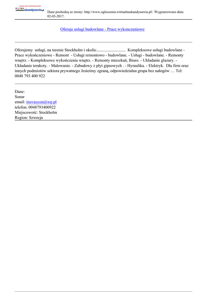 Dane pochodzą ze strony: http://www.ogloszenia.wirtualnaskandynawia.pl/. Wygenerowano dnia: 02-03-2017. Oferuje uslugi budowlane - Prace wykonczeniowe Oferujemy usługi, na terenie Stockholm i okolic............................ Kompleksowe usługi budowlane Prace wykończeniowe - Remont - Usługi remontowo - budowlane. - Usługi - budowlane. - Remonty wnętrz. - Kompleksowe wykończenia wnętrz. - Remonty mieszkań, Biuro. - Układanie glazury. Układanie terakoty. - Malowanie. - Zabudowy z płyt gipsowych . - Hyraulika. - Elektryk. Dla firm oraz innych podmiotów sektora prywatnego Jesteśmy zgraną, odpowiedzialna grupa bez nałogów … Tel: 0048 793 400 922 Dane: Sonar email: [email protected] telefon: 0048793400922 Miejscowość: Stockholm Region: Szwecja