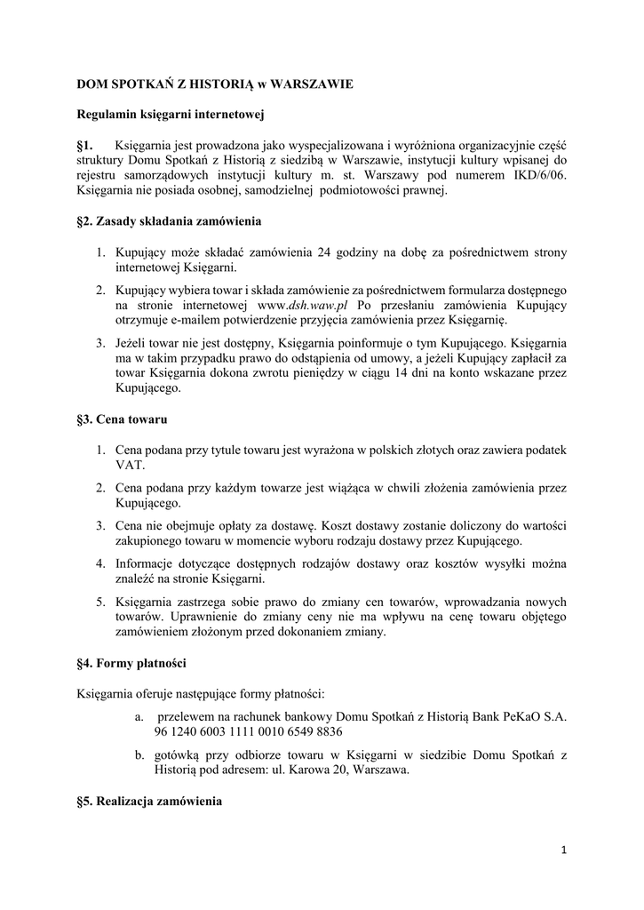 DOM SPOTKAŃ Z HISTORIĄ w WARSZAWIE Regulamin księgarni internetowej §1. Księgarnia jest prowadzona jako wyspecjalizowana i wyróżniona organizacyjnie część struktury Domu Spotkań z Historią z siedzibą w Warszawie, instytucji kultury wpisanej do rejestru samorządowych instytucji kultury m. st. Warszawy pod numerem IKD/6/06. Księgarnia nie posiada osobnej, samodzielnej podmiotowości prawnej. §2. Zasady składania zamówienia 1. Kupujący może składać zamówienia 24 godziny na dobę za pośrednictwem strony internetowej Księgarni. 2. Kupujący wybiera towar i składa zamówienie za pośrednictwem formularza dostępnego na stronie internetowej www.dsh.waw.pl Po przesłaniu zamówienia Kupujący otrzymuje e-mailem potwierdzenie przyjęcia zamówienia przez Księgarnię. 3. Jeżeli towar nie jest dostępny, Księgarnia poinformuje o tym Kupującego. Księgarnia ma w takim przypadku prawo do odstąpienia od umowy, a jeżeli Kupujący zapłacił za towar Księgarnia dokona zwrotu pieniędzy w ciągu 14 dni na konto wskazane przez Kupującego. §3. Cena towaru 1. Cena podana przy tytule towaru jest wyrażona w polskich złotych oraz zawiera podatek VAT. 2. Cena podana przy każdym towarze jest wiążąca w chwili złożenia zamówienia przez Kupującego. 3. Cena nie obejmuje opłaty za dostawę. Koszt dostawy zostanie doliczony do wartości zakupionego towaru w momencie wyboru rodzaju dostawy przez Kupującego. 4. Informacje dotyczące dostępnych rodzajów dostawy oraz kosztów wysyłki można znaleźć na stronie Księgarni. 5. Księgarnia zastrzega sobie prawo do zmiany cen towarów, wprowadzania nowych towarów. Uprawnienie do zmiany ceny nie ma wpływu na cenę towaru objętego zamówieniem złożonym przed dokonaniem zmiany. §4. Formy płatności Księgarnia oferuje następujące formy płatności: a. przelewem na rachunek bankowy Domu Spotkań z Historią Bank PeKaO S.A. 96 1240 6003 1111 0010 6549 8836 b. gotówką przy odbiorze towaru w Księgarni w siedzibie Domu Spotkań z Historią pod adresem: ul. Karowa 20, Warszawa. §5. Realizacja zamówienia 1 1. Warunkiem realizacji zamówienia jest dostępność określonego w zamówieniu towaru i potwierdzenie przyjęcia zamówienia przez Księgarnię wysłane w formie wiadomości e-mailowej. 2. Rozpoczęcie realizacji zamówienia następuje: a. w przypadku płatności przelewem - z chwilą zaksięgowania pieniędzy na rachunku bankowym Księgarni, wskazanym w § 4 pkt a). b. w przypadku płatności gotówką - z chwilą potwierdzenia przyjęcia zamówienia przez Księgarnię. 3. Wysyłka zamówienia następuje w terminie 7 dni. Termin ten obejmuje czas, który upływa od przyjęcia zamówienia do zlecenia przez Księgarnię wysyłki towaru wybraną przez Kupującego formą dostawy, przy czym uwzględniane są tu tylko dni robocze. 4. Zamówienie może zostać zmodyfikowane/ anulowane poprzez wysłanie informacji na adres: [email protected] pod warunkiem, że nie zostało zrealizowane (tj. przekazane do wysyłki). 5. W przypadku wyboru płatności przelewem i nieopłacenia przesyłki w terminie 14 dni od daty złożenia zamówienia, Księgarni przysługuje prawo do odstąpienia od umowy. W takim przypadku zamówienie zostaje anulowane. Księgarnia zastrzega sobie prawo do uzgodnienia z Kupującym innego terminu lub też innego sposobu płatności. 6. W przypadku odbioru osobistego zamówiony towar będzie oczekiwał na odbiór przez okres 14 dni od dnia poinformowania Kupującego o możliwości jego odbioru. Po tym terminie Księgarnia jest uprawniona do odstąpienia od umowy, a wtedy - w przypadku uiszczenia zapłaty za zamówienie - Księgarnia niezwłocznie zwróci Kupującemu należność za towar na rachunek bankowy, z którego dokonał zapłaty. 7. Księgarnia realizuje wysyłkę zamówień za pośrednictwem Poczty lub firmy kurierskiej. 8. Księgarnia nie ponosi odpowiedzialności za niedostarczenie towaru lub opóźnienie w dostawie spowodowane błędnym lub niedokładnym adresem podanym przez Kupującego. 9. Księgarnia wystawia za zakupiony towar fakturę VAT, która jest dołączana do przesyłki z towarem. Dokonując zakupu w Księgarni, Kupujący wyraża zgodę na wystawienie faktury VAT bez podpisu odbiorcy. §6. Prawo odstąpienia od umowy 1. Kupujący ma prawo odstąpienia od umowy w terminie 14 dni od daty odebrania towaru bez podania przyczyny. Zwrot towaru jest możliwy pod warunkiem, że towar jest niezniszczony, nie był używany. 2. Prawo do odstąpienia od umowy nie dotyczy: a. dostarczania nagrań dźwiękowych lub wizualnych albo programów komputerowych - dostarczanych w zapieczętowanym opakowaniu, jeżeli opakowanie zostało otwarte po dostarczeniu, b. dostarczania gazet, periodyków lub czasopism dostępnych w Księgarni, z wyjątkiem prenumeraty takich wydawnictw. 2 3. Uprawnienie od odstąpienia od umowy przysługuje Kupującemu będącemu konsumentem w rozumieniu art. 22(1) Kodeksu cywilnego. 4. Zwracany towar należy przesyłać na adres: Dom Spotkań z Historią, ul. Karowa 20, 00324 Warszawa, dołączając do niego oświadczenie o odstąpieniu od umowy. Formularz oświadczenia dostępny jest na stronie internetowej Księgarni. 5. Księgarnia gwarantuje zwrot ceny towaru oraz kosztów dostawy. Koszty odesłania towaru pokrywa Kupujący. Księgarnia nie przyjmuje przesyłek za pobraniem. 6. Pieniądze zostaną odesłane niezwłocznie, jednak nie później niż w ciągu 14 dni od dnia złożenia przez Kupującego oświadczenia woli o odstąpieniu od umowy. 7. Księgarnia obowiązana jest dokonać zwrotu płatności Kupującemu gotówką lub na wskazany przez niego w formularzu zwrotu numer rachunku bankowego. §7. Reklamacje 1. Księgarnia jest obowiązana do dostarczenia rzeczy wolnych od wad fizycznych. W przypadku niezgodności towaru z umową (posiadającego wady fizyczne), Kupującemu przysługuje prawo do reklamacji towaru w ciągu 2 (dwóch) lat od daty wydania rzeczy bezpośrednio Ku