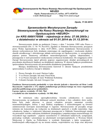 Stowarzyszenie Na Rzecz Rozwoju Neurochirurgii Na Opolszczyźnie NEURO Opole, Pomarańczowa 27, tel/fax. (077) 4520724 e-mail: [email protected] http:/www.neuro.org.pl Opole, 17.02.2015 Sprawozdanie Merytoryczne Zarządu Stowarzyszenia Na Rzecz Rozwoju Neurochirurgii na Opolszczyźnie >NEURO< (nr KRS 0000170598 - rejestracja w dniu: 27.08.2003r.) z działalności w okresie od 01.01.2014 do 31.12.2014r. Stowarzyszenie działa na podstawie Ustawy z dnia 7 kwietnia 1989 roku Prawo o stowarzyszeniach (Dz. U. Nr 79, Poz.855). Zgodnie ze Statutem Stowarzyszenia, przyjętym przez Walne Zgromadzenie w dniu 16.07.2003r., celem działalności Stowarzyszenia w okresie rozliczeniowym były działania zmierzające do zapobiegania i zwalczania skutków chorób ośrodkowego i obwodowego układu nerwowego na Opolszczyźnie, w szczególności poprzez pomoc finansową ośrodkom neurochirurgicznym regionu (doposażanie) i pracującemu w nich personelowi medycznemu (zwłaszcza kształcenie). Do osiągnięcia celów Zarząd Stowarzyszenia dążył głównie poprzez organizowanie działań prowadzących do pozyskania określonych funduszy na działalność statutową. W okresie będącym przedmiotem sprawozdania Stowarzyszenie nie prowadziło działalności gospodarczej. Bieżącą działalnością Stowarzyszenia kierował w okresie będącym przedmiotem sprawozdania 4 osobowy Zarząd w składzie: 1. 2. 3. 4. Prezes Zarządu: dr n.med. Dariusz Łątka V-ce Prezes Zarządu: lek.med. Paweł Kita V-ce Prezes Zarządu: dr med. Waldemar Kołodziej Członek Zarządu: lek.med. Grzegorz Gac Fundusze Stowarzyszenia pochodziły w tym okresie jedynie z darowizn od firm i osób fizycznych i wpływów z 1% odpisu podatkowego przekazywanego na rzecz organizacji pożytku publicznego przez podatników. Łączne wpływy wyniosły: 19 342, 70zł a wydatki na cele statutowe wyniosły: 16 588, 00zł. W minionym roku uporządkowaliśmy kwestie członkostwa w naszym Stowarzyszeniu, na podstawie deklaracji ustnych skreślono z listy członków dwie osoby, które były mało aktywne, w poczet członków przyjęto natomiast czwórkę neuroanestezjologów, którzy z racji bliskiej współpracy z neurochirurgami są również zainteresowani rozwojem neurochirurgii w regionie. Stowarzyszenie od początku swego istnienia nie koncentruje się wyłącznie na działaniach opartych o środki materialne. Jego członkowie, będący w większości lekarzami pracującymi w Oddziale Neurochirurgii starają się prowadzić szeroko zakrojoną działalność propagującą i popularyzującą neurochirurgię we wszystkich tego aspektach – poprzez uczestnictwo w zebraniach naukowych, sympozjach, prowadząc wykłady i prezentacje na szkoleniach wewnątrzszpitalnych, w Wyższej Szkole Medycznej w Opolu, na Politechnice w wydziale fizjoterapii, a także sympozjach i konferencjach odbywających się na terenie miasta, województwa czy kraju oraz aktywnie udzielając się w mediach i internecie. Nasze profile w mediach społecznościowych cieszą się dużą, stale rosnącą popularnością, podobnie jak powstała z naszej inicjatywy uniwersalna platformy internetowa dla lekarzy i pacjentów, poświęcona leczeniu chorób kręgosłupa: drkregoslup.pl. Członkowie Stowarzyszenia starają się także współpracować z innymi podobnymi podmiotami. Wyrazem tego jest choćby zaangażowanie w projekt SpineForum – Polska Szkoła Chirurgii Kręgosłupa (Prezes Stowarzyszenia Neuro został wiceprezesem SpineForum) i poparcie dla nowej, prywatnej inicjatywy edukacyjnej: Vital Medic Education – Prezes Stowarzyszenia został Prezesem Zarządu VME. Prezes Stowarzyszenia został także wybrany na kolejną kadencję do Zarządu Polskiego Oddziału AOSpine, zajmując pozycję szefa Szkolenia Neuro. Z naszej inicjatywy powstał w Polsce także oddział Walter E. Dandy Neurosurgical Society, a jego szefem został Prezes naszego Stowarzyszenia. Wypadkową tych działań jest popularyzacja neurochirurgii w społeczeństwie, nagłaśnianie jej sukcesów, ale i problemów, a przez to prowadzenie do poprawy jakości i dostępności do leczenia neurochirurgicznego na Opolszczyźnie. Leczenie neurochirurgiczne w roku 2014 było ciągle realizowane w województwie opolskim tylko poprzez jeden oddział neurochirurgiczny działający w ramach Wojewódzkiego Centrum Medycznego w Opolu oraz przez przyszpitalną Wojewódzką Poradnię konsultacyjną, ale wszystko wskazuje na to, że już w 2015 Opolszczyzna przestanie byćjedynym województwem w Polsce z jedną neurochirurgią, bo budowa nowego szpitala o profilu neurochirurgicznym (inwestor prywatny Vital Medic) w Kluczborku dobiegła końca. Członkowie Stowarzyszenia aktywnie uczestniczyli doradczo w doborze wyposażenia w ten sposób, by było możliwe komplementarne wyprofilowanie nowego Szpitala. W wyniku ostrego konfliktu z Dyrekcją WCM, który miał miejsce w 2013r. ostatecznie uznano prawo neurochirurgów do równoczesnej pracy dla konkurencyjnych podmiotów i tym samym stworzono pole do powstania drugiego ośrodka neurochirurgicznego. Neurochirurgia opolska obsługuje jednomilionową populację mieszkańców województwa, dzięki zatrudnionym w nim 7 specjalistom z zakresu neurochirurgii (wszyscy są w chwili obecnej specjalistami II st. i równocześnie członkami Stowarzyszenia). Oddział dysponuje 4 miejscami specjalizacyjnymi, z których trzy jest wykorzystane przez lekarzy rezydentów pracujących w Oddziale, jeden zwolnił się z początkiem 2015 i mamy ogromną nadzieję, że zostanie wykorzystany przez kolejnego Opolanina. To pozwoliłoby zasypać częściowo wyrwę pokoleniową, która powstała wskutek braku zainteresowania miejscowych lekarzy neurochirurgią. Wszyscy lekarze, poza Ordynatorem Oddziału, są zatrudnieni w oparciu o umowy cywilnoprawne zawierane jako wynik konkursu ofert na okresy jednoroczne. System konsultancki z etatowym Ordynatorem, jako organizatorem pracy wypracowany w Oddziale, gorąco p