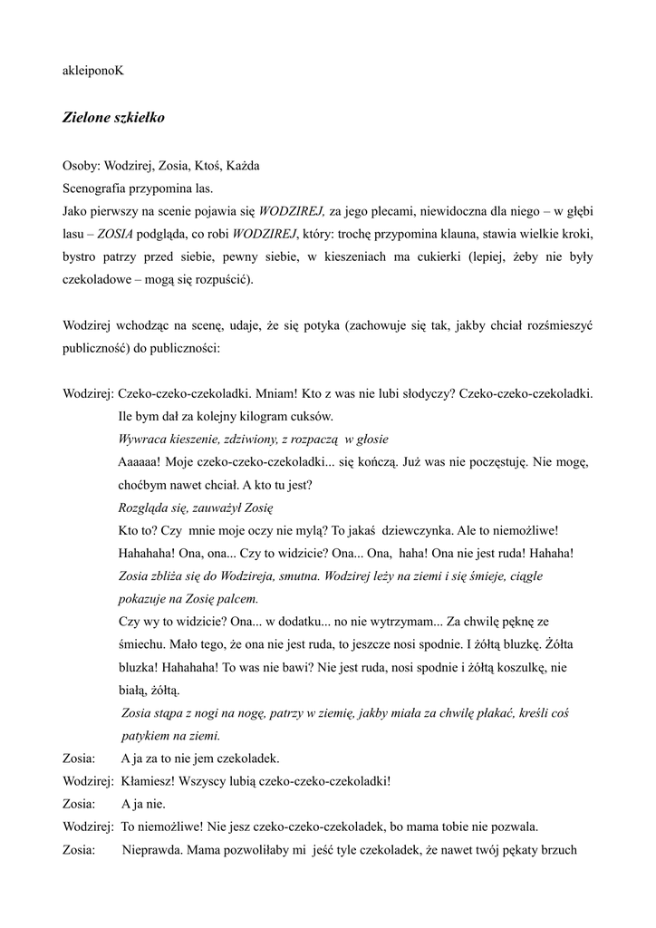 akleiponoK Zielone szkiełko Osoby: Wodzirej, Zosia, Ktoś, Każda Scenografia przypomina las. Jako pierwszy na scenie pojawia się WODZIREJ, za jego plecami, niewidoczna dla niego – w głębi lasu – ZOSIA podgląda, co robi WODZIREJ, który: trochę przypomina klauna, stawia wielkie kroki, bystro patrzy przed siebie, pewny siebie, w kieszeniach ma cukierki (lepiej, żeby nie były czekoladowe – mogą się rozpuścić). Wodzirej wchodząc na scenę, udaje, że się potyka (zachowuje się tak, jakby chciał rozśmieszyć publiczność) do publiczności: Wodzirej: Czeko-czeko-czekoladki. Mniam! Kto z was nie lubi słodyczy? Czeko-czeko-czekoladki. Ile bym dał za kolejny kilogram cuksów. Wywraca kieszenie, zdziwiony, z rozpaczą w głosie Aaaaaa! Moje czeko-czeko-czekoladki... się kończą. Już was nie poczęstuję. Nie mogę, choćbym nawet chciał. A kto tu jest? Rozgląda się, zauważył Zosię Kto to? Czy mnie moje oczy nie mylą? To jakaś dziewczynka. Ale to niemożliwe! Hahahaha! Ona, ona... Czy to widzicie? Ona... Ona, haha! Ona nie jest ruda! Hahaha! Zosia zbliża się do Wodzireja, smutna. Wodzirej leży na ziemi i się śmieje, ciągle pokazuje na Zosię palcem. Czy wy to widzicie? Ona... w dodatku... no nie wytrzymam... Za chwilę pęknę ze śmiechu. Mało tego, że ona nie jest ruda, to jeszcze nosi spodnie. I żółtą bluzkę. Żółta bluzka! Hahahaha! To was nie bawi? Nie jest ruda, nosi spodnie i żółtą koszulkę, nie białą, żółtą. Zosia stąpa z nogi na nogę, patrzy w ziemię, jakby miała za chwilę płakać, kreśli coś patykiem na ziemi. Zosia: A ja za to nie jem czekoladek. Wodzirej: Kłamiesz! Wszyscy lubią czeko-czeko-czekoladki! Zosia: A ja nie. Wodzirej: To niemożliwe! Nie jesz czeko-czeko-czekoladek, bo mama tobie nie pozwala. Zosia: Nieprawda. Mama pozwoliłaby mi jeść tyle czekoladek, że nawet twój pękaty brzuch by ich nie pomieścił. Wodzirej: To twój tym bardziej by ich nie pomieścił. O! To pewnie dentysta ci zabronił. Zosia: Nie, ja po prostu nie mogę jeść czekoladek. Ale nie dlatego, że mi nie pozwalają. Wodzirej: Wiedziałem. Zosia: Ale nie wiesz, dlaczego nie mogę ich jeść. Wodzirej: No, powiedz. Powiedz. Zobacz, z ciekawości urósł mi już nos. Przykłada do nosa patyk, którym rysowała po ziemi Zosia. Zosia: Nos rośnie z kłamstwa! Powiem pod jednym warunkiem. Najpierw ty mi powiedz, dlaczego się śmiejesz, że nie jestem ruda, że noszę spodnie i żółtą, nie białą koszulkę. Co w tym zabawnego? Wodzirej: Hahaha! To nie wiesz? Ty nie udawaj takiej. No weź. Hahaha! Jak możesz nie wiedzieć? Ty lepiej powiedz, gdzie zaparkował twój statek kosmiczny. Zosia: Statek kosmiczny? Nie przyleciałam statkiem kosmicznym. Wodzirej: A tak się zachowujesz, jakbyś była nie z tej planety. Zosia: Bo ja tutaj się nie urodziłam. Wodzirej: To pewne, bo gdybyś się tutaj urodziła. jakby deklamował, wymienia To: miałabyś rude włosy. Bo tutaj wszyscy mają rude włosy. Zosia: Ale ty nie masz. Wodzirej: Wszyscy ci, którzy są dziewczynkami. A ja jestem chłopcem. I gdybyś była stąd, to: miałabyś rude włosy, nosiłabyś czarną spódniczkę, nie spodnie. Zosia: I ty masz spodnie. Wodzirej: Bo jestem chłopcem. Ty weź mi nie przeszkadzaj, bo nie pamiętam, o czym mówiłem. Do publiczności. O czym mówiłem? A! Spodnie... I gdybyś była stąd, to: miałabyś rude włosy, nosiłabyś czarną spódniczkę, nie spodnie i białą, nie żółtą koszulkę. A, że wyglądasz jak wyglądasz... krótka pauza ...to nie możesz być stąd. Zosia: Bo ja czegoś szukam... i trafiłam aż tutaj... Wodzirej: Ty nie zmieniaj tematu, tylko mów, dlaczego nie możesz jeść czeko-czeko-czekoladek. Zosia: Bo mam cukrzycę! I nie zawsze, kiedy tylko chcę, wolno mi jeść te przedrzeźniając czeko-czeko-czekoladki. Wodzirej: Nie może być! Tutaj nikt nie choruje na cukrzycę. Nawet nie słyszałem o takiej chorobie. Cukrzyca... Hm... Próchnica, to wiem, co to jest, ale cukrzyca... Zosia: To już dużo wiesz. Z cukrzycą, jest prawie jak przy próchnicy. Też trzeba ograniczać cukierki. I tyle. Wodzirej: I tyle? Tyle? No nie... Ciii! Słyszysz? Słyszycie? Zbliża się KTOŚ, Chyba jakaś osoba tu idzie. Ej, dziewczynko chowamy się... Zosia: Mam na imię Zosia. Wodzirej: Dobrze. Zosiu chowaj się, Wodzirej już w krzakach bo kiedy ktoś ciebie zobaczy. Taką nie rudą... Uciekaj. Za późno.. Zosia: Ale ja go znam. Cześć Ktosiu! Ktoś: Zosiu, nie znalazłem go nigdzie. Zosia: Dziękuję za pomoc. Idziemy szukać dalej. Wodzirej: Hola, hola. Stójcie. Ktosiu, dlaczego nie powiedziałeś Zosi, że jest... no wiesz..., że jest – jak na dziewczynkę - nie ten tego? Ktoś: A dla mnie Zosia jest tak samo miła jak i inne dziewczynki z naszego lasu. Wodzirej do Zosi Wodzirej: Zosiu, Ktoś powinien ciebie ostrzec. A nie zrobił tego. Jeśli jakaś osoba ciebie spotka, taką nie rudą... Aż strach pomyśleć! Ktoś: Wodzireju, przeszkadzasz nam w poszukiwaniach. Wodzirej: Nie możecie iść dalej. Zosia: Możemy. Ktoś: Możemy. Wodzirej: Ale to niebezpieczne. Dobrze. Niech tak będzie. Dobrze. Skoro mnie prosicie. Przestańcie mnie błagać. Dobrze. Jestem gotów na takie poświęcenie. Idę z wami. Tylko taki heros jak ja może was uchronić przed niebezpieczeństwem. Dobrze. Idziemy. Zosia: Dziękuję Wodzireju. Kolejna para oczu na pewno się przyda. Wodzirej: Para oczu? Zosia: No, dwoje oczu. A ile ich masz? Dwa to para. Dwoje oczu, to para oczu. Twoje oczy pomogą nam w poszukiwaniach. Wodzirej: Dobrze, to szukajmy. W czasie, kiedy Zosia mówi kwestię niżej, Wodzirej, znów poruszając się jak klaun, rozgląda się dokoła, kręci się coraz szybciej. Nie słucha Zosi, bardzo zajęty poszukiwaniami. W tym czasie Ktoś spokojnie się rozgląda, wzrusza co jakiś czas ramionami na znak niepowodzenia poszukiwań. Zosia: Nieznany świat oglądałam w zielonym szkiełku/ W groźne noce ukryte w babcinym pudełku/ C