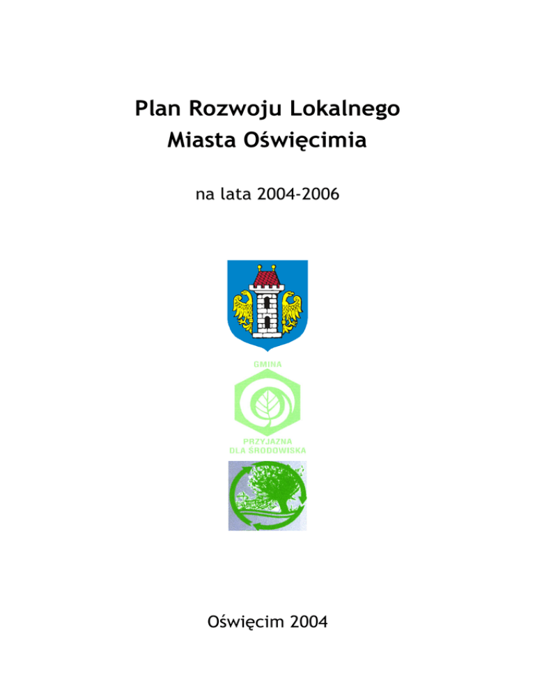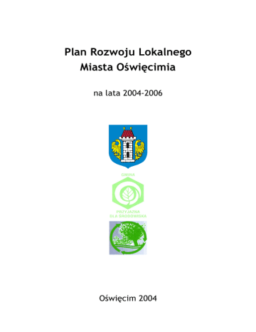 Plan Rozwoju Lokalnego Miasta Oświęcimia na lata 2004-2006 Oświęcim 2004 SPIS TREŚCI IOBSZAR I CZAS REALIZACJI PLANU ROZWOJU LOKALNEGO MIASTA OŚWIĘCIM. 4 IIAKTUALNA SYTUACJA SPOŁECZNO – GOSPODARCZA MIASTA OŚWIĘCIM............. 5 1POŁOŻENIE, POWIERZCHNIA, LUDNOŚĆ.......................................................................................................... 5 1.1Położenie miasta w układzie geograficznym i administracyjnym............................................... 5 1.2Demografia.................................................................................................................................. 5 2ŚRODOWISKO PRZYRODNICZE...................................................................................................................... 6 2.1Położenie geograficzne................................................................................................................ 6 2.2Budowa geologiczna.................................................................................................................... 6 2.3Warunki klimatyczne.................................................................................................................... 7 2.4Pokrywa glebowa ........................................................................................................................7 3TURYSTYKA, SPORT, KULTURA....................................................................................................................8 3.1Zaplecze hotelowo-gastronomiczne.............................................................................................8 3.2Kluby sportowe i stowarzyszenia kultury fizycznej..................................................................... 8 3.3Obiekty sportowe....................................................................................................................... 10 3.4Kultura....................................................................................................................................... 10 3.5Informacja o funkcjonowaniu instytucji kultury i stowarzyszeń kultury................................... 11 4ZAGOSPODAROWANIE PRZESTRZENNE......................................................................................................... 12 4.1Ochrona środowiska.................................................................................................................. 12 4.2Infrastruktura techniczna...........................................................................................................13 4.3Strefa przestrzenna.................................................................................................................... 17 5GOSPODARKA........................................................................................................................................ 18 5.1Główne podmioty gospodarcze miasta...................................................................................... 21 5.2Usługi bankowe..........................................................................................................................21 6ROLNICTWO I LEŚNICTWO.........................................................................................................................22 7SFERA SPOŁECZNA.................................................................................................................................. 22 7.1Sytuacja demograficzna i społeczna terenu...............................................................................22 7.2Oświata ..................................................................................................................................... 24 7.3Służba zdrowia........................................................................................................................... 24 7.4Pomoc społeczna........................................................................................................................26 7.5Lokalne media............................................................................................................................ 26 7.6Zabytki........................................................................................................................................26 7.7Kontakty międzynarodowe miasta............................................................................................. 26 IIIZADANIA POLEGAJĄCE NA POPRAWIE SYTUACJI SPOŁECZNO-GOSPODARCZEJ MIASTA OŚWIĘCIM..........................................................................................................................27 1WIZJA MIASTA OŚWIĘCIM........................................................................................................................27 2CELE STRATEGICZNE MIASTA OŚWIĘCIM..................................................................................................... 27 3LISTA ZADAŃ DO REALIZACJI.................................................................................................................... 29 IVREALIZACJA ZADAŃ I PROJEKTÓW..................................................................................... 35 1LISTA ZADAŃ OBJĘTYCH INTERWENCJĄ PLANU..............................................................................................35 2ZADANIA POLEGAJĄCE NA POPRAWIE SYTUACJI NA OBSZARZE OBJĘTYM INTERWENCJĄ PLANU ROZWOJU LOKALNEGO..36 3SZCZEGÓŁOWA CHARAKTERYSTYKA ZADAŃ REALIZOWANYCH W RAMACH PLANU ROZWOJU LOKALNEGO.................. 37 VPOWIĄZANIE PROJEKTÓW Z INNYMI DZIAŁANIAMI REALIZOWANYMI NA TERENIE MIASTA, POWIATU, WOJEWÓDZTWA, KRAJU.................................................... 43 VIOCZEKIWANE WSKAŹNIKI OSIĄGNIĘĆ PLANU ROZWOJU LOKALNEGO...............44 VII PLAN FINANSOWY NA LATA 2004-2006............................................................................... 48 VIIISYSTEM WDRAŻANIA PLANU......................................................................