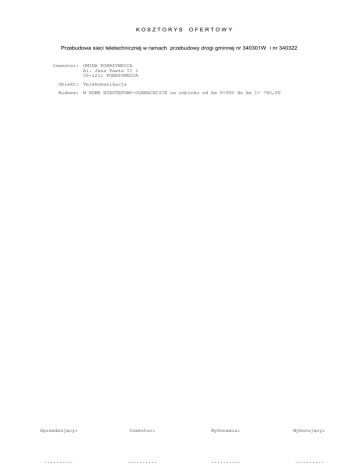 KOSZTORYS OFERTOWY Przebudowa sieci teletechnicznej w ramach przebudowy drogi gminnej nr 340301W i nr 340322 Inwestor: GMINA POKRZYWNICA Al. Jana Pawła II 1 06-121; POKRZYWNICA Obiekt: Telekomunikacja Budowa: W NOWE NIESTĘPOWO-OLBRACHCICE na odcinku od km 0+000 do km 1+ 760,00 Sprawdzający: Inwestor: Wykonawca: Wykonujący: .......... .......... .......... .......... Przedmiar Robót Opis pozycji, wyliczenie ilości robót Ilość Krot Jedn. 1 Przebudowa sieci teletechnicznej 1.001 Budowa studni kablowych prefabrykowanych rozdzielczych SK, typ SK-1, grunt kategorii III - analogia 4 0,50 szt 1.002 Montaż złączy przelotowych kabli wypełnionych ułożonych w kanalizacji kablowej lub w ziemi z zastosowaniem pojedynczych łączników żył i termokurczliwych osłon mechanicznych, kabel od 2 do 9 par - analogia 6 złącze 1.003 Budowa rurociągu kablowego na głębokości 1·m w wykopie wykonanym ręcznie, grunt kategorii III, HDPE Fi·40·mm w zwojach, 1 rura w rurociągu 0,510 1.004 Układanie kabla wypełnionego w rowie kablowym wykopanym i zasypanym mechanicznie, grunt kategorii III, kabel o średnicy do 30 mm, układanie 1 kabla 600 m 1.005 Układanie kabla wypełnionego w rowie kablowym wykopanym i zasypanym mechanicznie, grunt kategorii III, kabel o średnicy do 30 mm, układanie każdego następnego kabla 423 m 1.006 Wykonanie przepustów pod drogami i innymi przeszkodami wykopem otwartym grunt kategorii III, przepust rurą HDPE 110mm- analogia R= 0,955 M= 1,000 S= 1,000 36 m 1.007 Wykonanie przepustów pod drogami i innymi przeszkodami wykopem otwartym grunt kategorii III, przepust rurą dwudzielną AROT 160APS R= 0,955 M= 1,000 S= 1,000 26 m 1.008 Montaż złączy równoległych kabli wypełnionych ułożonych w kanalizacji kablowej z zastosowaniem modułowych łączników żył i termokurczliwych osłon wzmocnionych, kabel o 30 parach 5 złącze 1.009 Wyłączenie kabla równoległego ze złącza kabla wypełnionego ułożonego w kanalizacji kablowej z zastosowaniem termokurczliwych osłon wzmocnionych, kabel o 20 parach 5 złącze 1.010 Pomiary końcowe prądem stałym, kabel o liczbie par·30 3 odcinek km Kosztorys skrócony Opis pozycji podstawy nakładów Ilość Krot Jedn. 1 Przebudowa sieci teletechnicznej 1.001 TPSA 40/301/2 Budowa studni kablowych prefabrykowanych rozdzielczych SK, typ SK-1, grunt kategorii III analogia 4 0,50 szt 1.002 TPSA 40/701/1 Montaż złączy przelotowych kabli wypełnionych ułożonych w kanalizacji kablowej lub w ziemi z zastosowaniem pojedynczych łączników żył i termokurczliwych osłon mechanicznych, kabel od 2 do 9 par - analogia 6 1.003 TPSA 39/301/11 Budowa rurociągu kablowego na głębokości 1·m w wykopie wykonanym ręcznie, grunt kategorii III, HDPE Fi·40·mm w zwojach, 1 rura w rurociągu 0,510 złącze km 1.004 TPSA 40/502/7 Układanie kabla wypełnionego w rowie kablowym wykopanym i zasypanym mechanicznie, grunt kategorii III, kabel o średnicy do 30 mm, układanie 1 kabla 600 m 1.005 TPSA 40/502/8 Układanie kabla wypełnionego w rowie kablowym wykopanym i zasypanym mechanicznie, grunt kategorii III, kabel o średnicy do 30 mm, układanie każdego następnego kabla 423 m 1.006 KNR 502/201/5 Wykonanie przepustów pod drogami i innymi przeszkodami wykopem otwartym grunt kategorii III, przepust rurą HDPE 110mm- analogia 36 m 1.007 KNR 502/201/5 Wykonanie przepustów pod drogami i innymi przeszkodami wykopem otwartym grunt kategorii III, przepust rurą dwudzielną AROT 160APS 26 m 1.008 TPSA 40/718/3 Montaż złączy równoległych kabli wypełnionych ułożonych w kanalizacji kablowej z zastosowaniem modułowych łączników żył i termokurczliwych osłon wzmocnionych, kabel o 30 parach 5 złącze 1.009 TPSA 40/723/2 Wyłączenie kabla równoległego ze złącza kabla wypełnionego ułożonego w kanalizacji kablowej z zastosowaniem termokurczliwych osłon wzmocnionych, kabel o 20 parach 5 złącze Wartość Opis pozycji podstawy nakładów Ilość 1.010 KNR 501/1310/3 Pomiary końcowe prądem stałym, kabel o liczbie par·30 Krot 3 Jedn. Wartość odcinek Zestawienie robocizny Nazwa zawodu Jedn. Ilość Monter telekomunikacyjnych linii kablowych II r-g 82,894 Monter telekomunikacyjnych linii kablowych III r-g 18,45 Monter telekomunikacyjnych linii kablowych IV r-g 27,78 Monterzy r-g 1 104,4 Razem (z dokładnością do zaokrągleń): Cena Wartość Cena Wartość 1 233,6 Zestawienie materiałów Nazwa materiału Jedn. Ilość Beton zwykły z kruszywa naturalnego m3 0,1 Cement portlandzki zwykły "25" bez dodatków t 0,014 Farba olejna nawierzchniowa ogólnego stosowania kg 0,02 Gaz propanowo-butanowy płynny kg 4,77 Kabel XzTKMXpw 2x2x0,5 m 524 Kabel XzTKMXpw 15x4x0,5 m 514 Kołki stalowe do wstrzeliwania z nabojami i osłoną szt Lakier asfaltowy ogólnego stosowania czarny kg 1,76 Łączniki pojedyncze jednożyłowe szt 126 Łączniki żył modułowe odgałęźne szt 15 Osłona kablowa KM1 szt 4,61538 Osłona kablowa KM2 szt 1,38462 Osłona rurowa A 120 PS Arot, dzielona m Osłona termokurczliwa złączy kablowych wzmocniona kpl Piasek m3 Rura HDPE Fi·40/3,7 m 510 Rura HDPE Fi·110/6,3·mm m 36 Studnia kablowa żelbetowa SK1, przelotowa szt Taśma ostrzegawcza z folii PE do znakowania tras kablowych m Woda przemysłowa m3 Wspornik 2-kablowy szt 8 26 5 0,028 4 1 164,4 0,008 22 Razem (z dokładnością do zaokrągleń): Zestawienie sprzętu Nazwa sprzętu Jedn. Ilość Koparka łańcuchowa do rowów kablowych 37kW/50KM (1) z lemieszem spycharkowym m-g 35,52 Megaomomierz m-g 8,88 Mostek kablowy m-g 4,14 Przyczepa do przewożenia kabli m-g 28,644 Samochód dostawczy do 0.9·t (1) m-g 39,425 Samochód samowyładowczy do 5·t (1) m-g 8,84 Samochód skrzyniowy do 3.5·t (1) m-g 22,915 Samochód skrzyniowy do 5·t (1) m-g 24,84 Samochód skrzyniowy trambus 3.5-4·t m-g 21,7 Cena Wartość Nazwa sprzętu Jedn. Ilość Ubijak spalinowy 50·kg m-g 29,852 Żuraw samochodowy do 4·t (1) m-g 4,12 Razem (z dokładnością do zaokrągle