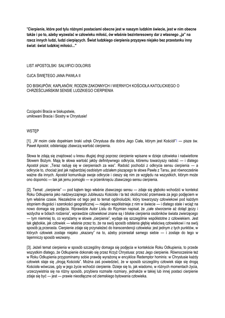 "Cierpienie, które pod tylu różnymi postaciami obecne jest w naszym ludzkim świecie, jest w nim obecne także i po to, ażeby wyzwalać w człowieku miłość, ów właśnie bezinteresowny dar z własnego „ja” na rzecz innych ludzi, ludzi cierpiących. Świat ludzkiego cierpienia przyzywa niejako bez przestanku inny świat: świat ludzkiej miłości..." LIST APOSTOLSKI SALVIFICI DOLORIS OJCA ŚWIĘTEGO JANA PAWŁA II DO BISKUPÓW, KAPŁANÓW, RODZIN ZAKONNYCH I WIERNYCH KOŚCIOŁA KATOLICKIEGO O CHRZEŚCIJAŃSKIM SENSIE LUDZKIEGO CIERPIENIA Czcigodni Bracia w biskupstwie, umiłowani Bracia i Siostry w Chrystusie! WSTĘP [1]. „W moim ciele dopełniam braki udręk Chrystusa dla dobra Jego Ciała, którym jest Kościół” 1 — pisze św. Paweł Apostoł, odsłaniając zbawczą wartość cierpienia. Słowa te zdają się znajdować u kresu długiej drogi poprzez cierpienie wpisane w dzieje człowieka i naświetlone Słowem Bożym. Mają te słowa wartość jakby definitywnego odkrycia, któremu towarzyszy radość — i dlatego Apostoł pisze: „Teraz raduję się w cierpieniach za was”. Radość pochodzi z odkrycia sensu cierpienia — a odkrycie to, chociaż jest jak najbardziej osobistym udziałem piszącego te słowa Pawła z Tarsu, jest równocześnie ważne dla innych. Apostoł komunikuje swoje odkrycie i cieszy się nim ze względu na wszystkich, którym może ono dopomóc — tak jak jemu pomogło — w przeniknięciu zbawczego sensu cierpienia. [2]. Temat: „cierpienie” — pod kątem tego właśnie zbawczego sensu — zdaje się głęboko wchodzić w kontekst Roku Odkupienia jako nadzwyczajnego Jubileuszu Kościoła i ta też okoliczność przemawia za jego podjęciem w tym właśnie czasie. Niezależnie od tego jest to temat ogólnoludzki, który towarzyszy człowiekowi pod każdym stopniem długości i szerokości geograficznej — niejako współistnieje z nim w świecie — i dlatego stale i wciąż na nowo domaga się podjęcia. Wprawdzie Autor Listu do Rzymian napisał, że „całe stworzenie aż dotąd jęczy i wzdycha w bólach rodzenia”, wprawdzie człowiekowi znane są i bliskie cierpienia osobników świata zwierzęcego — tym niemniej to, co wyrażamy w słowie „cierpienie”, wydaje się szczególnie współistotne z człowiekiem. Jest tak głębokie, jak człowiek — właśnie przez to, że na swój sposób odsłania głębię właściwą człowiekowi i na swój sposób ją przerasta. Cierpienie zdaje się przynależeć do transcendencji człowieka: jest jednym z tych punktów, w których człowiek zostaje niejako „skazany” na to, ażeby przerastał samego siebie — i zostaje do tego w tajemniczy sposób wezwany. [3]. Jeżeli temat cierpienia w sposób szczególny domaga się podjęcia w kontekście Roku Odkupienia, to przede wszystkim dlatego, że Odkupienie dokonało się przez Krzyż Chrystusa: przez Jego cierpienie. Równocześnie też w Roku Odkupienia przypominamy sobie prawdę wyrażoną w encyklice Redemptor hominis: w Chrystusie każdy człowiek staje się „drogą Kościoła”. Można zaś powiedzieć, że w sposób szczególny człowiek staje się drogą Kościoła wówczas, gdy w jego życie wchodzi cierpienie. Dzieje się to, jak wiadomo, w różnych momentach życia, urzeczywistnia się na różny sposób, przybiera rozmaite rozmiary, jednakże w takiej lub innej postaci cierpienie zdaje się być — jest — prawie nieodłączne od ziemskiego bytowania człowieka. Skoro więc człowiek idzie poprzez swoje ziemskie życie w taki lub inny sposób drogą cierpienia, zatem Kościół w każdym czasie, a szczególnie chyba w Roku Odkupienia — winien się spotykać z człowiekiem na tej właśnie drodze. Kościół, który wyrasta z tajemnicy Odkupienia w Krzyżu Chrystusa, winien w szczególny sposób szukać spotkania z człowiekiem na drodze jego cierpienia. W spotkaniu takim człowiek staje się „drogą Kościoła” — a jest to jedna z najważniejszych dróg. [4]. Stąd też rodzi się niniejsza wypowiedź, właśnie w Roku Odkupienia: wypowiedź o cierpieniu. Cierpienie ludzkie budzi współczucie, budzi także szacunek — i na swój sposób onieśmiela. Zawiera się w nim bowiem wielkość swoistej tajemnicy. Ten więc szczególny szacunek dla każdego ludzkiego cierpienia wypada założyć u początku wszystkiego, co w dalszym ciągu zostanie tu powiedziane z najgłębszej potrzeby serca — a zarazem też z głębokiego imperatywu wiary. Wokół tematu cierpienia te dwa motywy wydają się szczególnie zbliżać do siebie i z sobą łączyć: potrzeba serca każe nam przezwyciężać onieśmielenie, a imperatyw wiary — sformułowany choćby w przytoczonych na początku słowach św. Pawła — dostarcza treści, w imię której i mocą której ośmielamy się dotknąć tego, co w każdym człowieku wydaje się tak bardzo nietykalne: człowiek w swoim cierpieniu pozostaje nietykalną tajemnicą. ŚWIAT LUDZKIEGO CIERPIENIA [5]. Chociaż w swoim podmiotowym wymiarze, jako fakt osobowy, zamknięty w konkretnym i niepowtarzalnym wnętrzu człowieka, cierpienie wydaje się jakby niewyrażalne oraz nieprzekazywalne — to równocześnie, może nic tak jak ono nie domaga się, w swej właśnie „przedmiotowej rzeczywistości”, podjęcia, refleksji, ujęcia w kształt wyrazistego problemu, postawienia radykalnych pytań i szukania odpowiedzi. Jak widać, nie chodzi tu tylko o opis cierpienia. Są inne kryteria, wykraczające poza sferę opisu, które musimy wprowadzić, kiedy decydujemy się wniknąć w świat ludzkiego cierpienia. Być może, iż medycyna jako nauka i zarazem sztuka leczenia odsłania na wielkim obszarze cierpień człowieka rejon najbardziej znany, najdokładniej nazwany i stosunkowo najbardziej zrównoważony metodami przeciwdziałania (czyli terapii). Ale przecież jest to tylko jeden rejon. Pełny obszar ludzkiego cierpienia jest o wiele rozleglejszy, bardziej zróżnicowany i wielowymiarowy