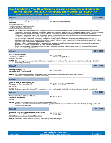 Biuro Pośrednictwa Pracy OIL w Warszawie zaprasza pracodawców do składania ofert pracy dla lekarzy - PUBLIKACJA NA STRONIE INTERNETOWEJ JEST BEZPŁATNA tel. 22 5428 330; fax 22 5428 341 www.oilwaw.org.pl/oferty-pracy/ e-mail: [email protected] 27-07-2015 .LEKARZ Medi Partner Sp. z o. o. (Grupa Medicover) Warszawa * tel. [email protected] stanowisko kierownika: - Centrum Medyczne w Piasecznie, lub - Centrum Medyczne w Pruszkowie UWAGI: Do zadań osoby zatrudnionej na tym stanowisku należeć będzie: nadzór nad jakością i bezpieczeństwem świadczonych usług medycznych; wdrażanie, realizacja i monitoring standardów i procedur medycznych; monitorowanie wykorzystania i zapotrzebowania na poszczególne rodzaje konsultacji; kontrola formalna i merytoryczna dokumentacji medycznej; rozpatrywanie reklamacji medycznych pacjentów; nadzór nad gospodarką lekową, sprzętem medycznym i diagnostycznym; zabezpieczenie i optymalizacja zasobów ludzkich koniecznych do prawidłowej realizacji usług medycznych. Od kandydatów oczekujemy: minimum 5 lat pracy na samodzielnym stanowisku; doświadczenia w kierowaniu zespołem lub placówką medyczną; silnego nastawienia na jakość obsługi Pacjenta; wysoko rozwiniętych umiejętności interpersonalnych; dobrej organizacji pracy oraz łatwości podejmowania decyzji. Oferujemy: duże wyzwania zawodowe i samodzielność w działaniu; możliwość doskonalenia swoich umiejętności i poszerzania kompetencji; pracę w stabilnej firmie, w miłej i przyjaznej atmosferze. Osoby zainteresowane proponowanym stanowiskiem prosimy o przesłanie listu motywacyjnego i CV bezpośrednio na adres mailowy: [email protected] 23-07-2015 .LEKARZ SZPZLO Praga Południe Warszawa, ul. Krypska 39 tel. 22 810 06 04 606 821 176 dyr. SZPZLO Hospicjum Domowe UWAGI: Etat - okres próbny, czas określony. Warunki wynagrodzenia do ustalenia. Oferta dla lekarza w trakcie specjalizacji w dziedzinie medycyny paliatywnej. 22-07-2015 .LEKARZ Uzdrowisko Iwonicz SA Iwonicz Zdrój, al. Torosiewicza 2 * tel. 13 430 85 65 UWAGI: Uzdrowisko zatrudni lekarza, który ukończył kurs balneologiczny lub jest zainteresowany takim kursem. Zatrudnienie w ramach etatu, na czas nieokreślony. 22-07-2015 .LEKARZ Szpital im. prof. W. Orłowskiego CMKP Warszawa, ul. Czerniakowska 231 tel. 22 584 12 50 dyr. ds. lecznictwa 22 584 11 58 kadry Izba Przyjęć UWAGI: Dyżury medyczne lub praca w IP w godzinach rannych - możliwy etat. Możliwość zatrudnienia lekarza w trakcie specjalizacji. 17-07-2015 .LEKARZ Powiatowe Centrum Zdrowia w Otwocku Otwock, ul. Batorego 44 * tel. 22 778 26 10 Oddział UWAGI: Pełny wymiar zatrudnienia, forma zatrudnienia do uzgodnienia. Możliwość zatrudnienia lekarza zainteresowanego specjalizowaniem się w dziedzinie: chorób wewnętrznych, chirurgii ogólnej lub położnictwa i ginekologii. 14-07-2015 .LEKARZ Regionalne Centrum Krwiodawstwa i Krwiolecznictwa Warszawa, ul. Saska 63/75 Oddział Terenowy w Nowym Dworze Mazowieckim tel. 22 785 05 73 22 514 60 07 UWAGI: Pełen etat, umowa na czas określony. Specjalizacja nie jest wymagana. 29 lipca 2015 * data z gwiazdką = nowa oferta data bez gwiazdki = oferta przedłużona Strona 1 z 33 * Biuro Pośrednictwa Pracy OIL w Warszawie zaprasza pracodawców do składania ofert pracy dla lekarzy - PUBLIKACJA NA STRONIE INTERNETOWEJ JEST BEZPŁATNA tel. 22 5428 330; fax 22 5428 341 www.oilwaw.org.pl/oferty-pracy/ e-mail: [email protected] 07-07-2015 .LEKARZ Radomska Stacja Pogotowia Ratunkowego Radom, ul. Tochtermana 1 zespoły wyjazdowe ratownictwa medycznego * tel. 48 362 63 89 48 362 48 47 UWAGI: Wymiar pracy i umowa do uzgodnienia. Możliwość zatrudnienia lekarza w trakcie specjalizacji (ukończony min. drugi rok specjalizacji) z med. ratunkowej, anestezjologii, chirurgii ogólnej, chirurgii dziecięcej, chorób wewnętrznych, ortopedii, pediatrii lub posiadającego min. 3000 godzin wykonywania zawodu w szpitalnym oddziale ratunkowym, zespole ratownictwa medycznego, lotniczym zespole ratownictwa medycznego lub izbie przyjęć szpitala. 02-07-2015 .LEKARZ Mazowiecki Szpital Wojewódzki w Warszawie Bródnowskie Centrum Kliniczne Warszawa, ul. Kondratowicza 8 tel. 501 514 643 [email protected] SOR UWAGI: Poszukiwani lekarze systemu (Państwowe Ratownictwo Medyczne). Wynagrodzenie - do 80 zł/godz. (brutto). Dowolny wymiar czasu pracy, umowa cywilnoprawna. Lekarzem systemu może być lekarz posiadający: 1) specjalizację lub tytuł specjalisty albo który ukończył co najmniej drugi rok specjalizacji w dziedzinie: anestezjologii i intensywnej terapii, chorób wewnętrznych, chirurgii ogólnej, chirurgii dziecięcej, ortopedii i traumatologii narządu ruchu, ortopedii i traumatologii lub pediatrii albo 2) 3000 godzin w wykonywaniu zawodu lekarza w szpitalnym oddziale ratunkowym, zespole ratownictwa medycznego, lotniczym zespole ratownictwa medycznego lub izbie przyjęć szpitala. (art. 57 ustawy o Państwowym Ratownictwie Medycznym) 01-07-2015 .LEKARZ Mazowiecki Szpital Specjalistyczny Radom, ul. Aleksandrowicza 5 tel. 48 361 39 02 dyrekcja 48 361 39 05 kadry UWAGI: Oferta dla lekarzy zainteresowanych specjalizowaniem się w dziedzinie: pediatrii, med. ratunkowej, chorób wewnętrznych, neurologii, chirurgii dziecięcej, chorób płuc lub neonatologii. 30-06-2015 .LEKARZ Klinika Medycyny Wellnes Szpital Medicover Warszawa - Wilanów * tel. [email protected] nr ref. LEKI/2015/06 UWAGI: Możliwość pracy w wymiarze do 160 godzin miesięcznie, umowa kontraktowa. Wymagania: ukończony staż podyplomowy; umiejętność obsługi komputera, bardzo dobra znajomość języka angielskiego. Oferujemy: dobrą organizację pracy i przyjazną atmosferę; koordynowaną opiekę nad pacjentem opartą o międzynarodowe standardy kliniczne; dostęp do nowoczesnej diagnostyki, pracę zespołową z wysoko wykwalifikowanymi pielęgniarkami/pielęgniarzami; wysoką jakość obsługi pacjenta; wzajemną pomoc i wsparcie współpracowników; nowoczes