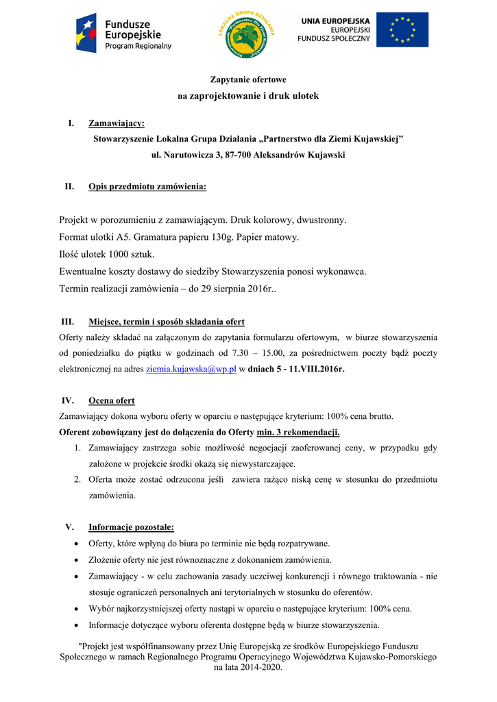 Zapytanie ofertowe na zaprojektowanie i druk ulotek Zamawiający: I. Stowarzyszenie Lokalna Grupa Działania „Partnerstwo dla Ziemi Kujawskiej” ul. Narutowicza 3, 87-700 Aleksandrów Kujawski II. Opis przedmiotu zamówienia: Projekt w porozumieniu z zamawiającym. Druk kolorowy, dwustronny. Format ulotki A5. Gramatura papieru 130g. Papier matowy. Ilość ulotek 1000 sztuk. Ewentualne koszty dostawy do siedziby Stowarzyszenia ponosi wykonawca. Termin realizacji zamówienia – do 29 sierpnia 2016r.. III. Miejsce, termin i sposób składania ofert Oferty należy składać na załączonym do zapytania formularzu ofertowym, w biurze stowarzyszenia od poniedziałku do piątku w godzinach od 7.30 – 15.00, za pośrednictwem poczty bądź poczty elektronicznej na adres [email protected] w dniach 5 - 11.VIII.2016r. IV. Ocena ofert Zamawiający dokona wyboru oferty w oparciu o następujące kryterium: 100% cena brutto. Oferent zobowiązany jest do dołączenia do Oferty min. 3 rekomendacji. 1. Zamawiający zastrzega sobie możliwość negocjacji zaoferowanej ceny, w przypadku gdy założone w projekcie środki okażą się niewystarczające. 2. Oferta może zostać odrzucona jeśli zawiera rażąco niską cenę w stosunku do przedmiotu zamówienia. Informacje pozostałe: V. Oferty, które wpłyną do biura po terminie nie będą rozpatrywane. Złożenie oferty nie jest równoznaczne z dokonaniem zamówienia. Zamawiający - w celu zachowania zasady uczciwej konkurencji i równego traktowania - nie stosuje ograniczeń personalnych ani terytorialnych w stosunku do oferentów. Wybór najkorzystniejszej oferty nastąpi w oparciu o następujące kryterium: 100% cena. Informacje dotyczące wyboru oferenta dostępne będą w biurze stowarzyszenia. "Projekt jest współfinansowany przez Unię Europejską ze środków Europejskiego Funduszu Społecznego w ramach Regionalnego Programu Operacyjnego Województwa Kujawsko-Pomorskiego na lata 2014-2020. Załącznik nr 1 do zapytania ofertowego Formularz ofertowy ……………………………................... (miejscowość, data) …………………………….. (pieczęć oferenta) Zamawiający: Stowarzyszenie LGD „Partnerstwo dla Ziemi Kujawskiej” OFERTA Na zaprojektowanie i druk ulotek Dane dotyczące oferenta: Nazwa...................................................................................................................................... Siedziba................................................................................................................................... Nr telefonu/faksu..................................................................................................................... NIP: …………………………………………………………………………….................... Oferujemy realizację zamówienia zgodnie z Zapytaniem Ofertowym za kwotę: netto: ............................................. zł (słownie ……………........................................... zł), brutto: ............................................. zł (słownie …..........................................………… zł), w tym podatek VAT w wysokości: .............% tj. ........................................................... zł. "Projekt jest współfinansowany przez Unię Europejską ze środków Europejskiego Funduszu Społecznego w ramach Regionalnego Programu Operacyjnego Województwa Kujawsko-Pomorskiego na lata 2014-2020. Oświadczamy, że oferowana cena za całość zamówienia zawiera wszystkie koszty związane z realizacją przedmiotu zamówienia. Oświadczamy, że zapoznaliśmy się z treścią zapytania i nie wnosimy do niej zastrzeżeń. Oświadczamy, że posiadamy niezbędną wiedzę i doświadczenie oraz dysponujemy potencjałem technicznym i osobami zdolnymi do wykonania zamówienia. Oświadczamy, że znajdujemy się w sytuacji ekonomicznej i finansowej zapewniającej wykonanie zamówienia. ………………………………………….. (podpis upoważnionego przedstawiciela oferenta) "Projekt jest współfinansowany przez Unię Europejską ze środków Europejskiego Funduszu Społecznego w ramach Regionalnego Programu Operacyjnego Województwa Kujawsko-Pomorskiego na lata 2014-2020.