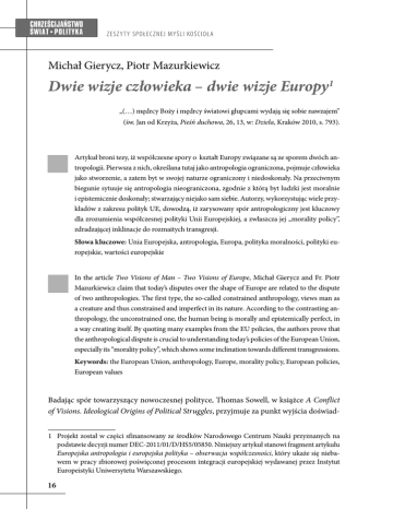 CHRZEÂCIJA¡STWO ÂWIAT•POLITYKA ZESZ Y T Y S P O ŁEC Z NEJ MYŚ L I KO Ś C IO ŁA Michał Gierycz, Piotr Mazurkiewicz Dwie wizje człowieka – dwie wizje Europy1 „(…) mędrcy Boży i mędrcy światowi głupcami wydają się sobie nawzajem” (św. Jan od Krzyża, Pieśń duchowa, 26, 13, w: Dzieła, Kraków 2010, s. 793). Artykuł broni tezy, iż współczesne spory o kształt Europy związane są ze sporem dwóch antropologii. Pierwsza z nich, określana tutaj jako antropologia ograniczona, pojmuje człowieka jako stworzenie, a zatem byt w swojej naturze ograniczony i niedoskonały. Na przeciwnym biegunie sytuuje się antropologia nieograniczona, zgodnie z którą byt ludzki jest moralnie i epistemicznie doskonały; stwarzający niejako sam siebie. Autorzy, wykorzystując wiele przykładów z zakresu polityk UE, dowodzą, iż zarysowany spór antropologiczny jest kluczowy dla zrozumienia współczesnej polityki Unii Europejskiej, a zwłaszcza jej „morality policy”, zdradzającej inklinacje do rozmaitych transgresji. Słowa kluczowe: Unia Europejska, antropologia, Europa, polityka moralności, polityki europejskie, wartości europejskie In the article Two Visions of Man – Two Visions of Europe, Michał Gierycz and Fr. Piotr Mazurkiewicz claim that today’s disputes over the shape of Europe are related to the dispute of two anthropologies. The first type, the so-called constrained anthropology, views man as a creature and thus constrained and imperfect in its nature. According to the contrasting anthropology, the unconstrained one, the human being is morally and epistemically perfect, in a way creating itself. By quoting many examples from the EU policies, the authors prove that the anthropological dispute is crucial to understanding today’s policies of the European Union, especially its “morality policy”, which shows some inclination towards different transgressions. Keywords: the European Union, anthropology, Europe, morality policy, European policies, European values Badając spór towarzyszący nowoczesnej polityce, Thomas Sowell, w książce A Conflict of Visions. Ideological Origins of Political Struggles, przyjmuje za punkt wyjścia doświad1 P rojekt został w części sfinansowany ze środków Narodowego Centrum Nauki przyznanych na podstawie decyzji numer DEC-2011/01/D/HS5/05850. Niniejszy artykuł stanowi fragment artykułu Europejska antropologia i europejska polityka – obserwacja współczesności, który ukaże się niebawem w pracy zbiorowej poświęconej procesom integracji europejskiej wydawanej przez Instytut Europeistyki Uniwersytetu Warszawskiego. 16 CHRZEÂCIJA¡STWO Z ES Z Y T Y S P O ŁEC Z NEJ MYŚLI KO ŚC I O Ł A ÂWIAT•POLITYKA czenie dwóch rewolucji: amerykańskiej i francuskiej2. Pierwsza zaowocowała zaprowadzeniem rządu ograniczonego, odnoszącego się z szacunkiem do obecności religii w sferze publicznej, druga zorganizowała państwowy terror w imię demokracji, połączony z otwartą wojną przeciwko chrześcijaństwu. Skąd bierze się różnica? Zdaniem Sowella, ma ona źródło w dwóch diametralnie różnych wizjach metapolitycznych, rozumianych jako typy idealne w sensie weberowskim: ograniczonej i nieograniczonej3. Od strony funkcjonalnej różnica zasadza się na odmiennym pojmowaniu dwóch kluczowych kryteriów: umiejscowienia źródła decyzji (locus of discretion) oraz sposobu ich realizacji (mode of discretion)4. Pierwsza nakierowana jest na próbę uzgodnienia stojących w konflikcie interesów i przekonań na temat tego, co może być uznane za dobro społeczne, podczas gdy druga ukierunkowana jest na implementację poznawalnego i możliwego do zidentyfikowania dobra społecznego – wartości najwyższej (na przykład, marksistowskiego ideału społeczeństwa bezklasowego)5. Pierwsza, odwołując się do intuicji, że cywilizacja jest jedynie cienką warstwą nałożoną na pokłady barbarzyństwa, postrzega politykę jako codzienne pokorne działanie na rzecz uchronienia świata przed katastrofą. Dobrze oddają to słowa Roberta Spaemanna: „Opóźnianie końca jest podstawową strukturą wszelkiej ludzkiej polityki. (…) Polityka jest czujnym trzymaniem w szachu tendencji, które sprzyjają wybuchowi «pierwotnego chaosu»”6. Druga, inspirując się oświeceniowym optymizmem postrzega politykę, jako narzędzie nieustannego postępu; w prometejskim porywie pragnie zbudować raj na ziemi. Zwolennicy wizji nieograniczonej uważają, że każdy problem społeczny może zostać racjonalnie rozwiązany, jeśli tylko rozum i cnota zatriumfuje nad ignorancją i nikczemnością7. Definitywne rozwiązanie (final solution) ma na ogół charakter technokratyczny, wymaga gruntownej przebudowy instytucji społecznych i politycznych, nie rodzi natomiast zapotrzebowania – co zostanie wyjaśnione poniżej – na indywidualne cnoty obywateli8. Idealne społeczeń- 2 T . Sowell, A Conflict of Visions. Ideological Origins of Political Struggles, New York 2007. 3 W debacie na ten temat przywoływane są także inne argumenty. Hannah Arendt, na przykład, wskazuje na brak „kwestii społecznej” w Ameryce oraz na fakt, że generalnie rewolucja odtwarza ustrój przedrewolucyjny. Po brytyjskim rządzie ograniczonym następuje rząd ograniczony, a po francuskiej monarchii absolutnej – absolutyzm. 4 T. Sowell, A Conflict of Visions. Ideological Origins of Political Struggles, dz. cyt., s. 106. 5 Por. V. Vanberg, Conflict of Visions. Thomas Sowell, „Cato Journal”, Vol. 7, No. 2 (Fall 1987), s. 547. 6 R . Spaemann, Kroki poza siebie. Przemówienia i eseje I, Warszawa 2012, s. 275. 7 P or. I. Berlin, Cztery eseje o wolności, Poznań 2000, s. 67. 8 W warstwie leksykalnej często używane są słowa takie, jak: wykorzenienie, wyplenienie, likwidacja, ostateczne rozwiązanie. 17 CHRZEÂCIJA¡STWO ÂWIAT•POLITYKA ZESZ Y T Y S P O ŁEC Z NEJ MYŚ L I KO Ś C IO ŁA stwo oparte będzie na biurokracji9. Zbawienie „socjolog