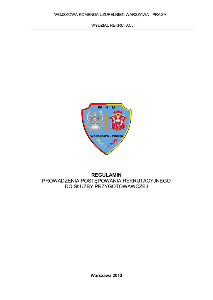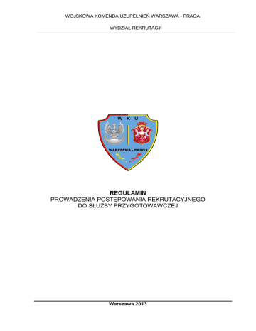 WOJSKOWA KOMENDA UZUPEŁNIEŃ WARSZAWA - PRAGA WYDZIAŁ REKRUTACJI REGULAMIN PROWADZENIA POSTĘPOWANIA REKRUTACYJNEGO DO SŁUŻBY PRZYGOTOWAWCZEJ Warszawa 2013 Spis treści: I. PODSTAWY PRAWNE ........................................................................................ 3 II. WARUNKI I TRYB POWOŁYWANIA OCHOTNIKÓW DO SŁUŻBY PRZYGOTOWAWCZEJ ............................................................................................. 3 1. WARUNKI FORMALNE .......................................................................................................... 3 2. SZCZEGÓŁOWE ETAPY POSTĘPOWANIA .................................................................... 5 2.1. ETAP 1 - postępowanie przygotowawcze .......................................................... 5 2.2. ETAP 2 – postępowanie kwalifikacyjne .............................................................. 5 2.3. ETAP 3 – postępowanie rekrutacyjne................................................................. 6 2.4. SYSTEM PUNKTOWY OCENIANIA POSZCZEGÓLNYCH ELEMENTÓW POSTĘPOWANIA REKRUTACYJNEGO: ...................................................................... 7 Tabela 1. Elementy postępowania podlegające ocenie .................................................. 7 Tabela 2. Punktacja wyników nauczania ........................................................................ 7 Tabela 3. Punktacja preferencji w zakresie wykształcenia .............................................. 8 Tabela 4. Punktacja ocen z wychowania fizycznego ...................................................... 9 Tabela 5. Punktacja preferencji w zakresie sprawności fizycznej ................................... 9 Tabela 6. Punktacja predyspozycji ochotnika do pełnienia służby przygotowawczej .....10 Tabela 7. Punktacja motywacji ochotnika do pełnienia służby przygotowawczej ...........11 - czas oczekiwania na powołanie do służby przygotowawczej Załącznik nr 1 - Kwestionariusz z przeprowadzonego postępowania rekrutacyjnego ... 13 2 I. PODSTAWY PRAWNE Powołanie do pełnienia służby przygotowawczej prowadzi się na postawie następujących aktów normatywnych: art. 98a do 98f, ustawy z dnia 21 listopada 1967 roku o powszechnym obowiązku obrony Rzeczypospolitej Polskiej (Dz. U. z 2004 r. Nr 241, poz. 2416 z późn. zm.); Rozporządzenie Ministra Obrony Narodowej z dnia 6 września 2010 roku w sprawie służby przygotowawczej (Dz. U. Nr 170 poz. 1144 z późn. zm.); Rozkaz Szefa przedsięwzięć Sztabu Generalnego organizacyjnych Wojska Polskiego, zapewniających w realizację sprawie procesu uruchomienia i funkcjonowania służby przygotowawczej, w określonym roku kalendarzowym (wydawany corocznie); Rozkaz Szefa Inspektoratu Wsparcia Sił Zbrojnych, w sprawie przedsięwzięć organizacyjnych zapewniających realizację procesu uruchomienia i funkcjonowania służby przygotowawczej, w określonym roku kalendarzowym (wydawany corocznie); Rozkaz Szefa Wojewódzkiego Sztabu Wojskowego w Warszawie, w sprawie przedsięwzięć organizacyjnych zapewniających realizację procesu uruchomienia i funkcjonowania służby przygotowawczej w określonym roku kalendarzowym (wydawany corocznie); Rozkaz Wojskowego Komendanta Uzupełnień Warszawa - Praga, w sprawie przedsięwzięć organizacyjnych zapewniających realizację procesu uruchomienia i funkcjonowania służby przygotowawczej w określonym roku kalendarzowym (wydawany corocznie). II. WARUNKI I ETAPY POWOŁYWANIA OCHOTNIKÓW DO SŁUŻBY PRZYGOTOWAWCZEJ 1. WARUNKI FORMALNE O powołanie do pełnienia służby przygotowawczej może ubiegać się osoba spełniająca określone w art. 98a ustawy z dnia 21 listopada 1967 r. o powszechnym obowiązku obrony RP warunki: 3 niekarana za przestępstwo umyślne; posiadająca obywatelstwo polskie; posiadająca zdolność fizyczną i psychiczną do pełnienia czynnej służby wojskowej; w wieku, co najmniej osiemnastu lat; posiadająca wykształcenie, (co najmniej wyższe - w przypadku kształcenia na potrzeby korpusu oficerów; co najmniej średnie - w przypadku kształcenia na potrzeby korpusu podoficerów, co najmniej gimnazjalne - w przypadku kształcenia na potrzeby korpusu szeregowych). Osoba ubiegająca się o powołanie do służby przygotowawczej składa wniosek bezpośrednio do wojskowego komendanta uzupełnień. Do wniosku załącza się następujące dokumenty: 1) odpis świadectwa ukończenia gimnazjum, szkoły średniej lub dyplomu ukończenia studiów wyższych - w zależności od korpusu, na którego potrzeby będzie prowadzone kształcenie; 2) życiorys; 3) odpis skrócony aktu urodzenia; 4) informację o osobie z Krajowego Rejestru Karnego; 5) inne dokumenty mogące mieć wpływ na powołanie do służby przygotowawczej, w szczególności potwierdzające posiadane kwalifikacje, w tym certyfikaty językowe, prawo jazdy, świadectwa ukończenia szkół, kursów lub uzyskania specjalizacji zawodowych, zaświadczenia o prawie wykonywania zawodu. W przypadku osoby będącej studentem szkoły wyższej i ubiegającej się o powołanie do służby przygotowawczej pełnionej w kilku okresach do wniosku załącza się również zaświadczenie szkoły wyższej. 4 2. SZCZEGÓŁOWE ETAPY POSTĘPOWANIA 2.1. ETAP 1 - postępowanie przygotowawcze, obejmuje: analizę dokumentów złożonych przez ochotnika oraz danych zawartych w ewidencji wojskowej w zakresie ich zgodności z wymogami prawa; przeprowadzenie rozmowy wstępnej mającej na celu poinformowanie ochotnika o warunkach pełnienia służby przygotowawczej, uprawnieniach żołnierza oraz przeznaczeniu służby przygotowawczej. Ponadto na podstawie rozmowy oceniana jest motywacja i zaangażowanie kandydata do pełnienia służby. Ochotnik otrzymuje regulamin kształcenia żołnierzy służby przygotowawczej, zostają mu przedstawione dalsze etapy postępowania rekrutacyjnego; skierowanie do wojskowej komisji lekarskiej w celu wydania orzeczenia o zdolności do pełnienia 
